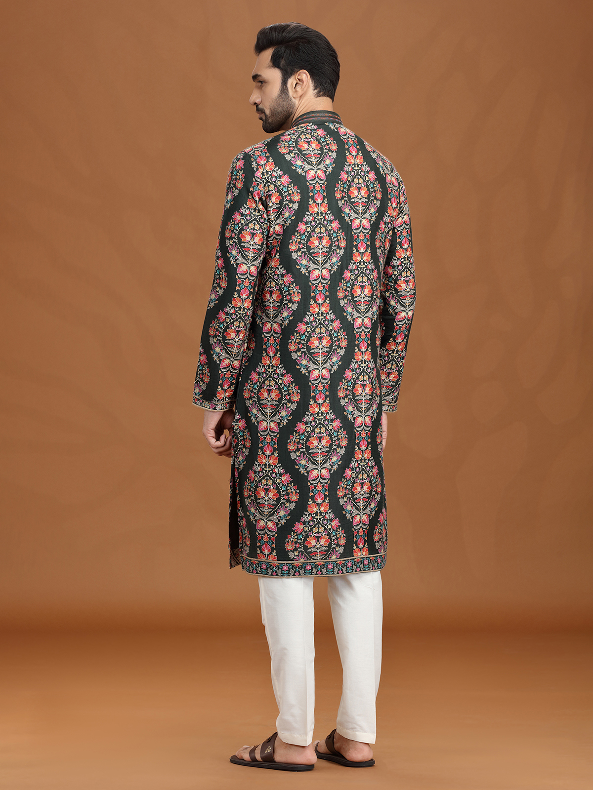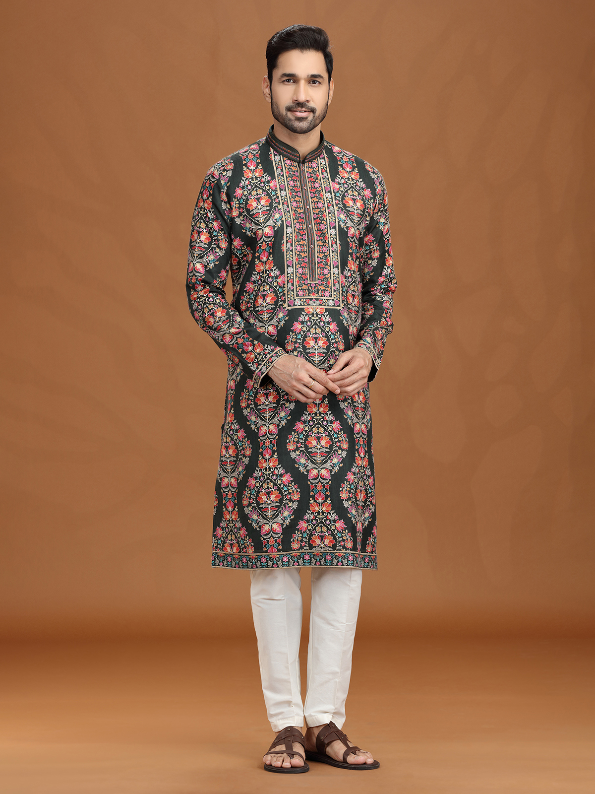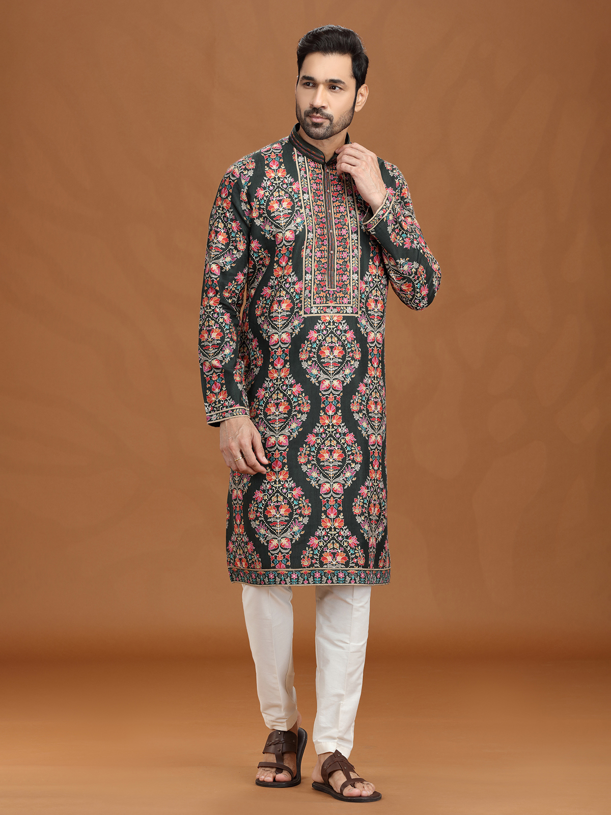 Richly hued in mehendi green, this viscose kurta suit is embellished with resham and sequins motifs that exude festive elegance. A smart stand collar with pant provides sleek balance. Ideal for mehendi ceremonies and celebrations, it combines traditional artistry with modern, comfortable wear.
