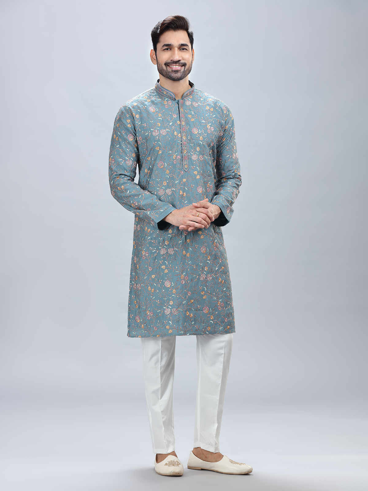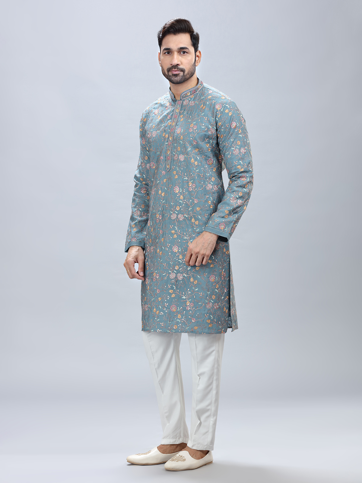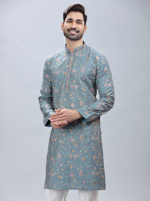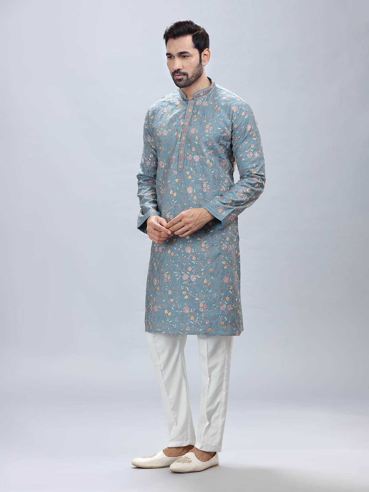 At a social gathering, the mint blue cotton silk kurta suit with traditional embroidery, resham, and sequins looks fantastic. This kurta suit has a mandarin collar and long sleeves. Has a bottom as well.