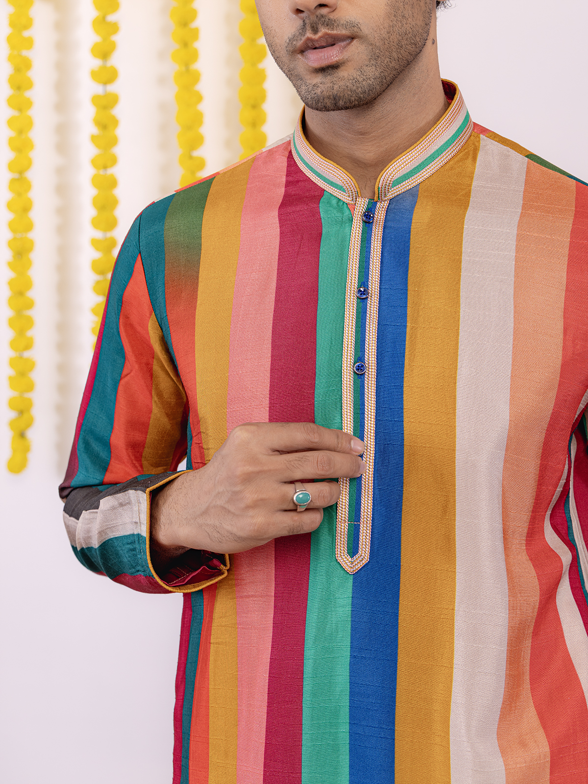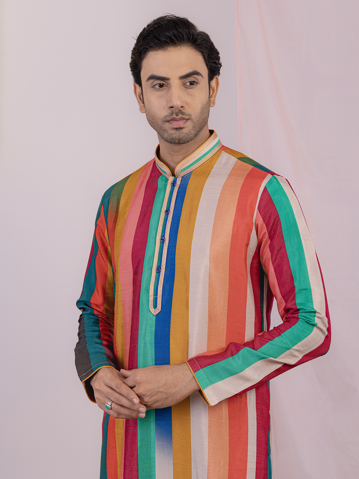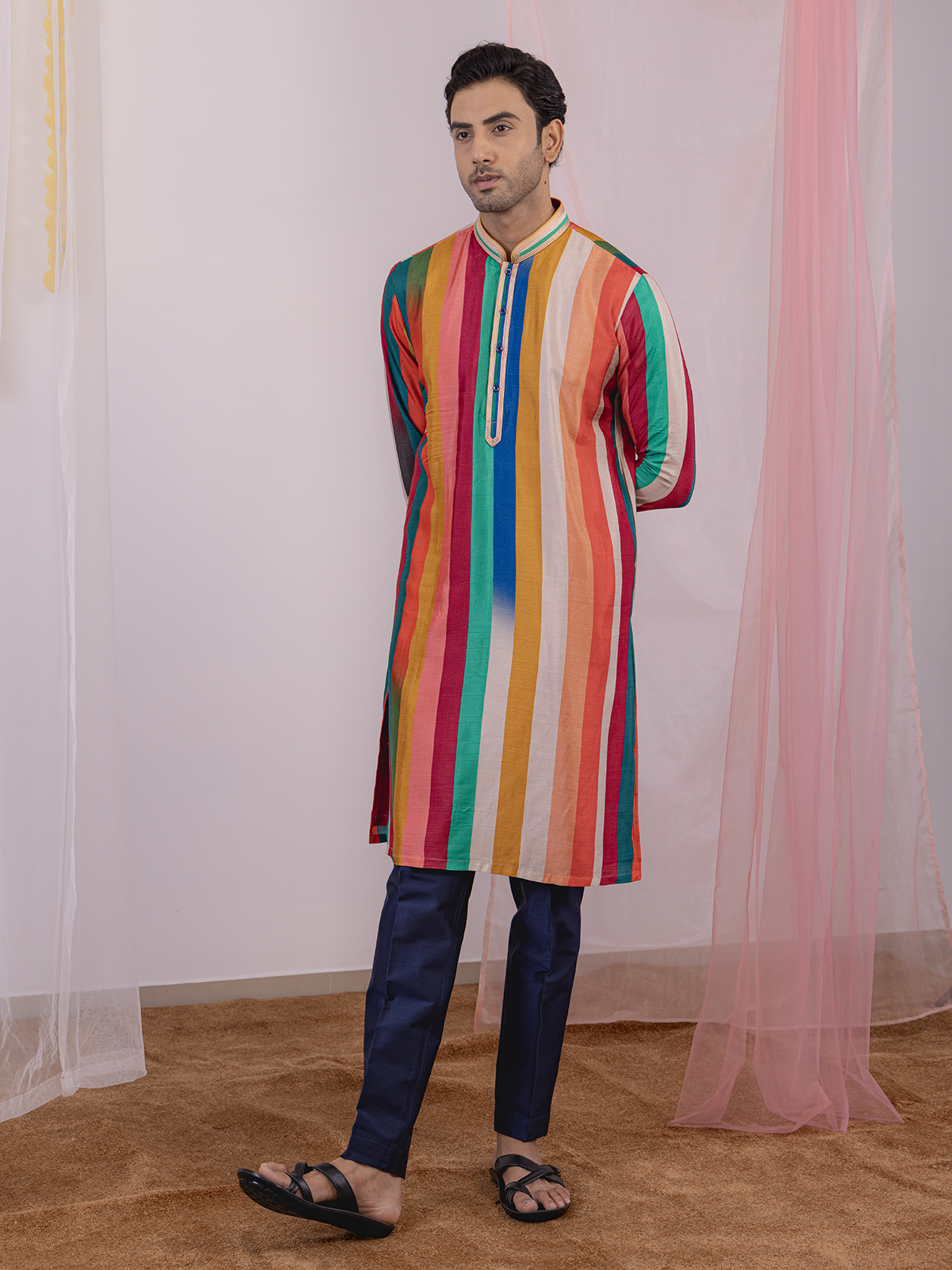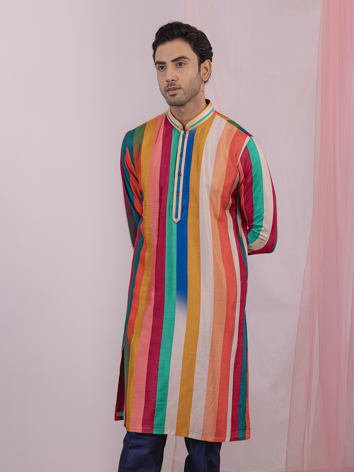 Celebrate festive moments in this multicolor silk kurta suit, featuring a classic stripe print, mandarin collar, half-button placket, and full sleeves. Paired with matching pants, it offers a complete traditional look, blending effortless charm with modern elegance for any festive gathering.