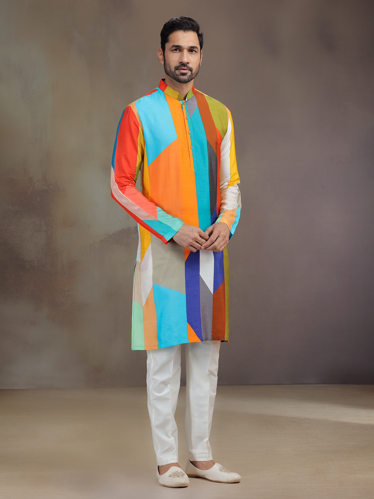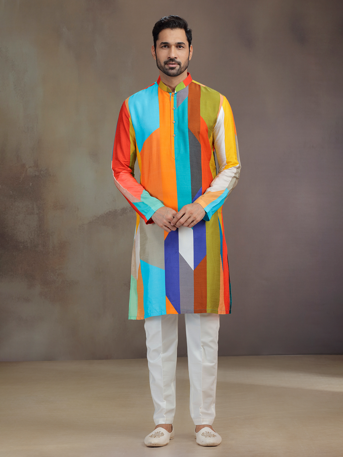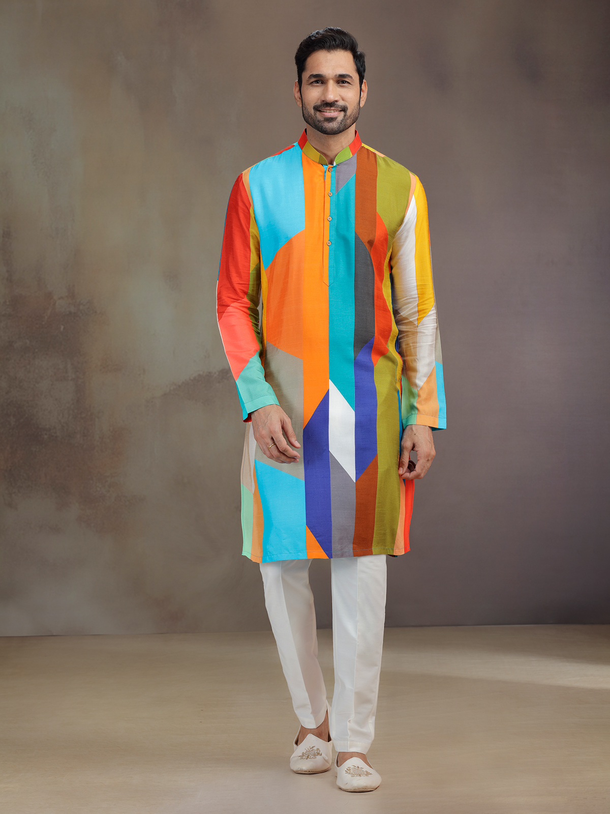 Vivid tones converge in this multicolor silk printed kurta pajama, weaving artistry into tradition. The intricate work enhances its mandarin collar and full sleeves, enriching its charm. Paired with comfortable pants, it becomes a colorful festive attire, celebrating diversity in elegance.