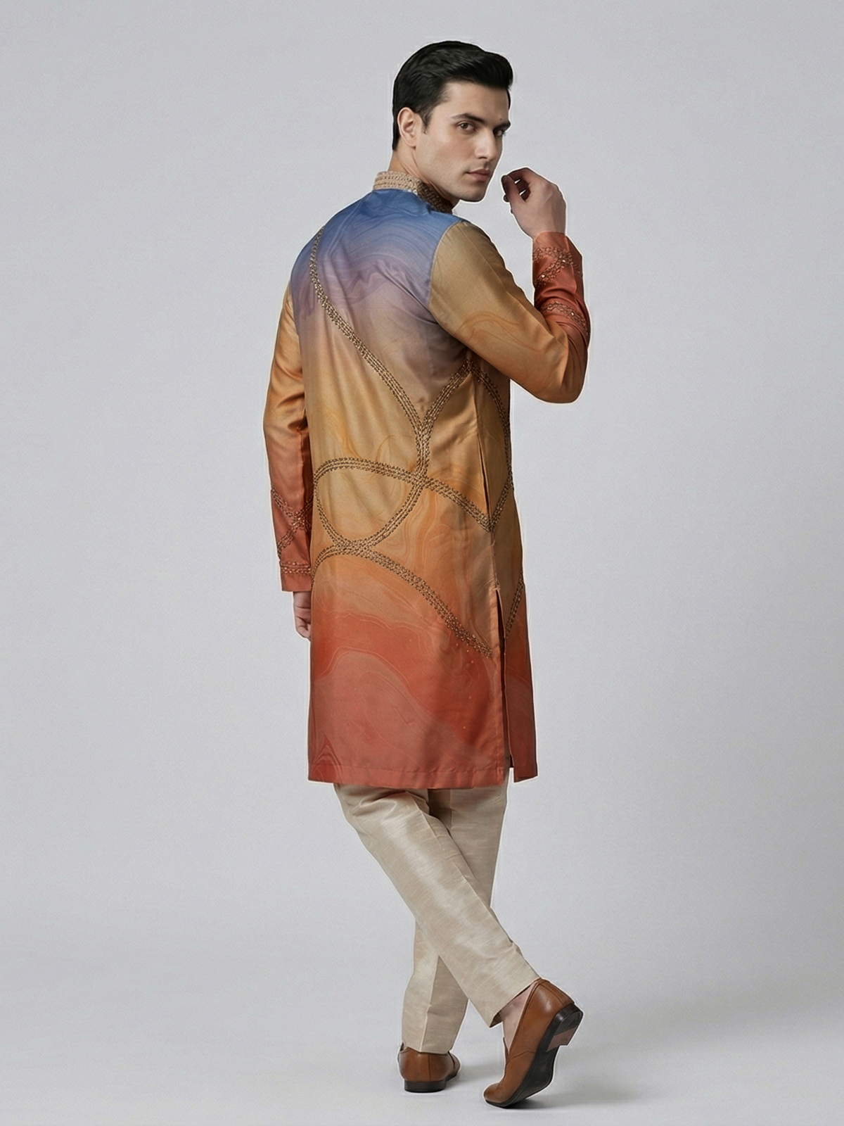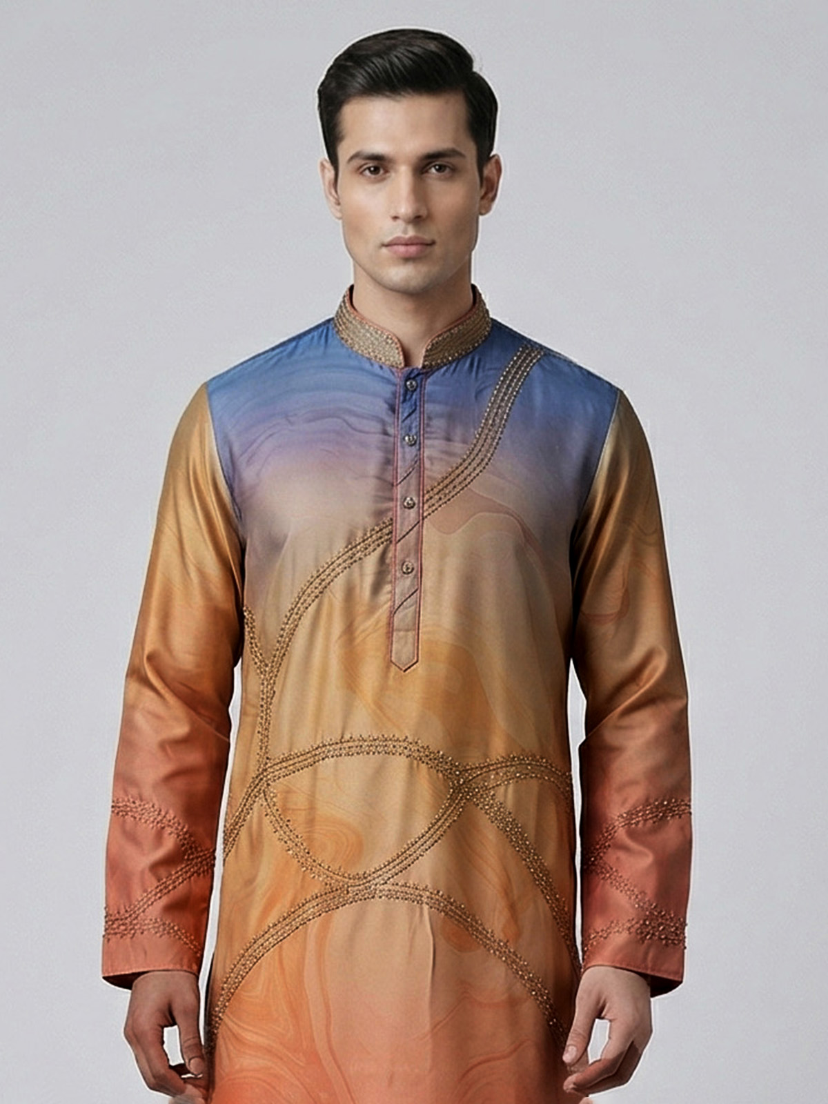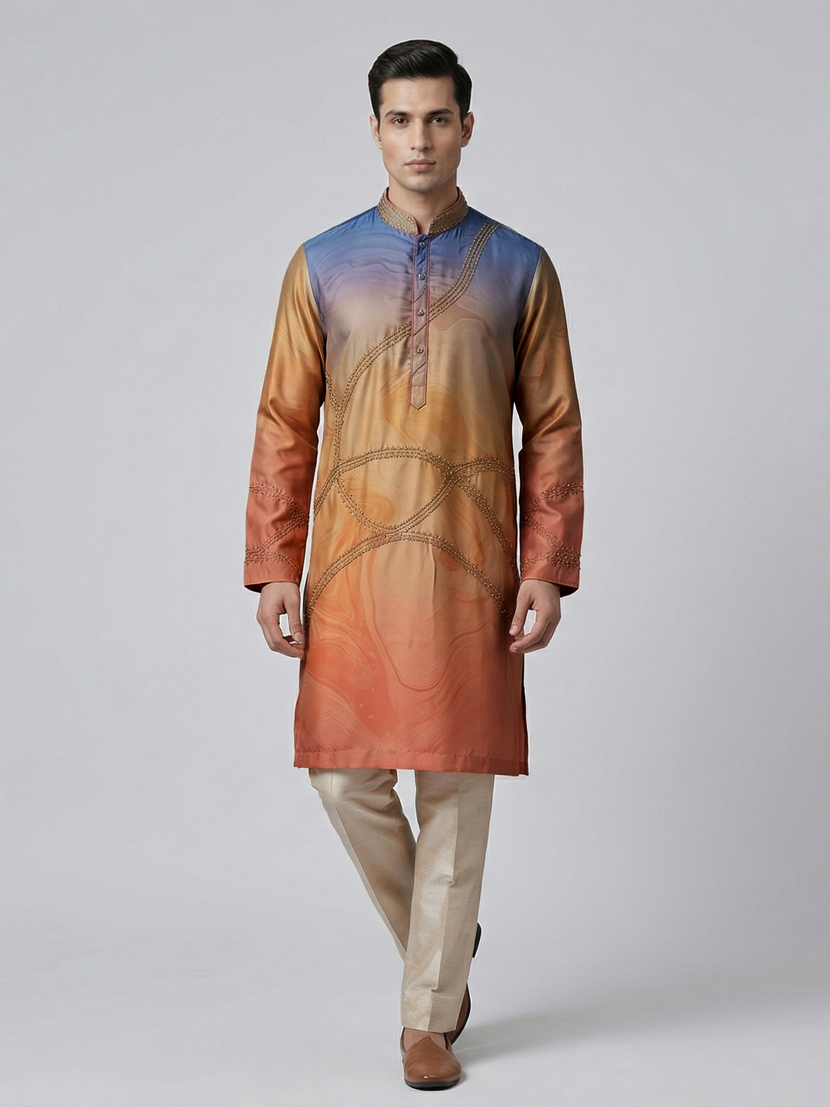 Vibrant multicolor hues bring artistic charm to this silk kurta set designed for festive occasions. Enhanced with printed patterns and thread with sequin work, it reflects lively elegance. The mandarin collar adds structure, while the smooth fabric ensures comfort. Paired with pants, this ensemble offers a bold yet refined festive appeal.