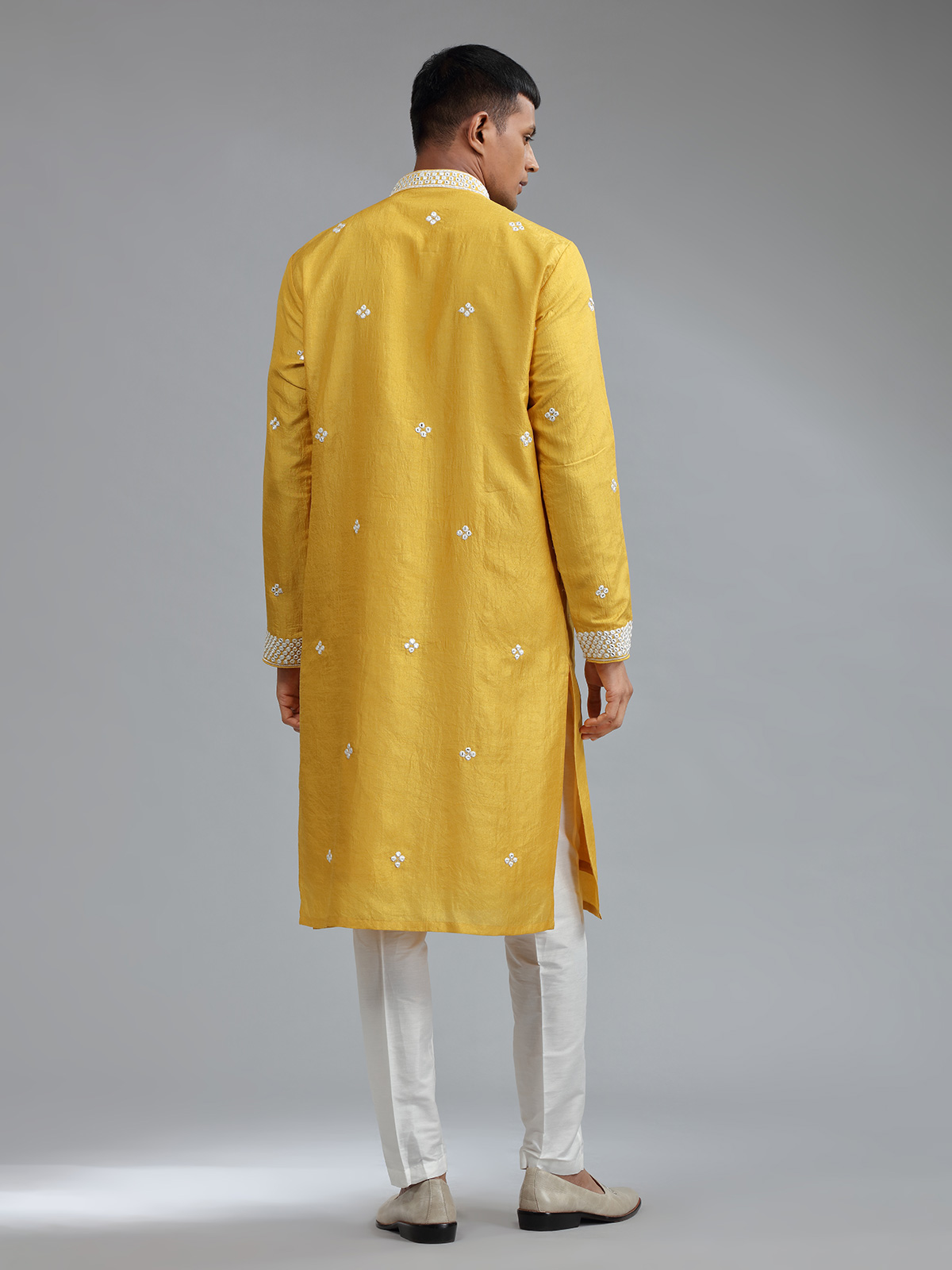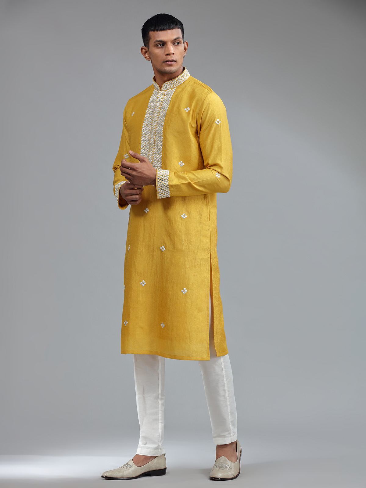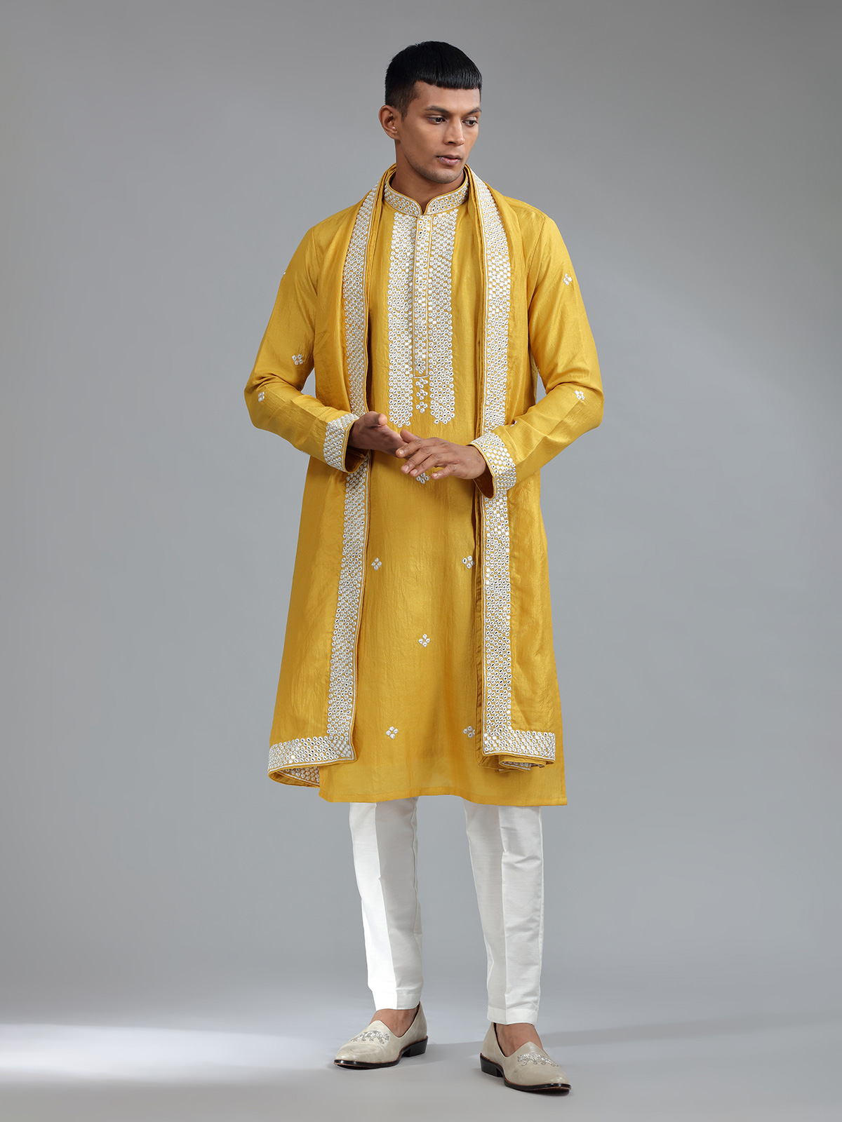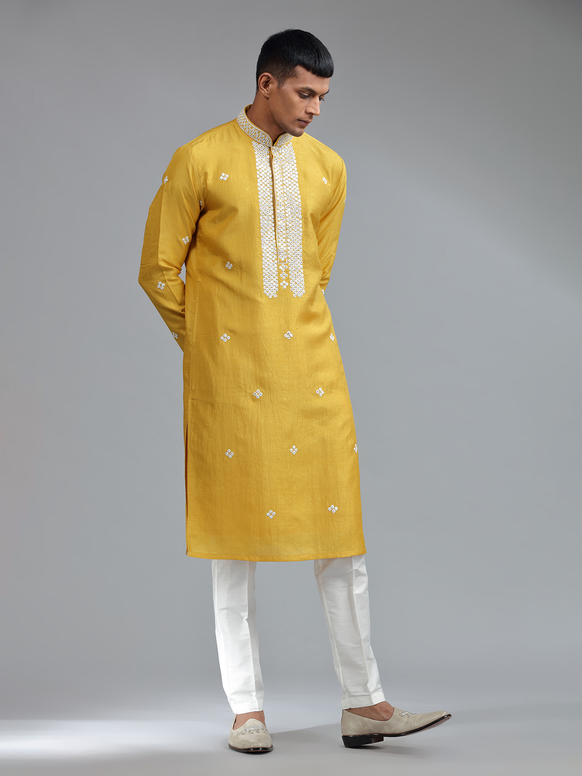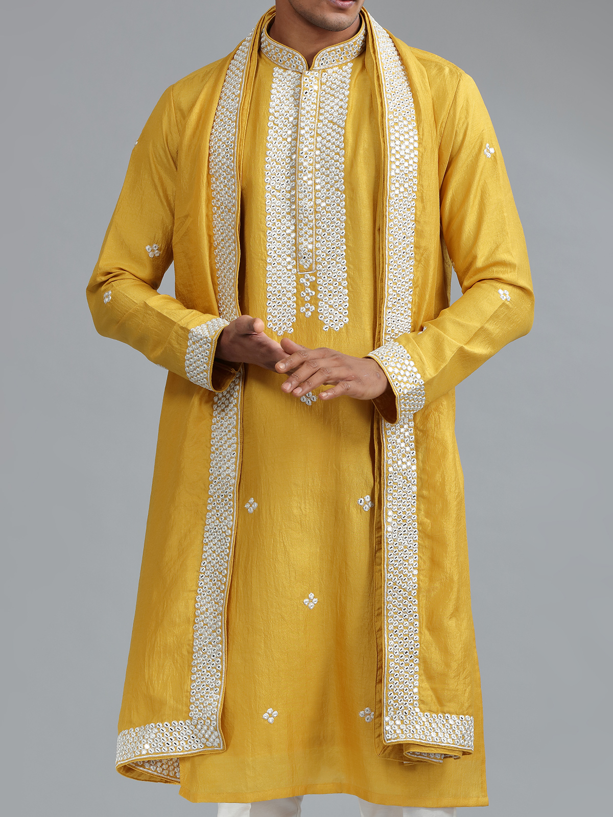 Wearing this georgette kurta suit with mustard hue plus mirror work and resham embroidery is pretty comfy. Features a traditional Mandarin collar and long sleeves for a sophisticated look. Has a bottom included.
