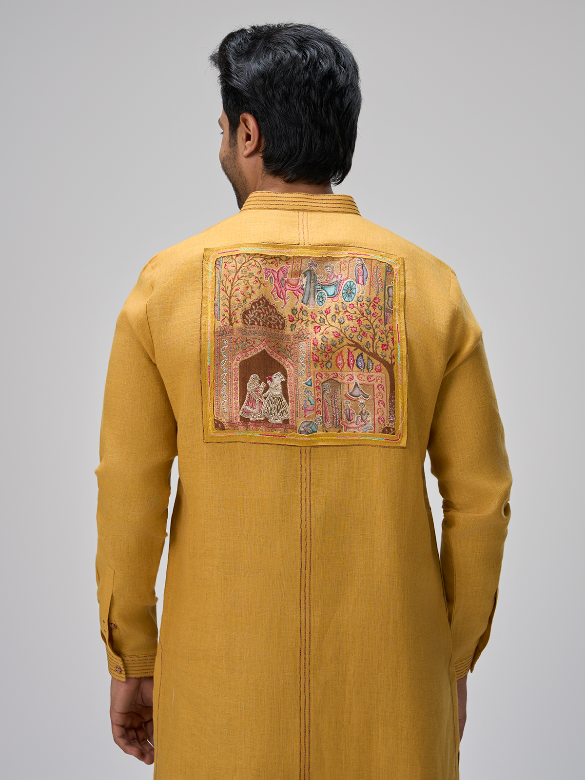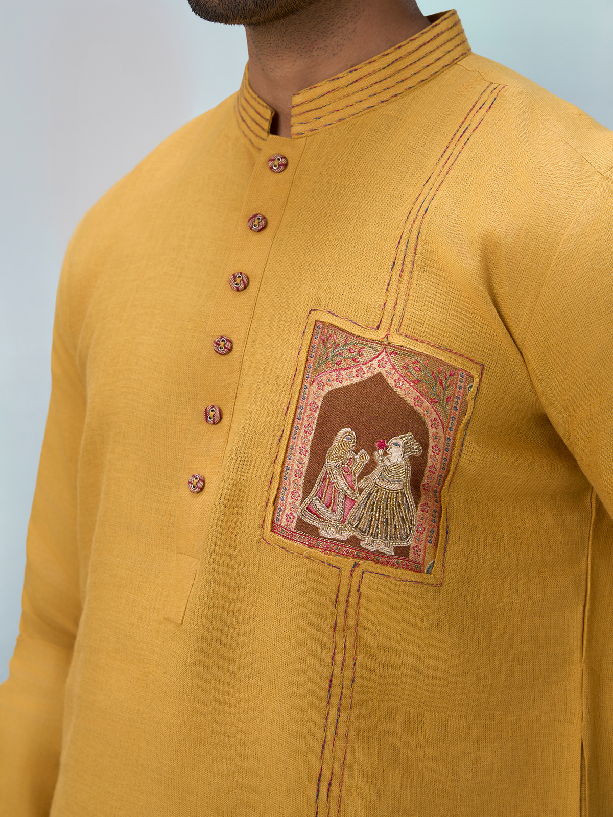This mustard yellow linen kurta showcases cutdana, thread, patch and bead detailing that forms an expressive handcrafted surface. The chinese collar refines its silhouette, making it perfect for haldi, weddings and festive ceremonies. The pant completes the ensemble with smooth comfort and style.