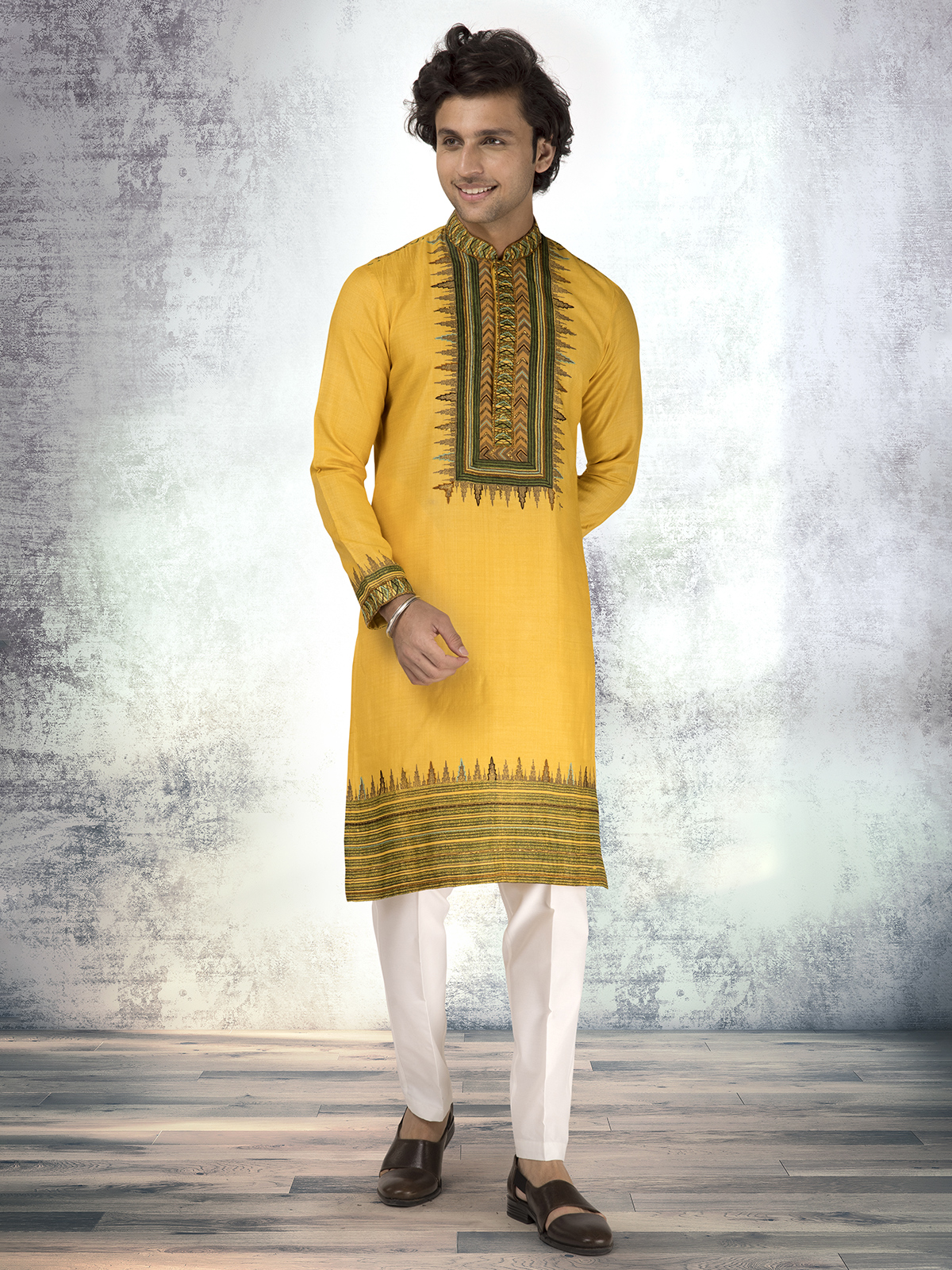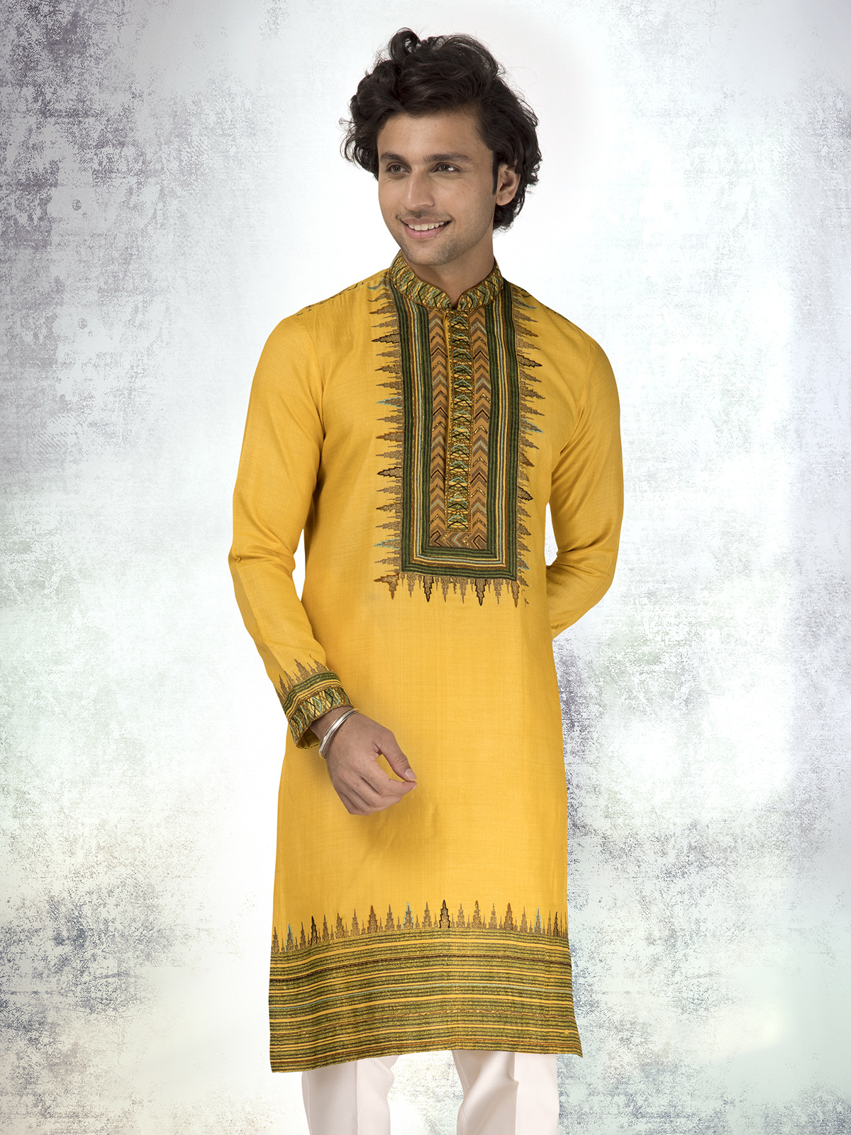 In pure Munga silk, this mustard yellow printed kurta suit reflects delicate thread and resham detailing. The mandarin collar and soft sheen bring festive warmth. Paired with pants, it’s ideal for haldi or cultural ceremonies of grace.
