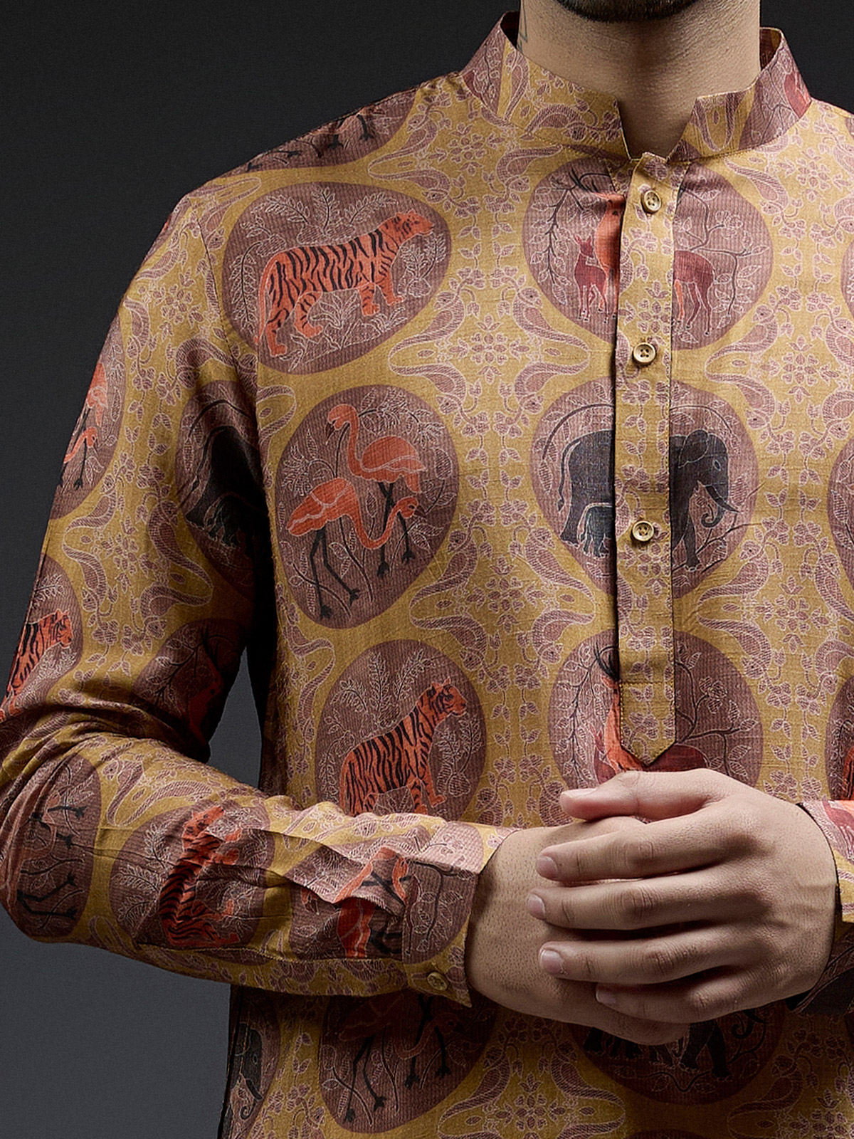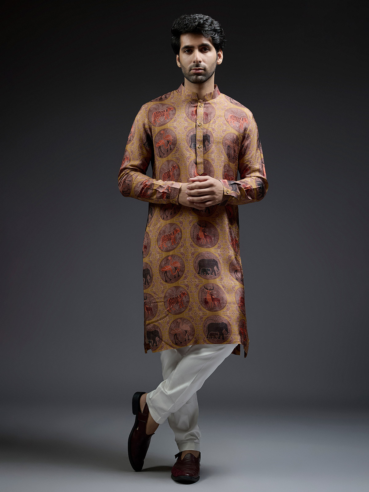 Mustard Yellow And Brown Ajarakh Silk Kurta Suit For Men