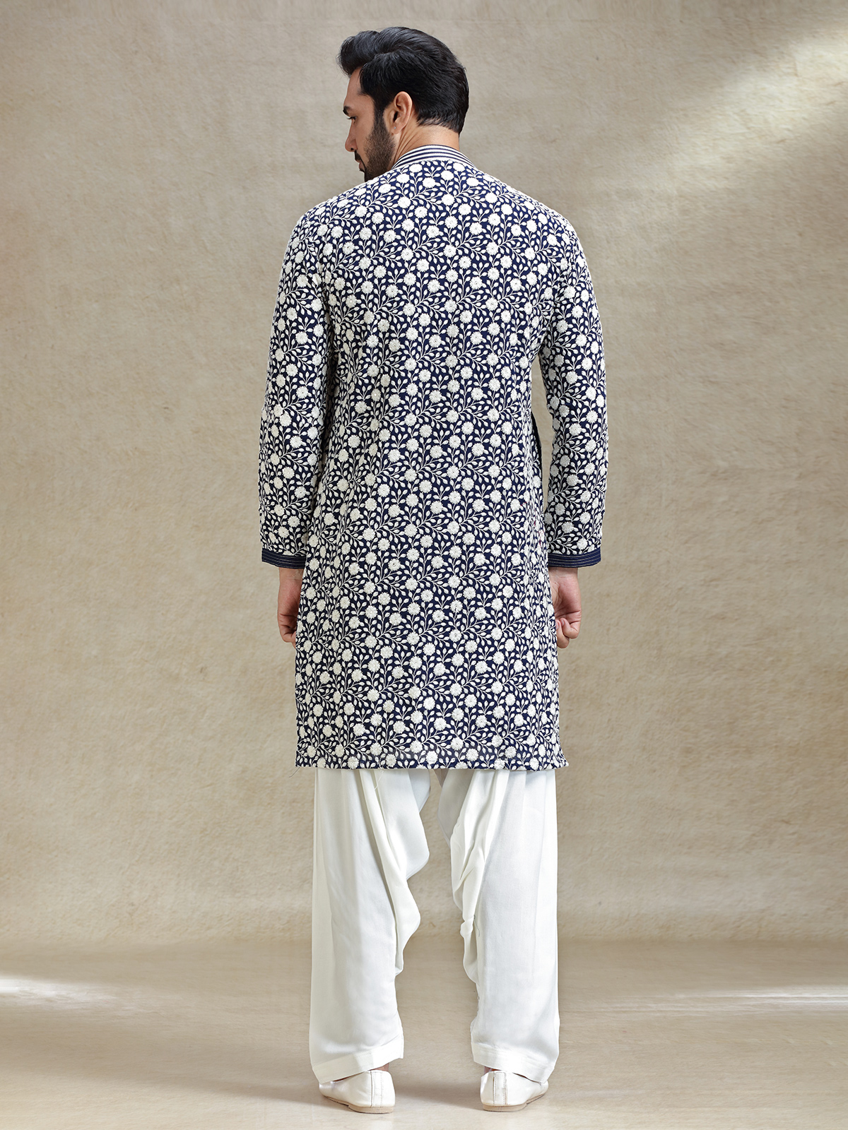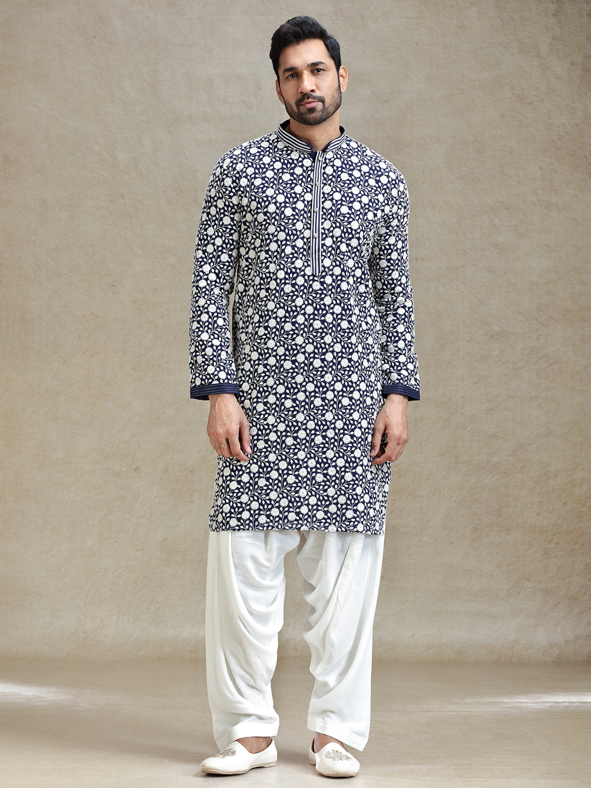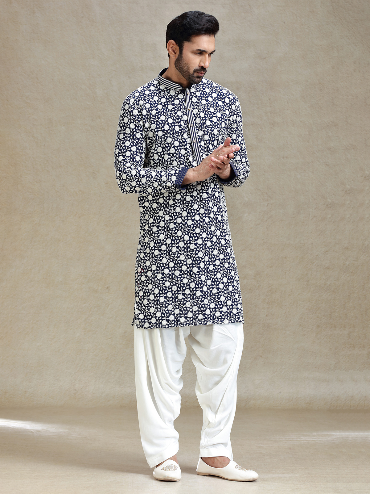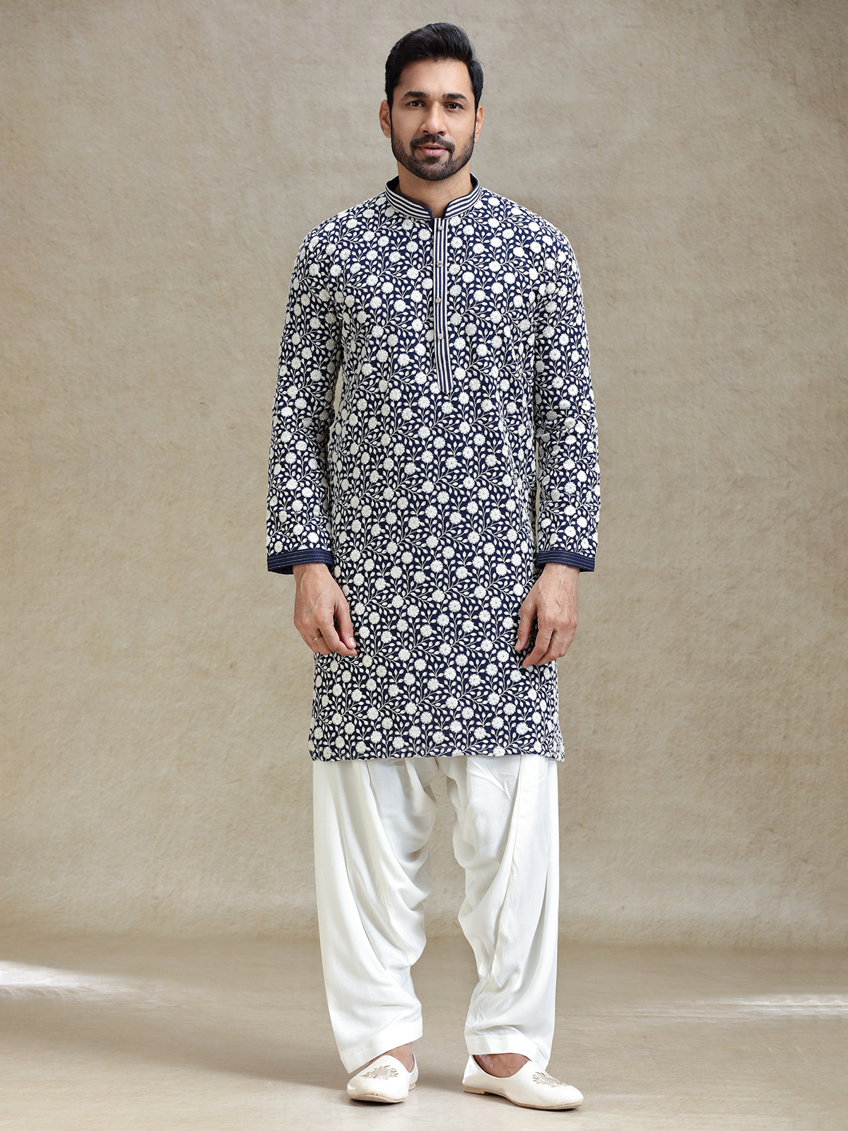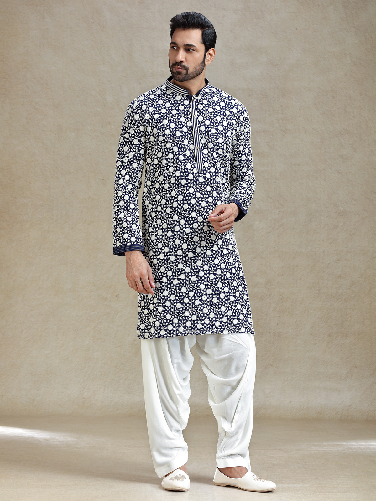 Navy Blue Kurta Salwar In Embroidery For Mens