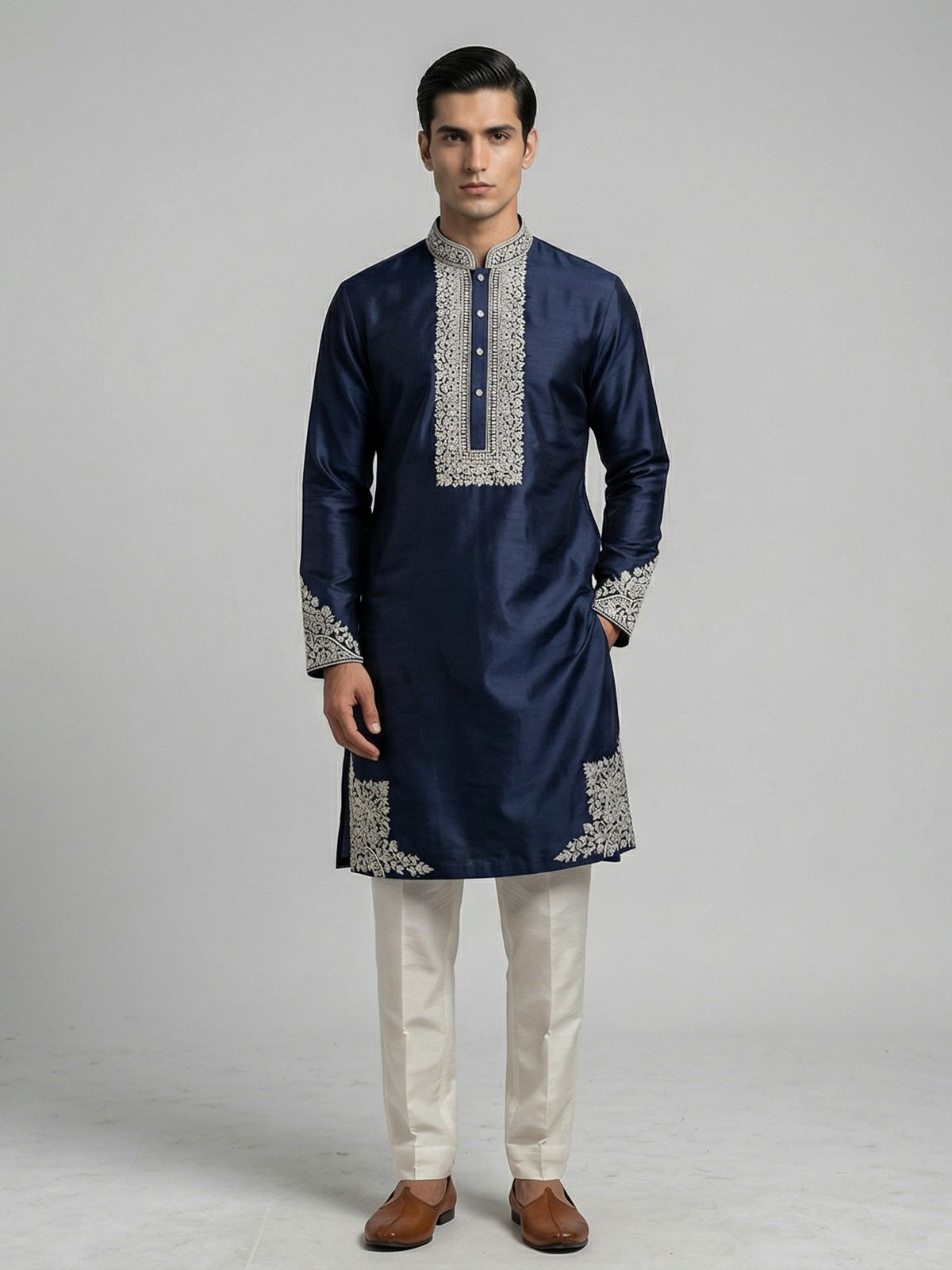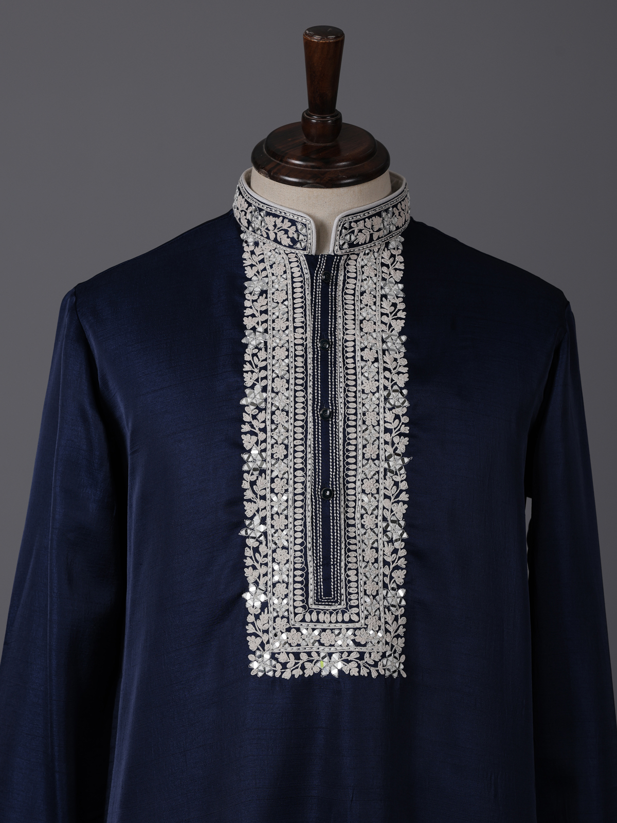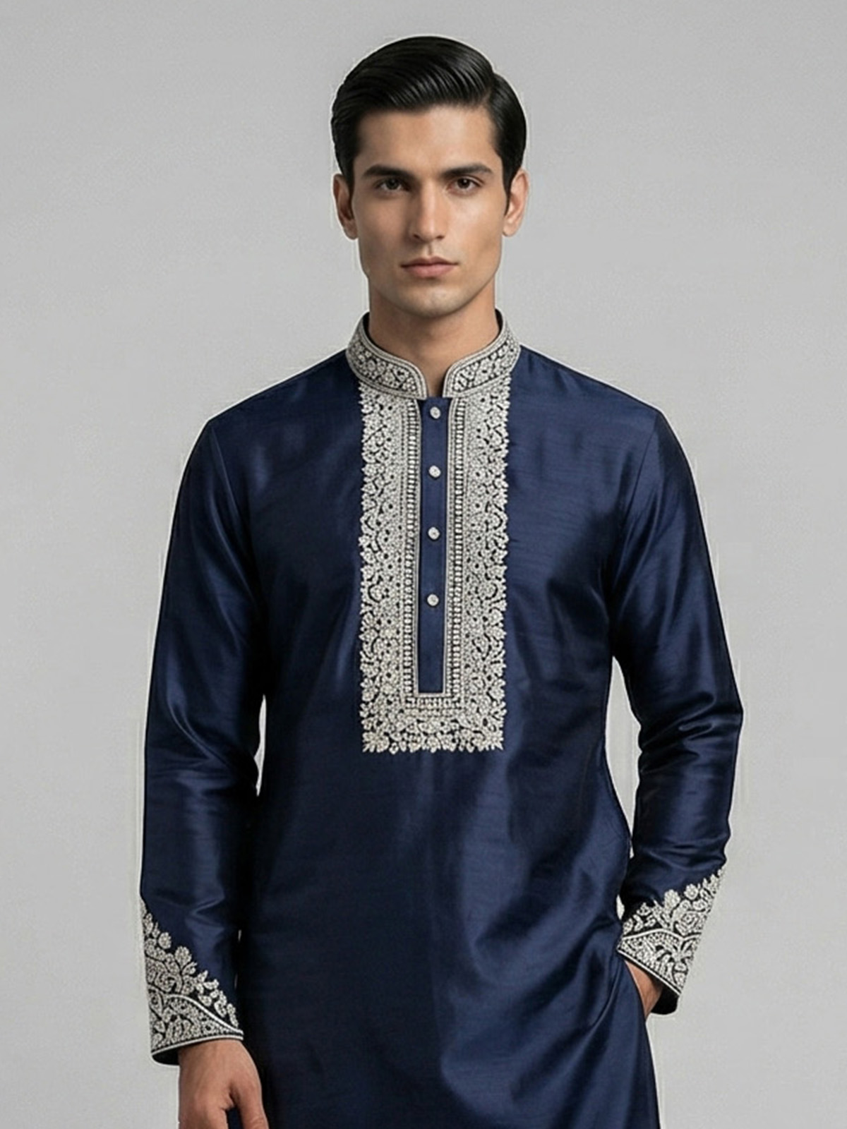 Deep navy blue tones elevate the elegance of this silk kurta set designed for festive sophistication. Adorned with aabla and thread work. It reflects refined detailing. The mandarin collar enhances its structured silhouette, while the smooth fabric ensures comfort. Paired with pants, this ensemble creates a timeless and polished ethnic look.