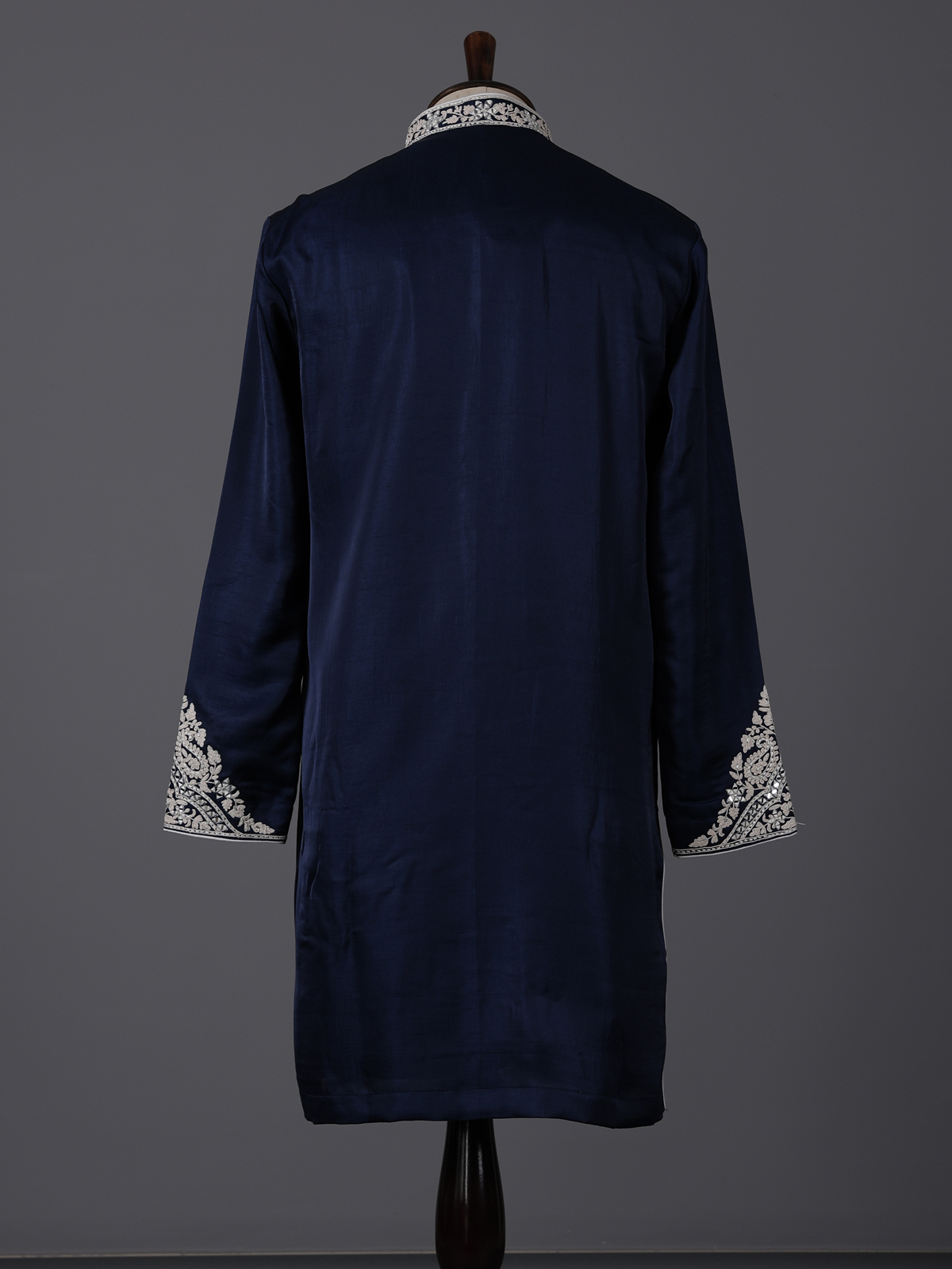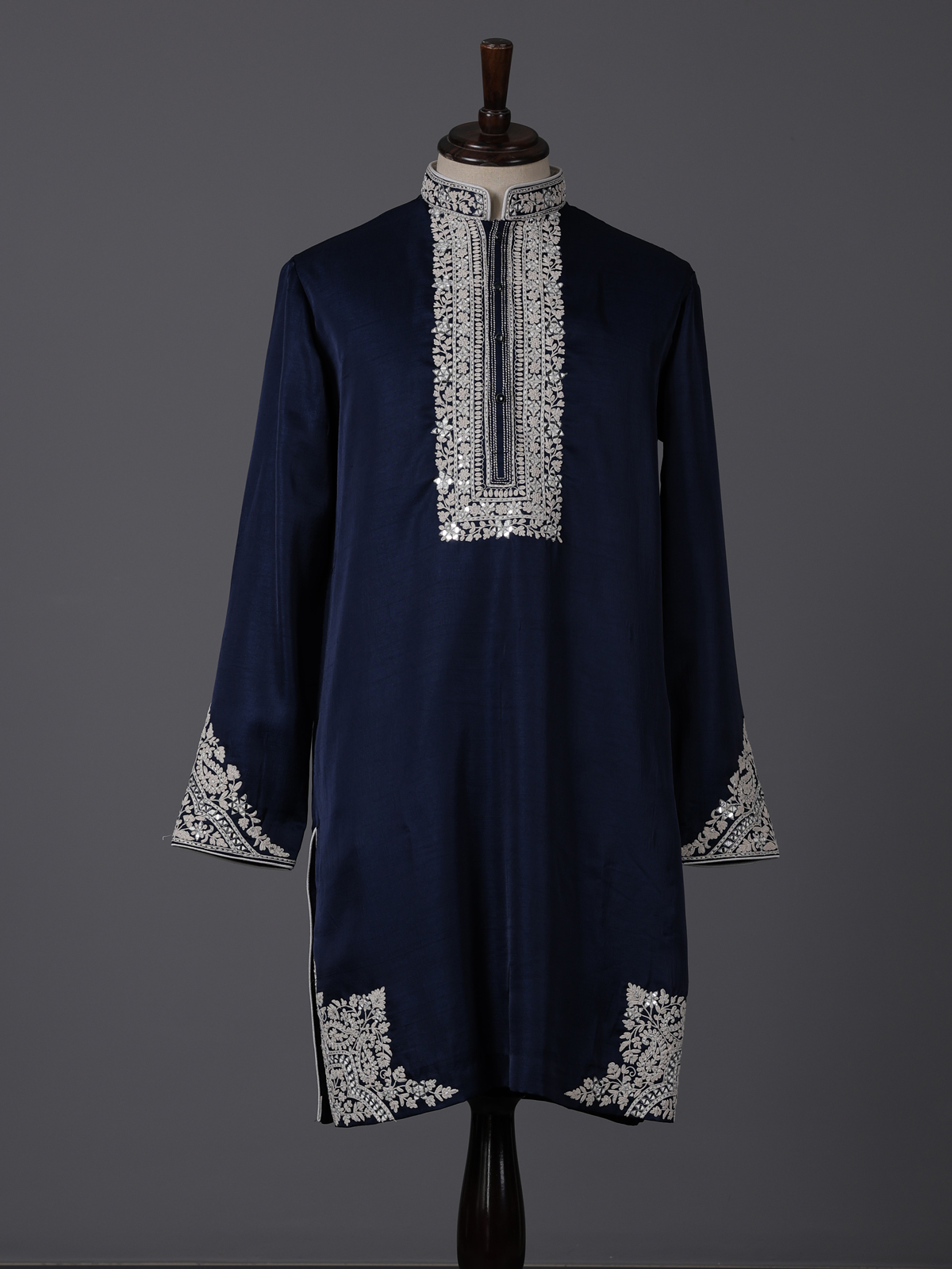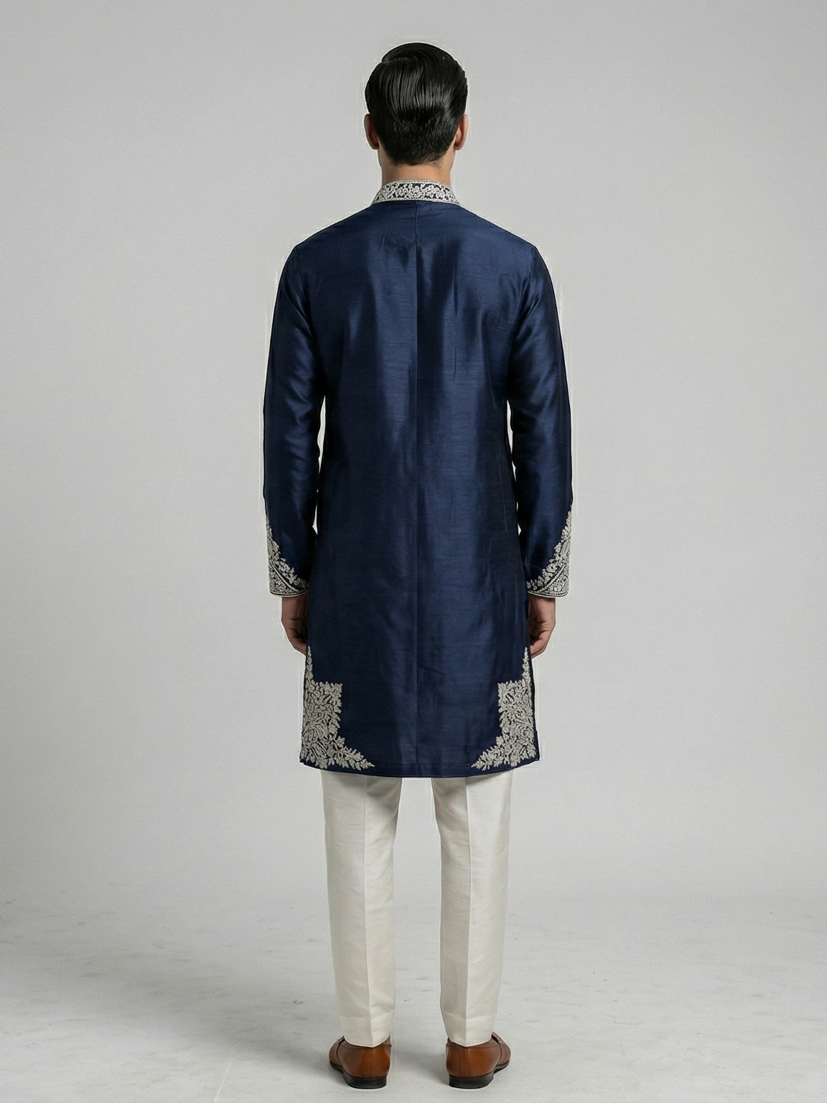 Deep navy blue tones elevate the elegance of this silk kurta set designed for festive sophistication. Adorned with aabla and thread work. It reflects refined detailing. The mandarin collar enhances its structured silhouette, while the smooth fabric ensures comfort. Paired with pants, this ensemble creates a timeless and polished ethnic look.