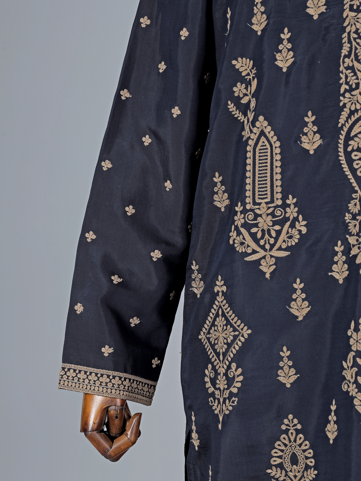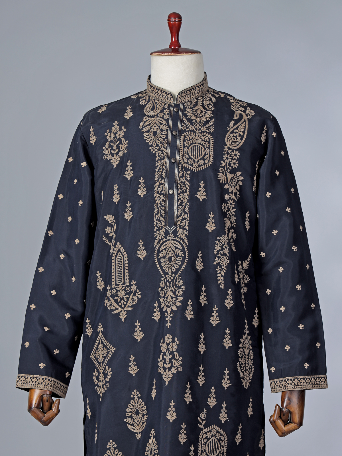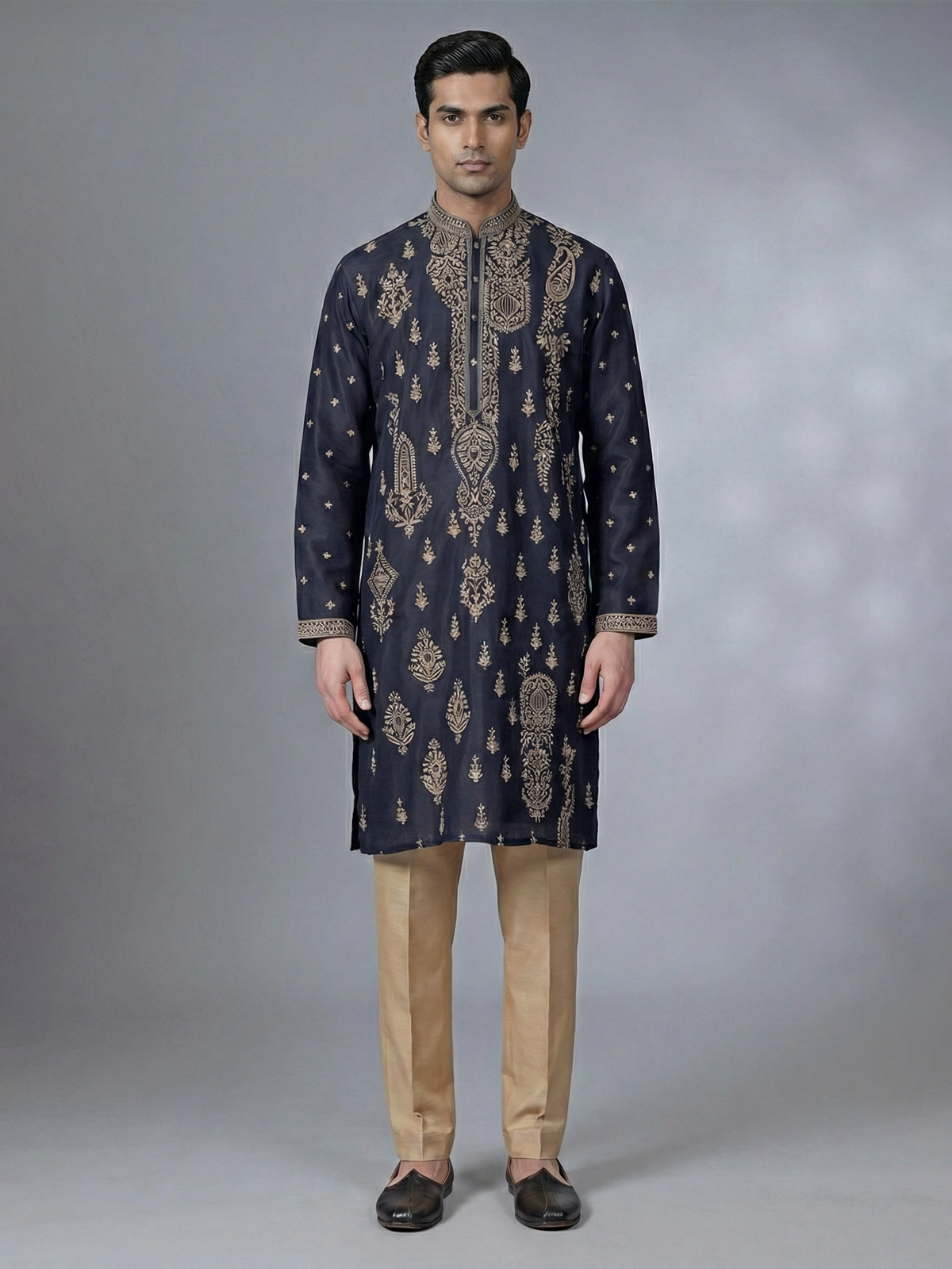 Crafted in rich navy silk, this kurta suit is created with the objective of offering understated luxury for traditional celebrations. Designed with a modern chinese neck, full sleeves, and detailed thread work, it adds depth without overpowering the look. Suitable for festive occasions, eid gatherings, and weddings, the ensemble is paired with a complementing pant for a balanced ethnic silhouette.
