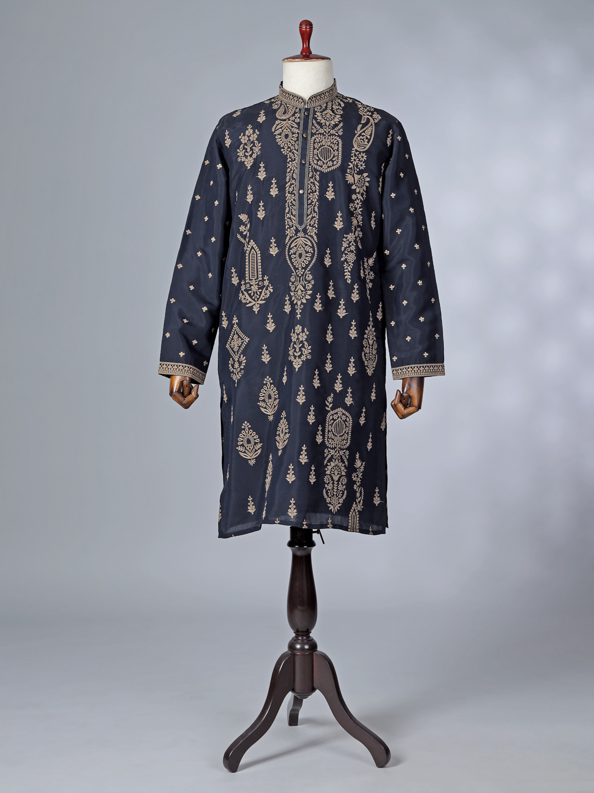 Navy Blue Silk Kurta Suit With Thread Detaling