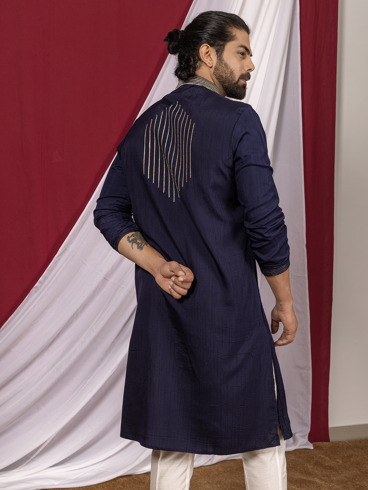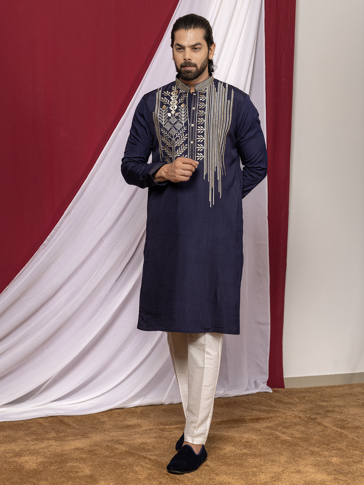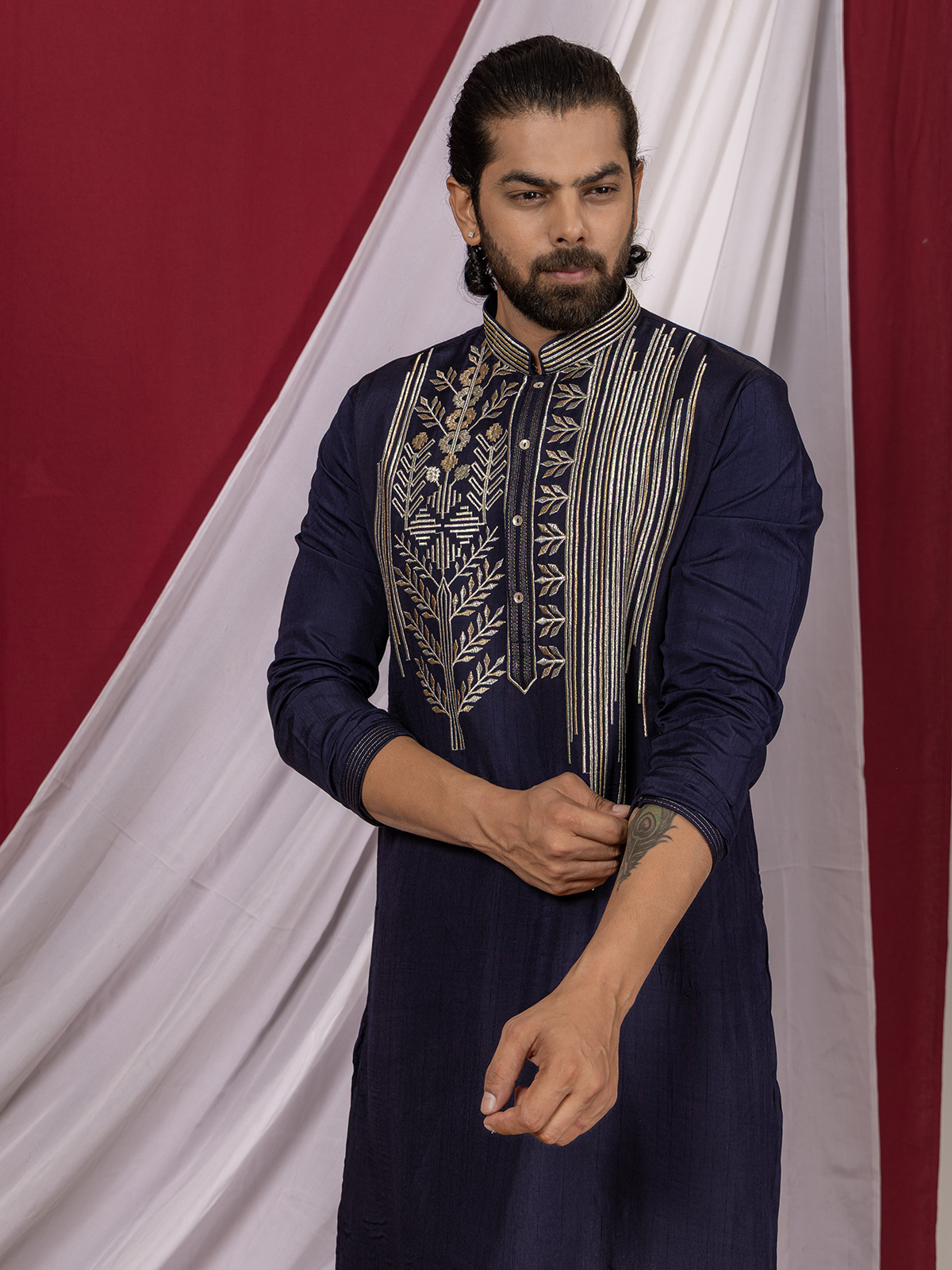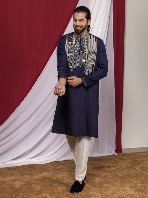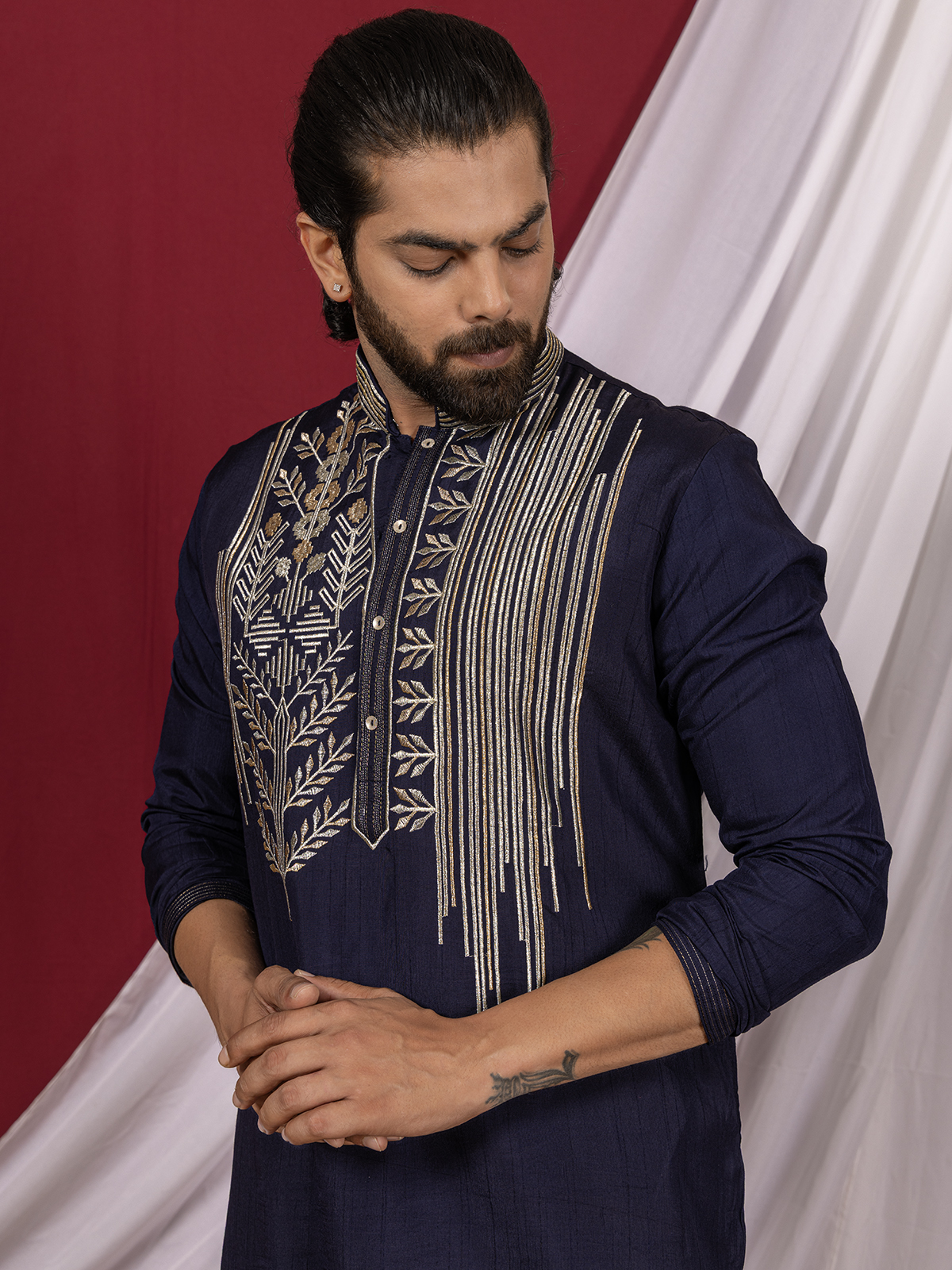 Look dashing in your traditional with rich navy cotton silk, this festive kurta suit speaks of quiet grandeur. Adorned with elegant resham detailing, its chinese collar and full sleeves enhance its stately presence. Accompanied by a tonal pant, it mirrors sophistication rooted in culture.