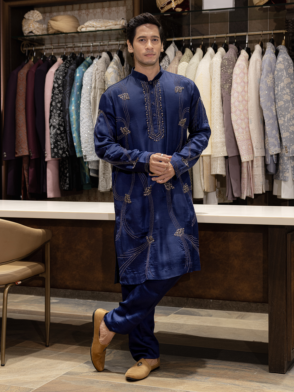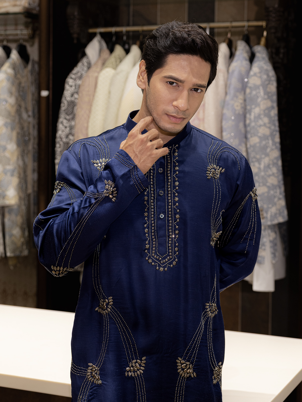 Grace in navy, this cotton silk kurta suit features full sleeves, and mandarin collar. The attire is adorned with sequins and bead work, presenting a festive shimmer that balances richness with elegance. The pant adds a perfect amount of class in your appeal.