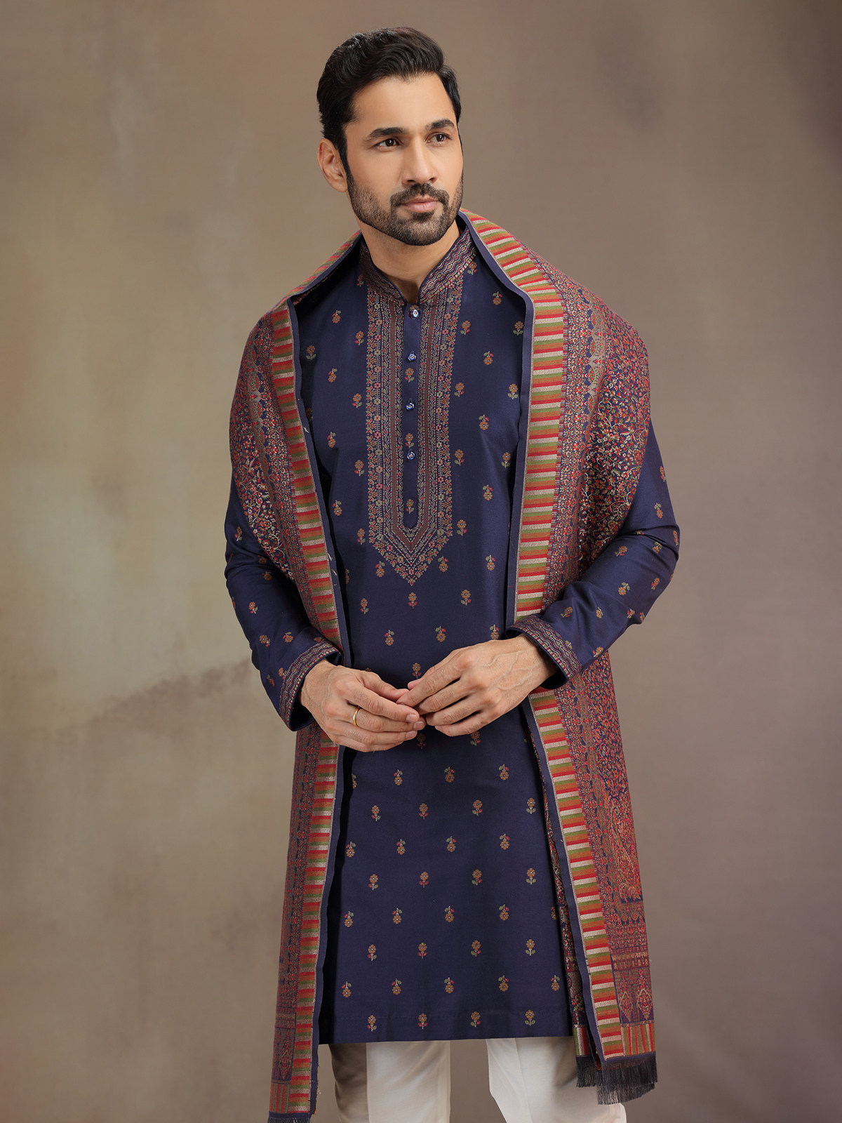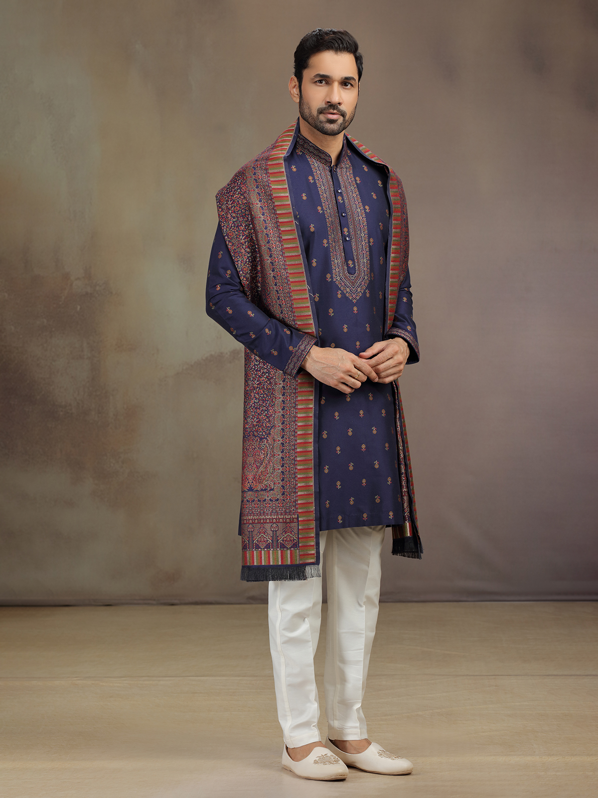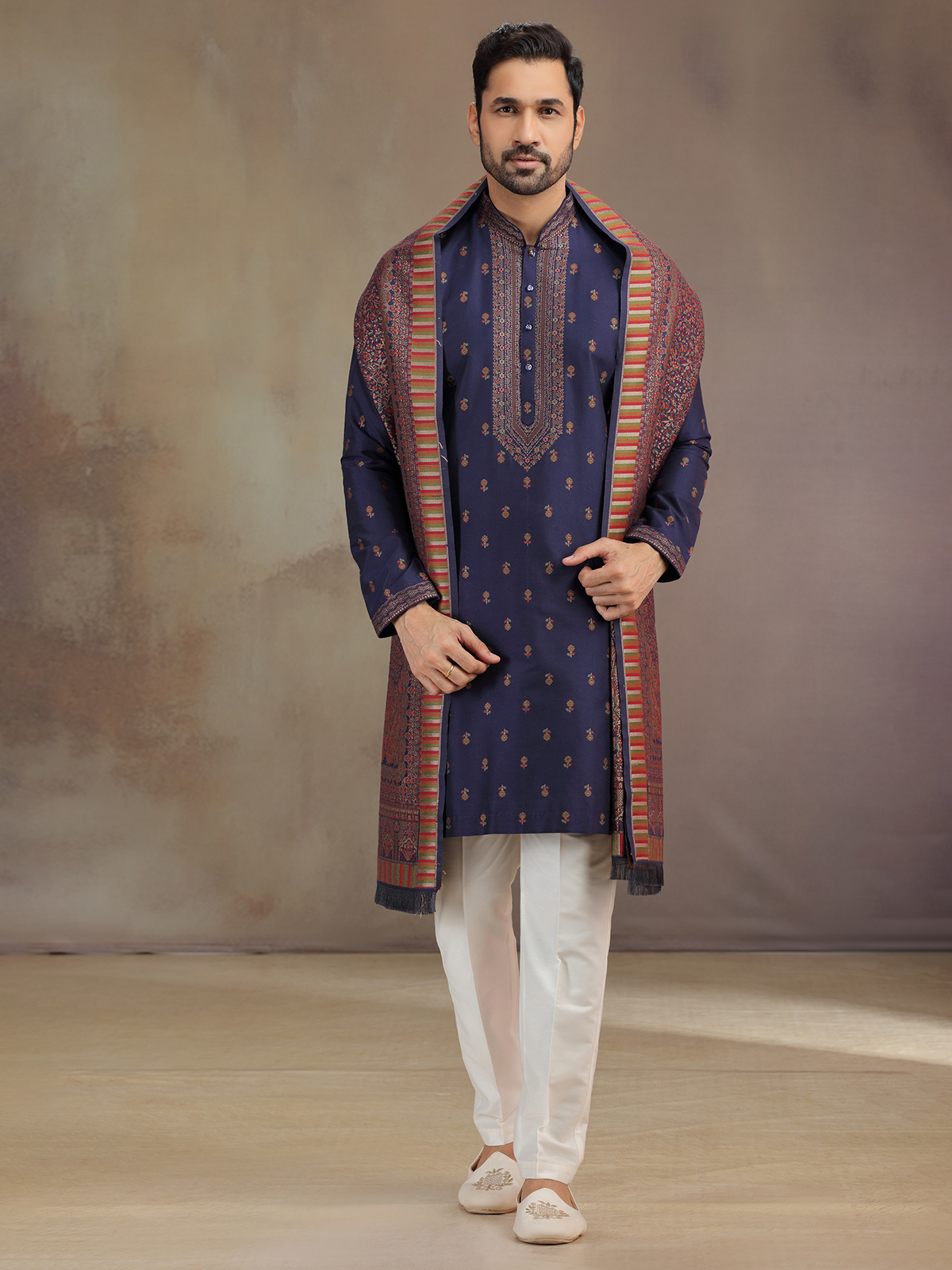 Steeped in sophistication, this navy cotton silk kurta pajama embraces quiet elegance to meet to make a dashhing statement in wedding and festivals. The thread work elevates its mandarin collar and full sleeves. Paired with pants and dupatta, it blends cultural tradition with refined charm, making it an ensemble well-suited for festive celebrations and graceful gatherings.