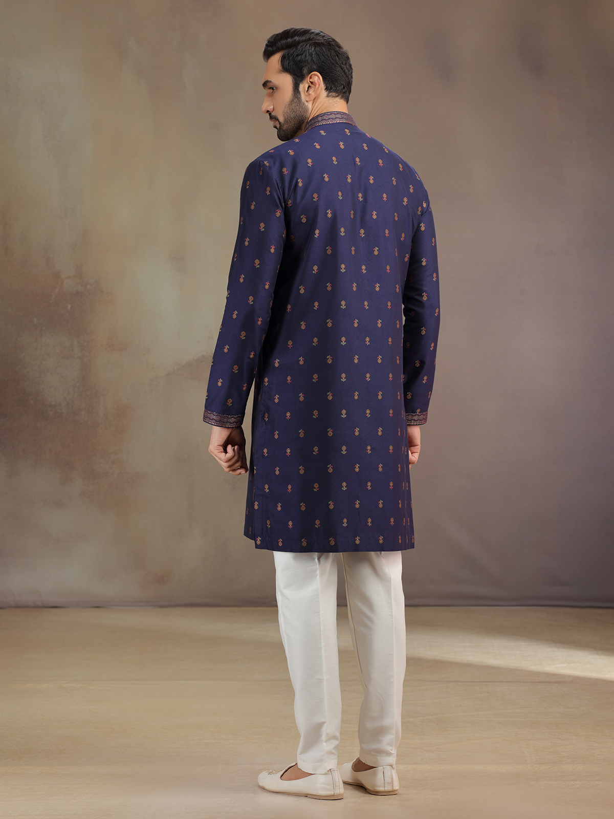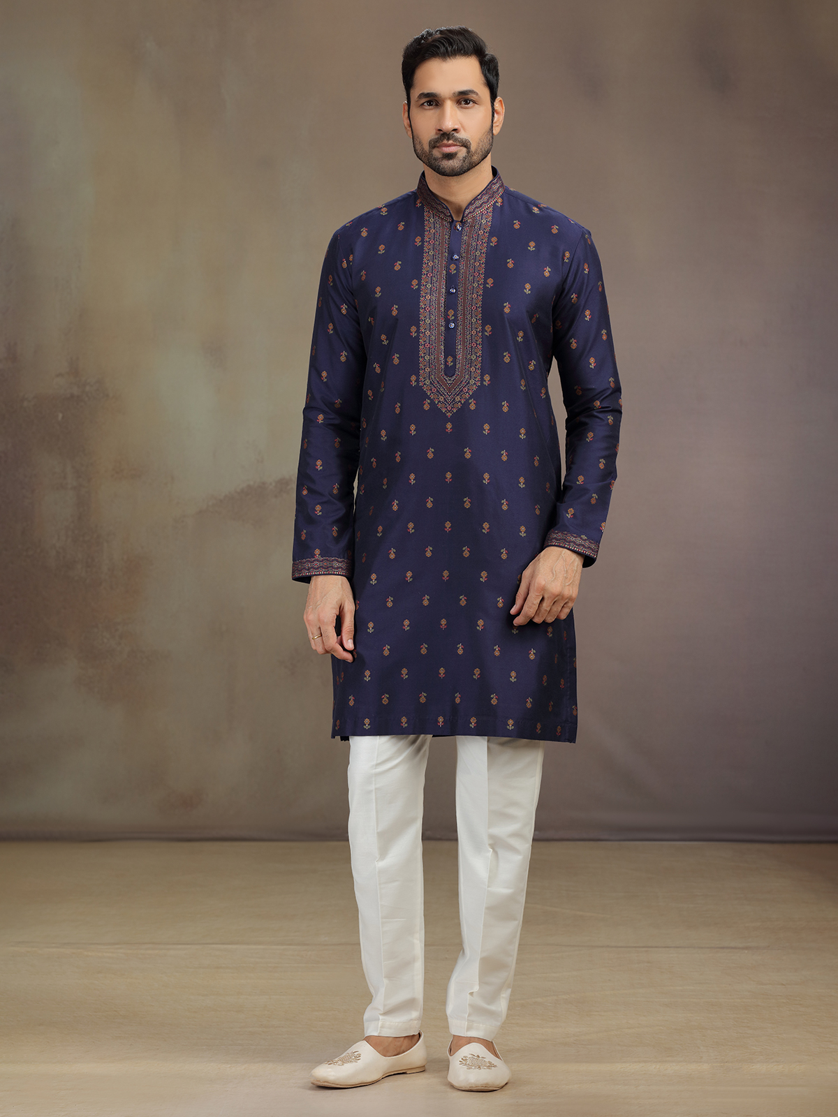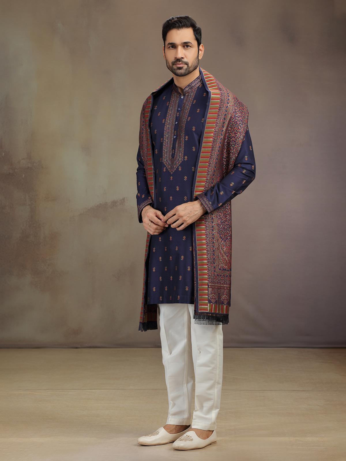Steeped in sophistication, this navy cotton silk kurta pajama embraces quiet elegance to meet to make a dashhing statement in wedding and festivals. The thread work elevates its mandarin collar and full sleeves. Paired with pants and dupatta, it blends cultural tradition with refined charm, making it an ensemble well-suited for festive celebrations and graceful gatherings.