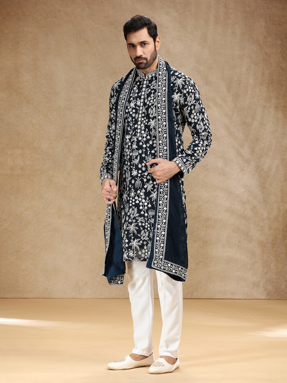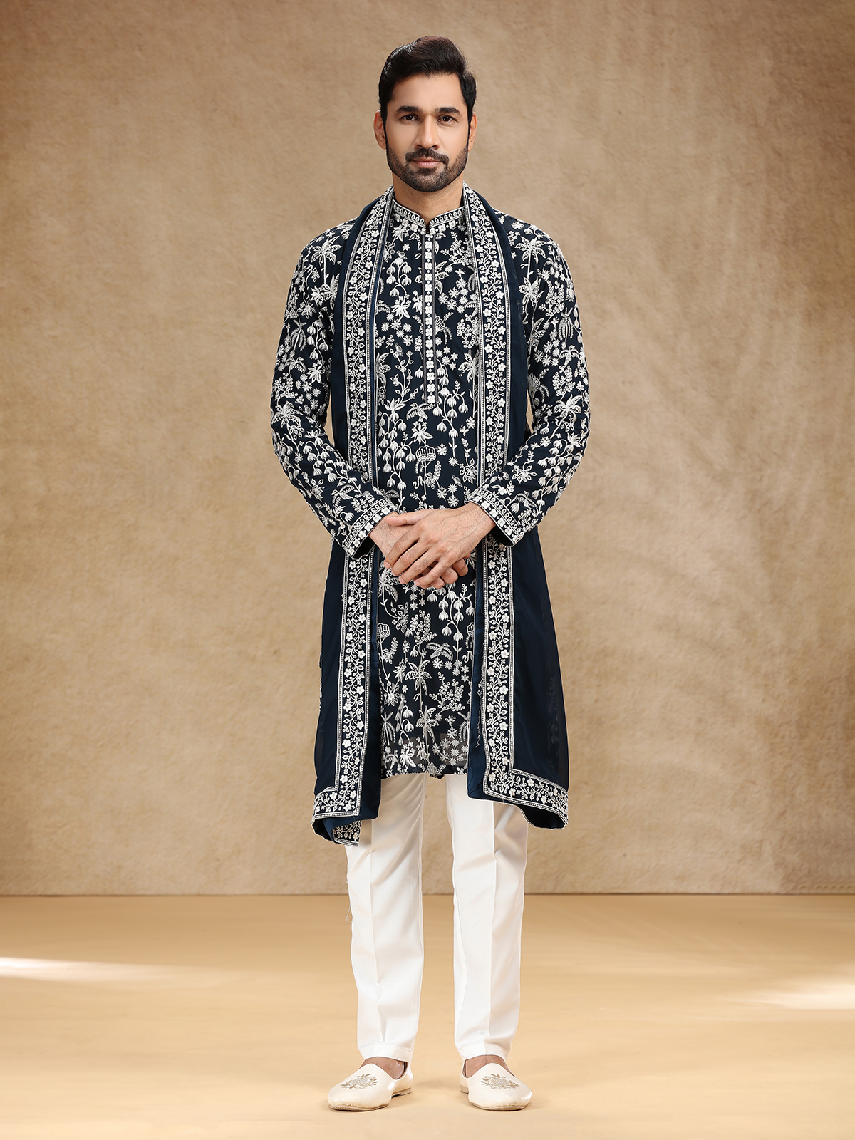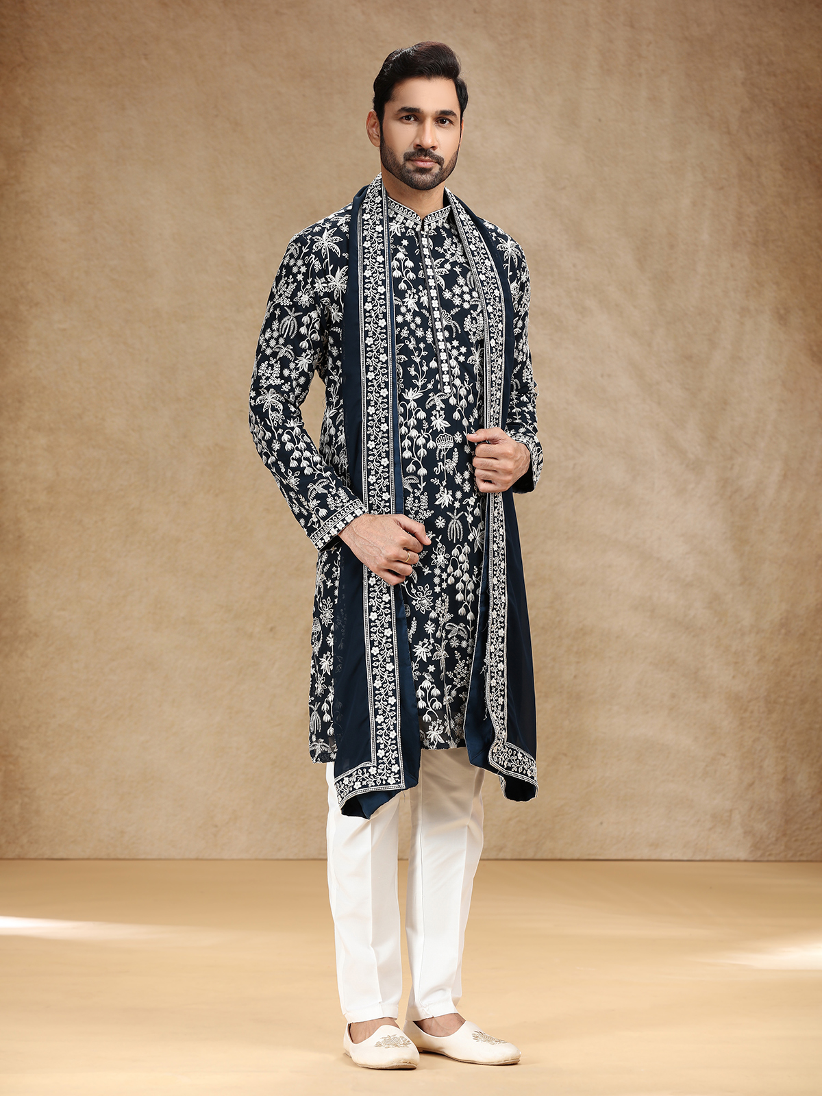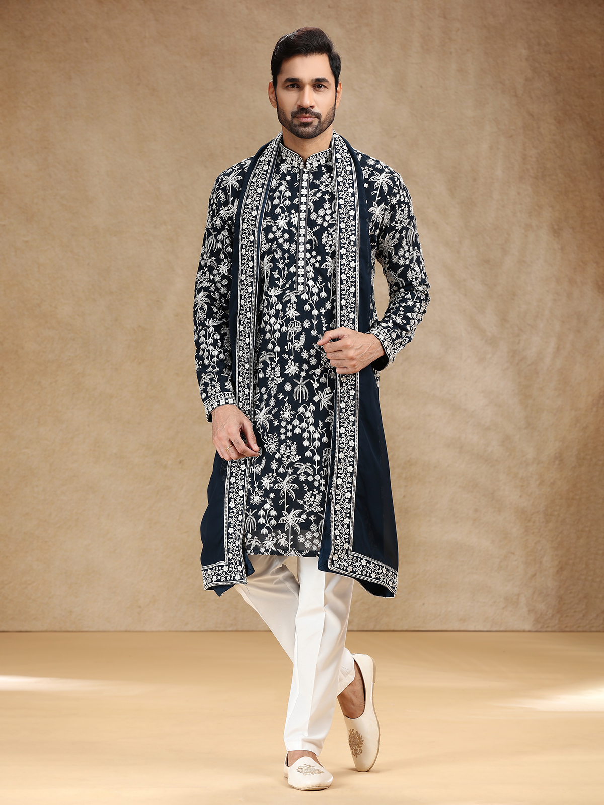 Gracefully tailored in navy georgette, this kurta suit glows with sequins and embroidery that lend festive shimmer. Designed with a stand collar and full sleeves, it pairs elegantly with pants and a matching dupatta. The flowing silhouette and refined detailing create an aura of timeless charm, making it perfect for festive evenings and traditional gatherings steeped in sophistication.