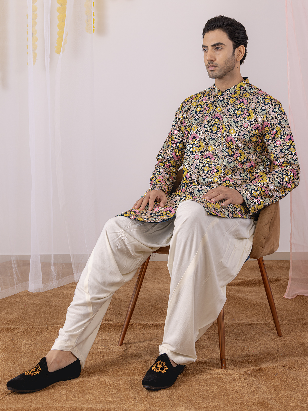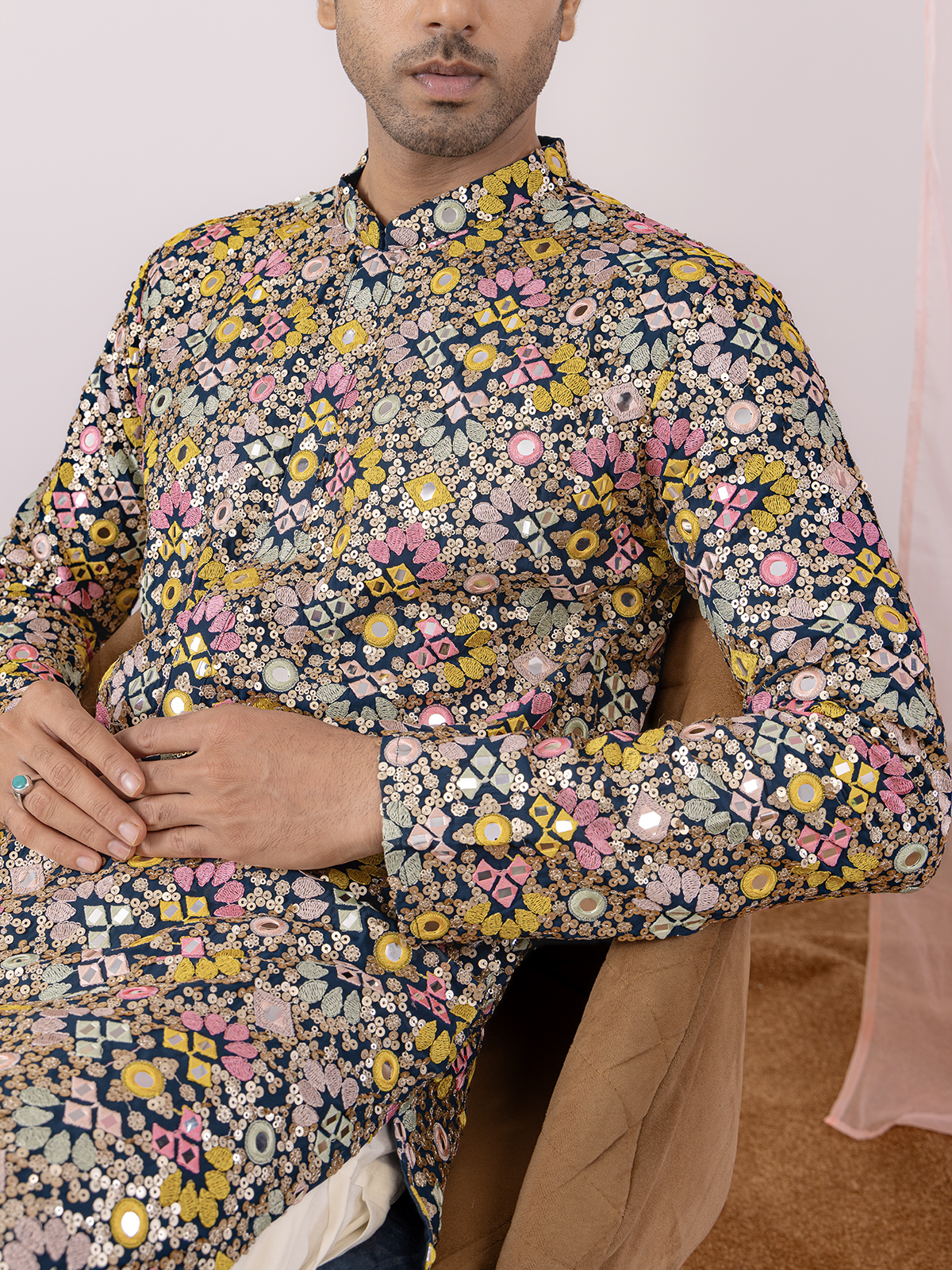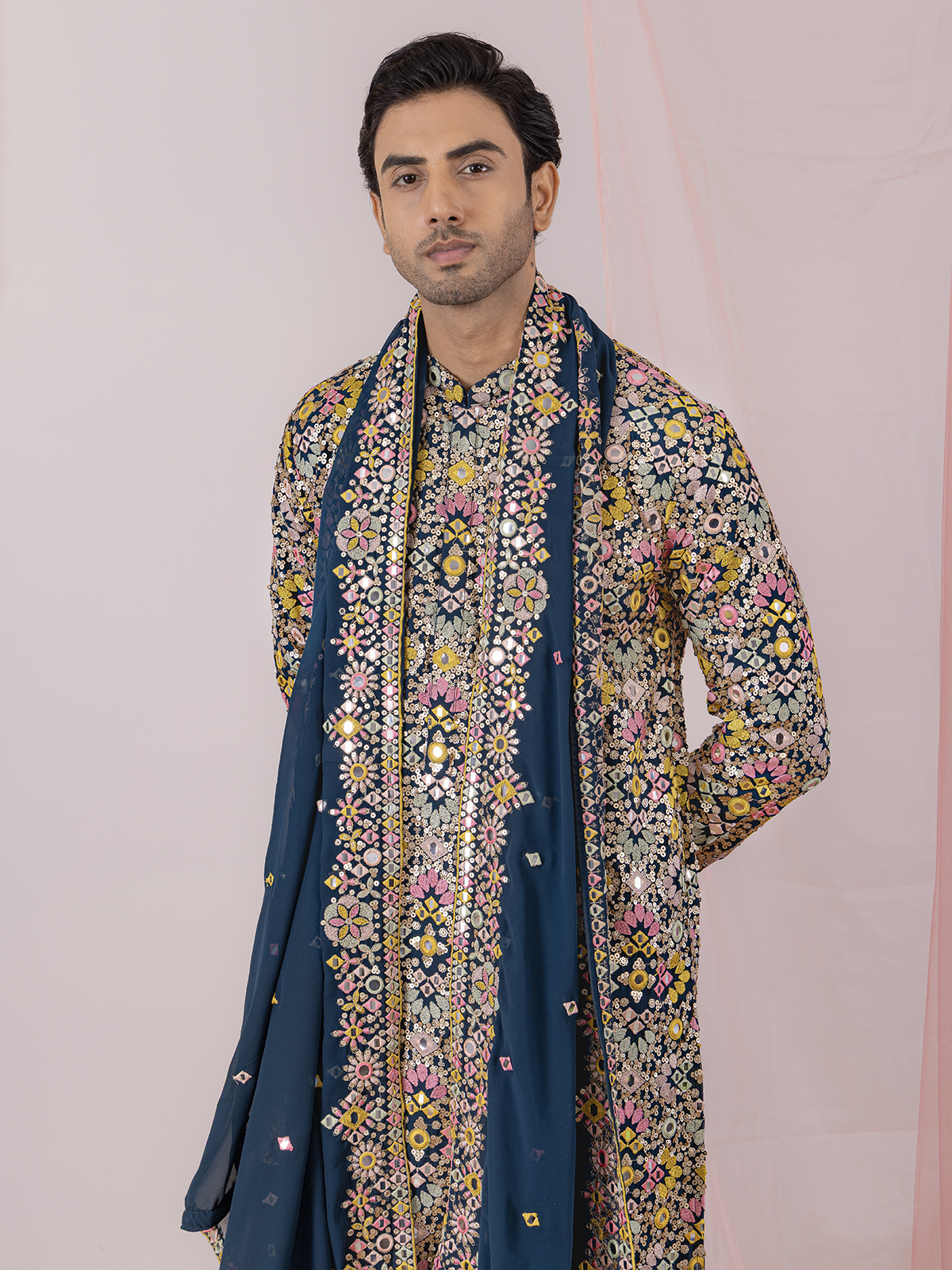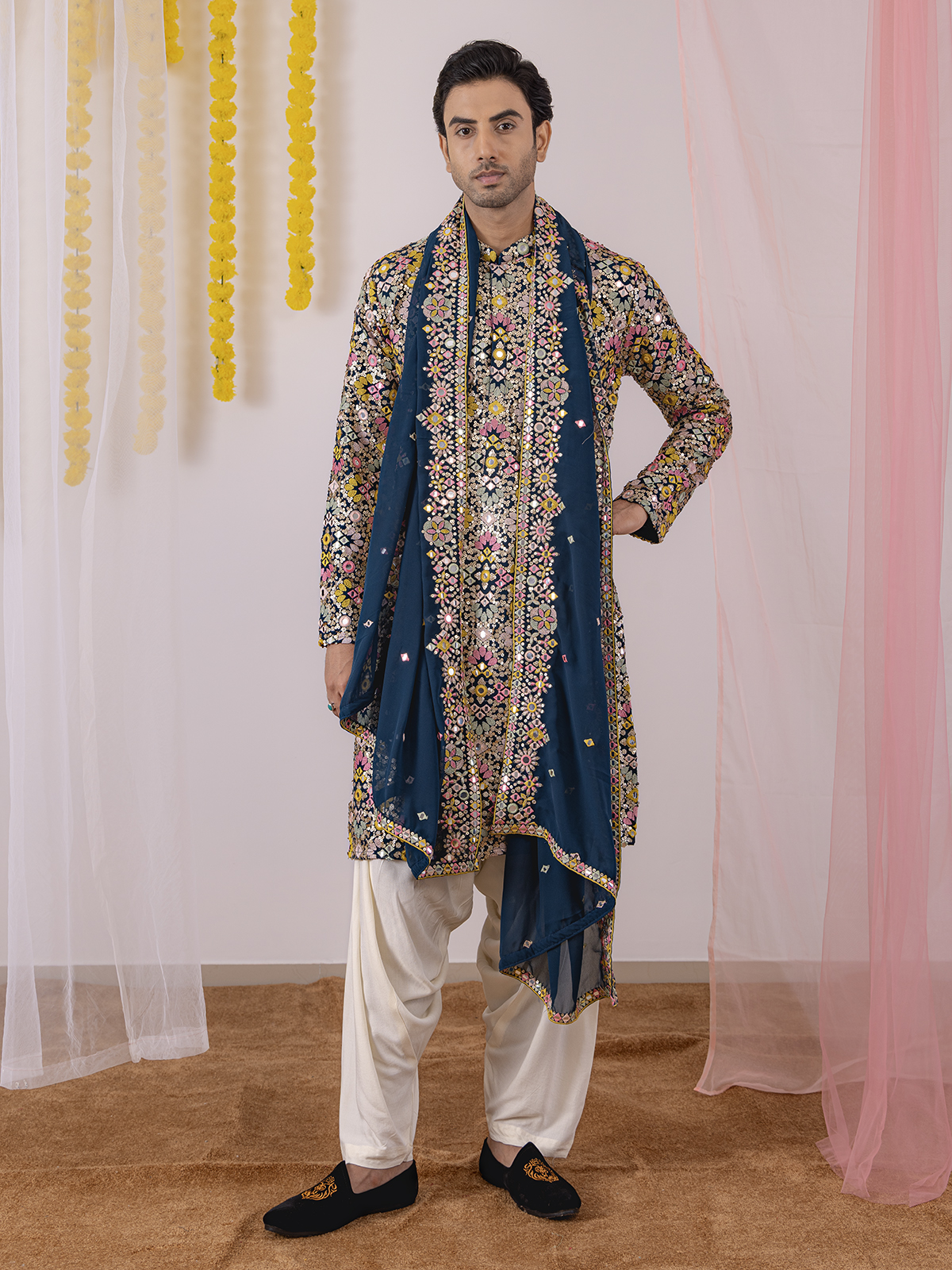 Elevate your haldi or festive look with this navy georgette kurta suit, adorned with heavy aabla, thread, and sequins work. Styled with a mandarin collar, half-button placket, and full sleeves, it comes with a salwar and dupatta for refined traditional elegance.