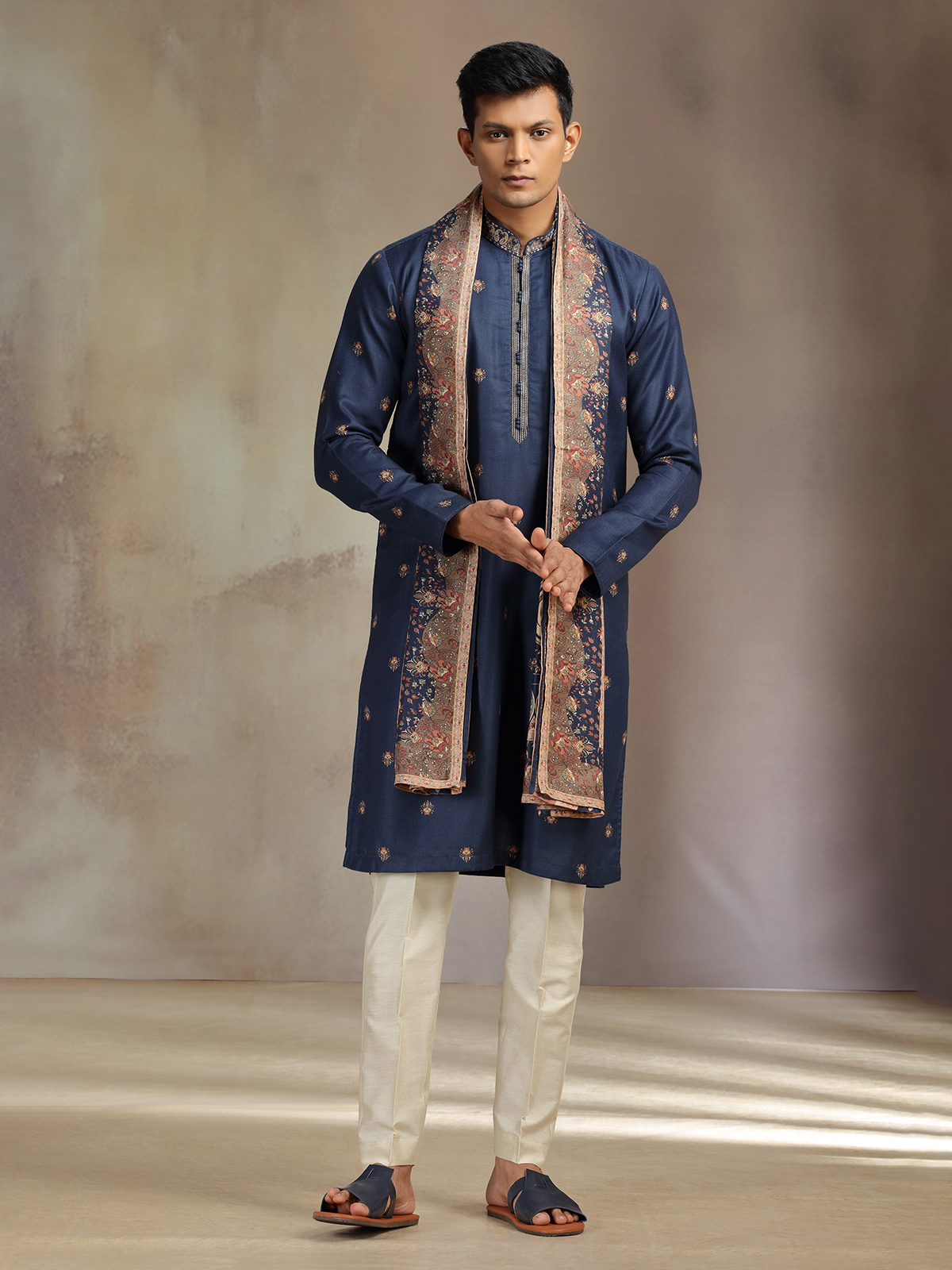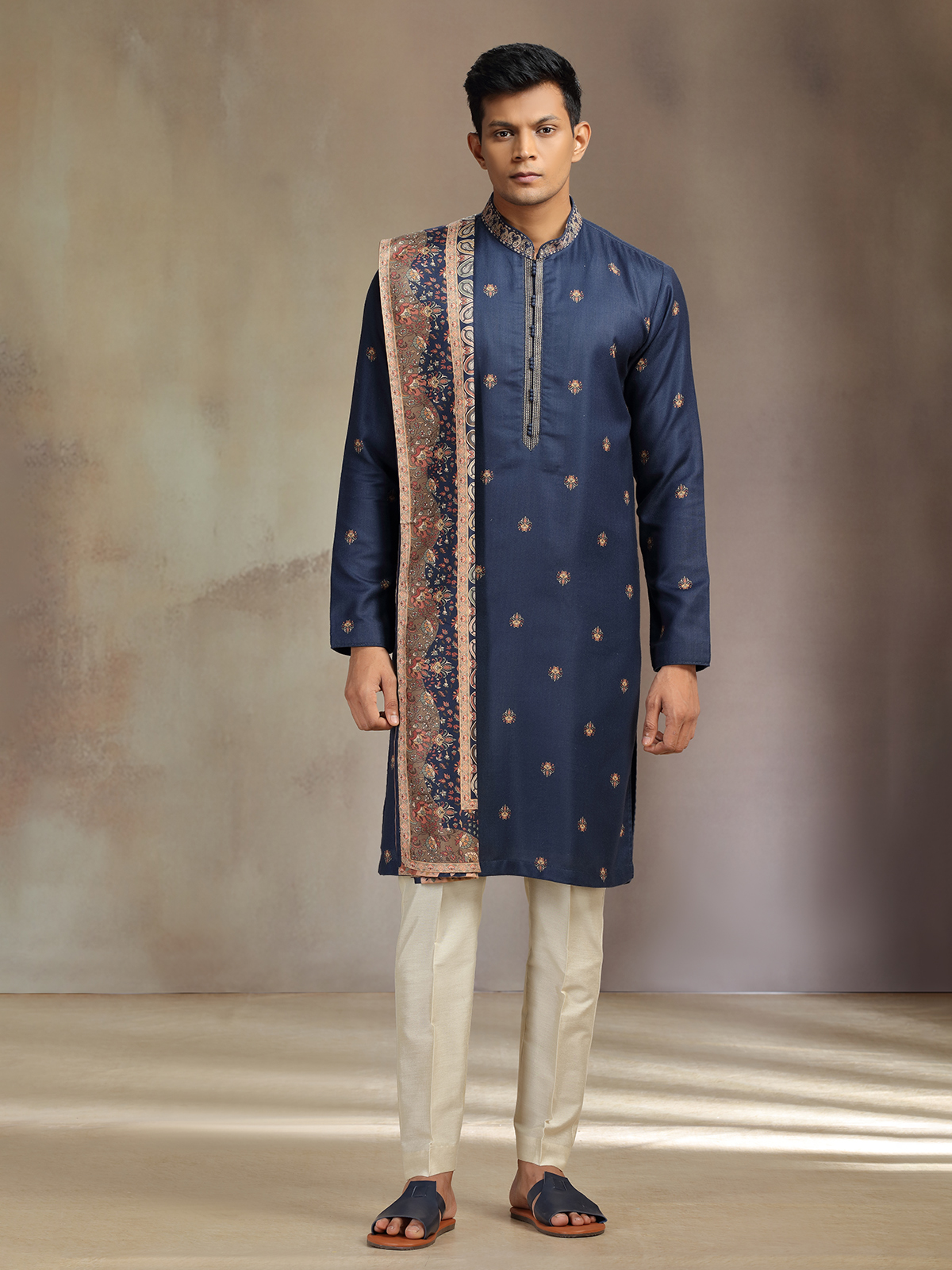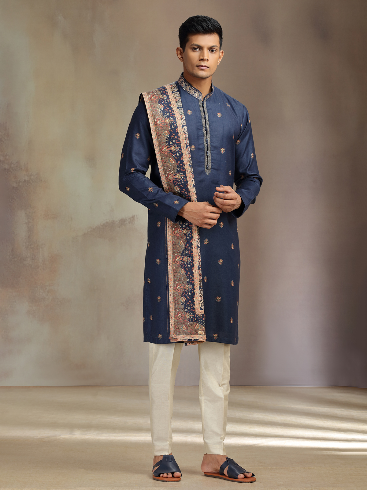 Navy Pashmina Pashmina Silk Printed Kurta Pajama With Dupatta For Men