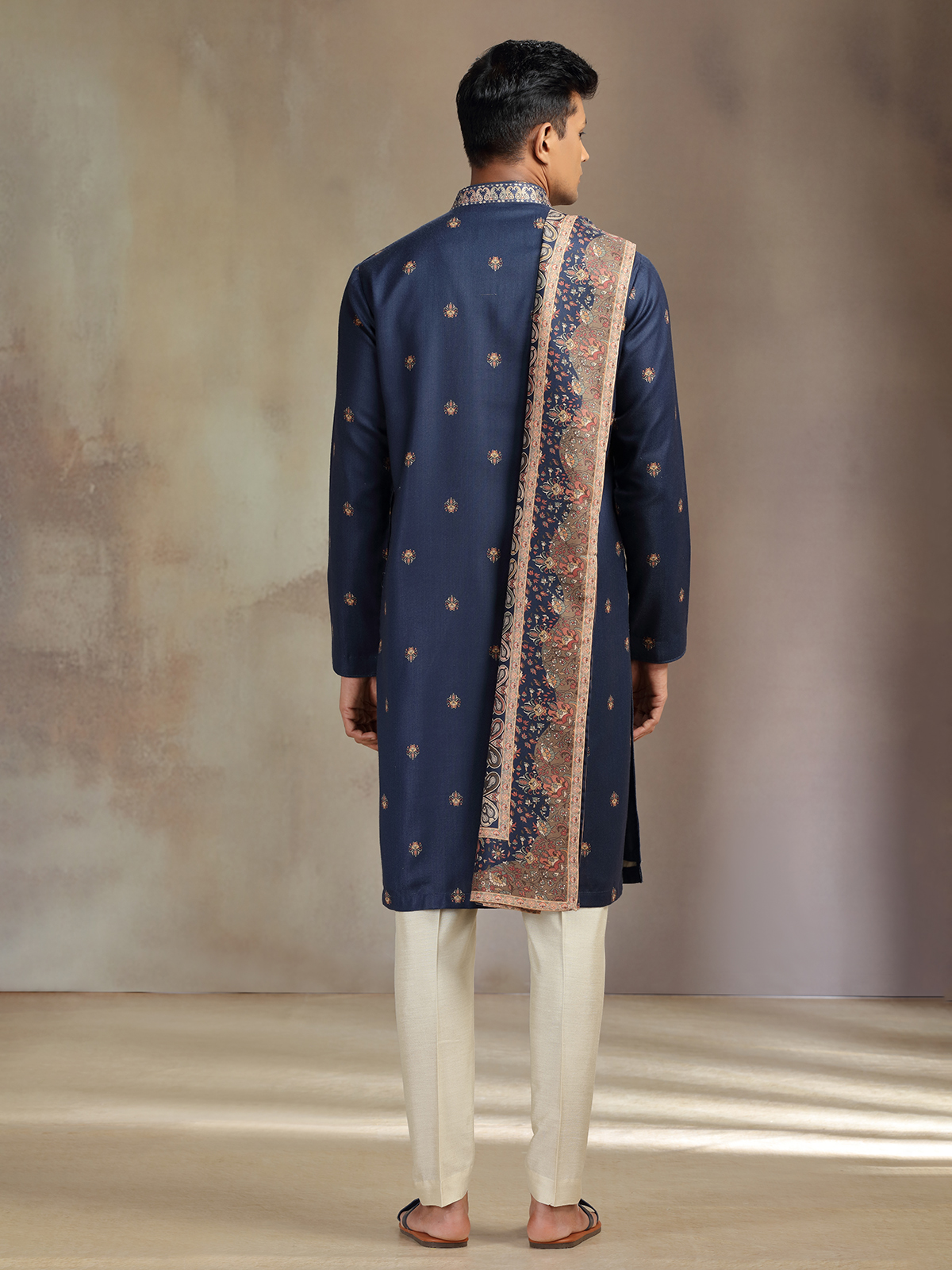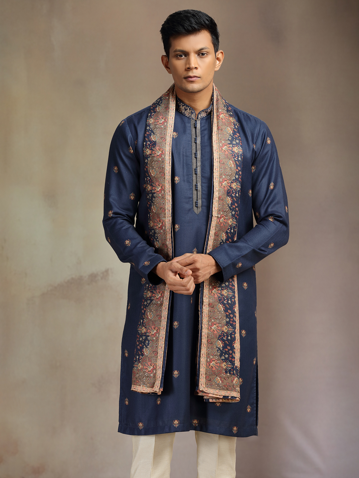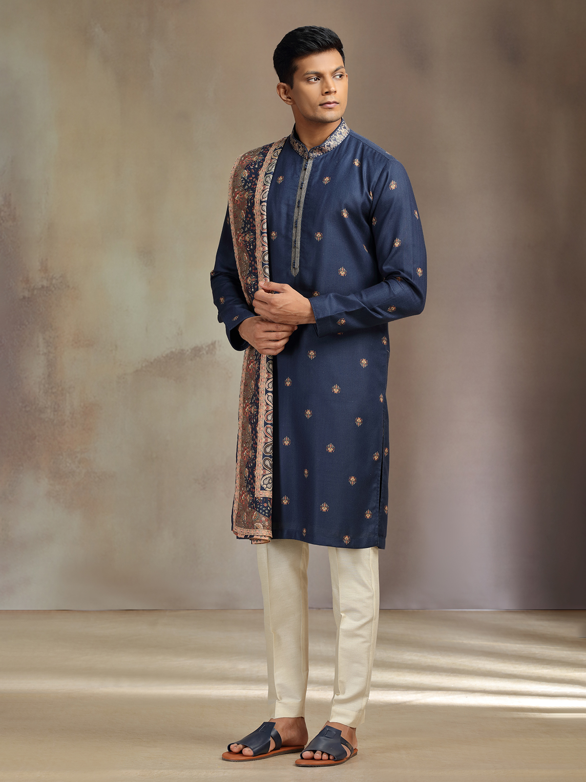 Navy Pashmina Pashmina Silk Printed Kurta Pajama With Dupatta For Men