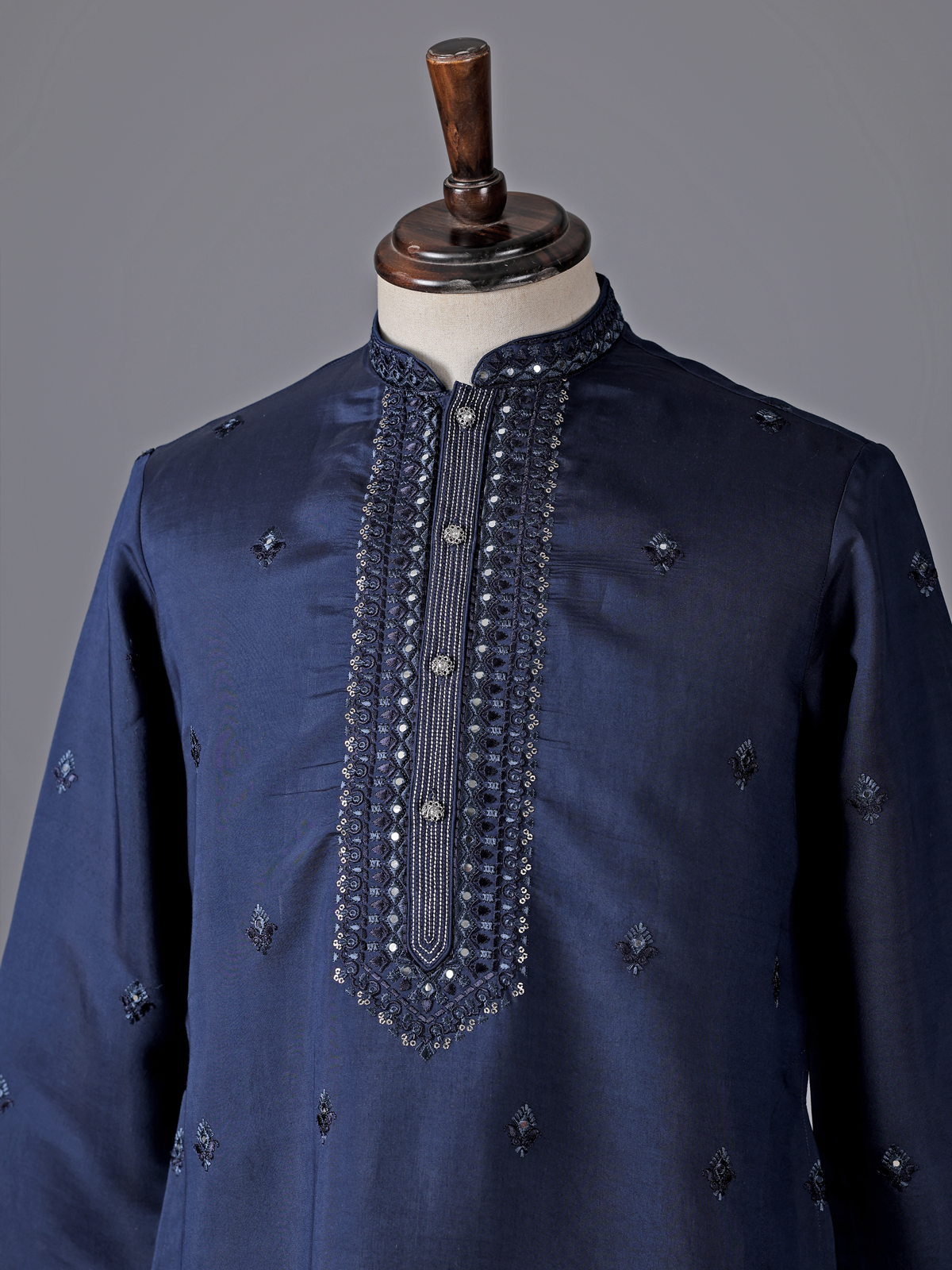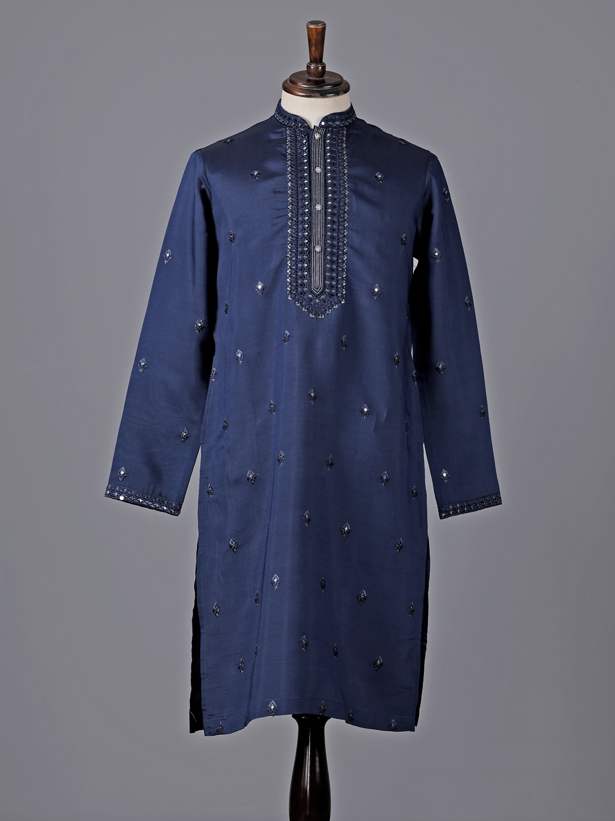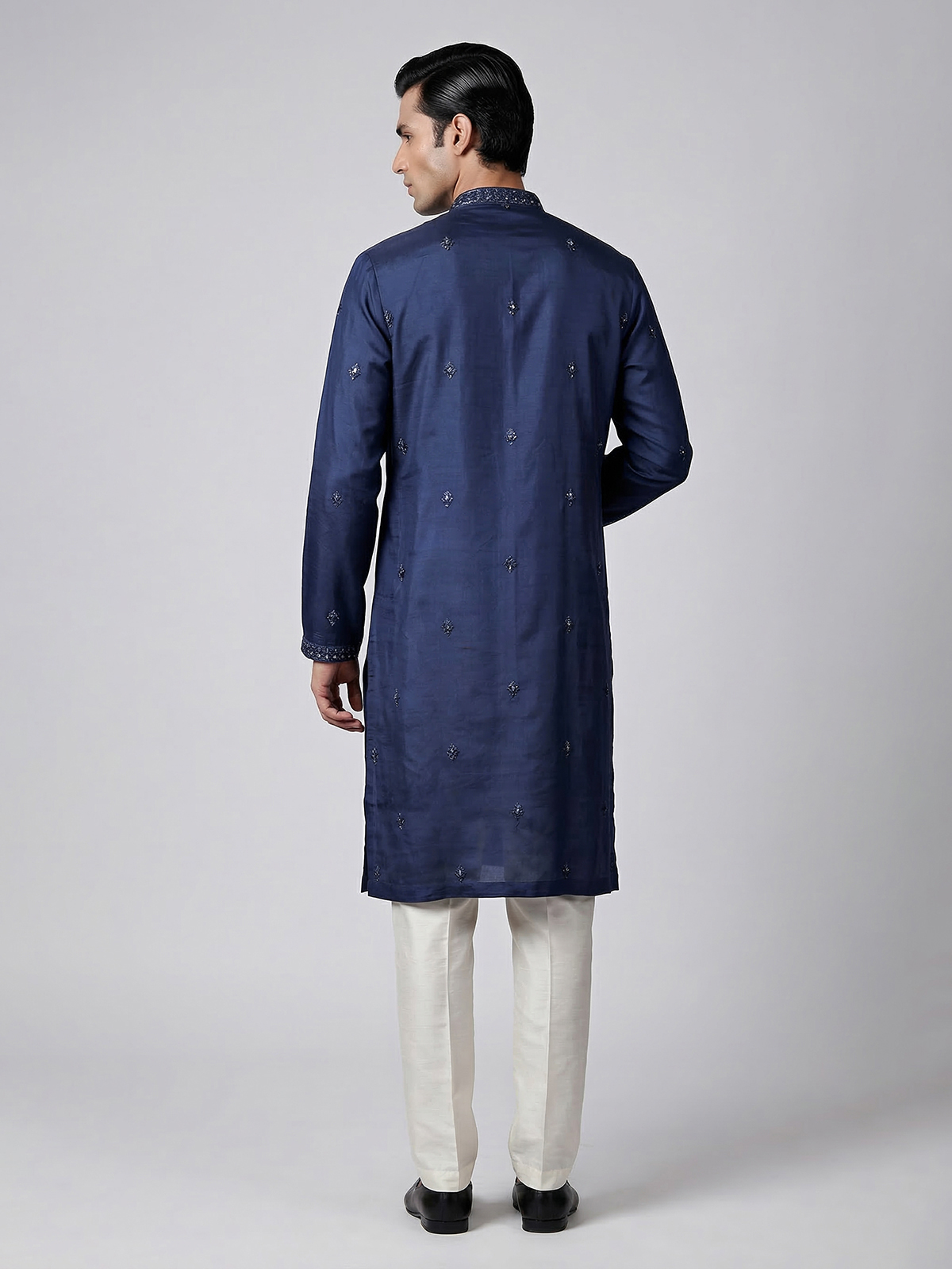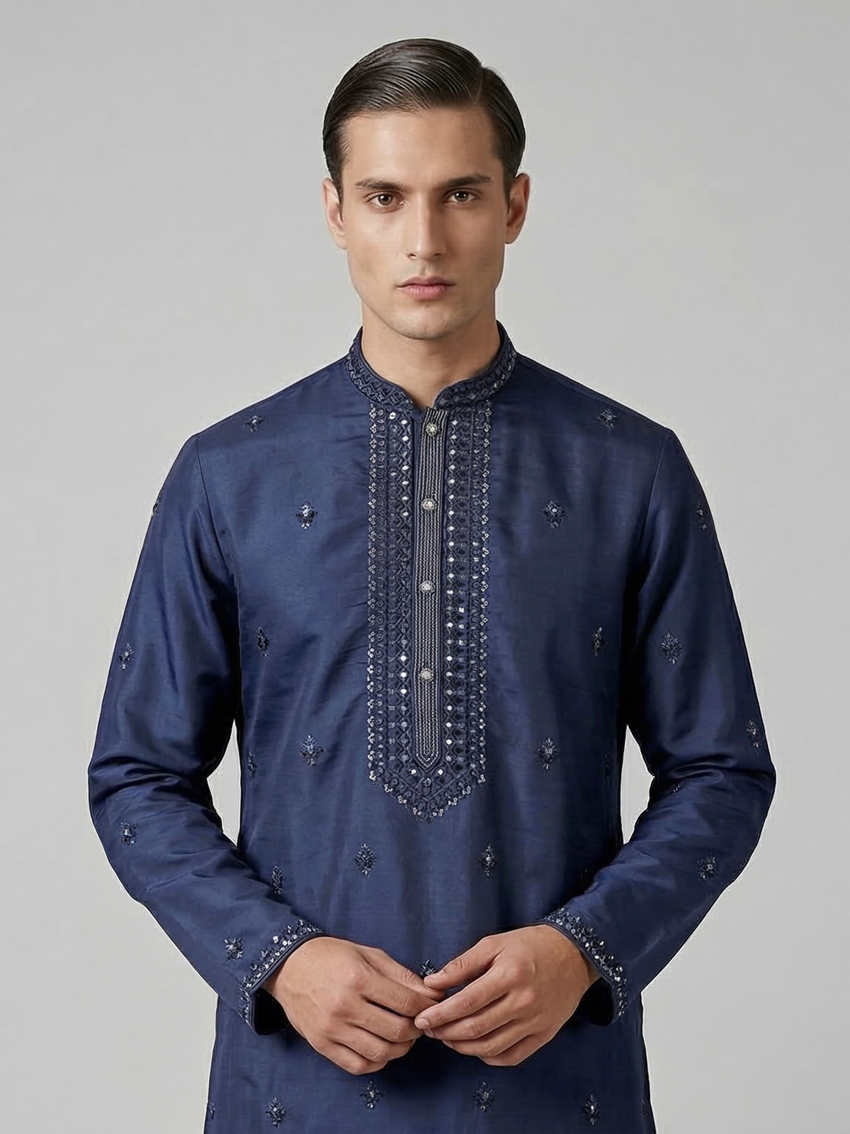Bold and regal navy silk kurta suit. captures the spirit of grand celebrations. The mandarin collar kurta is adorned with intricate embroidery, sparkling mirrors and delicate sequins that add rich festive brilliance. Crafted from luxurious silk and paired with tailored pants, the ensemble creates a striking ethnic silhouette perfect for eid festivities and vibrant sangeet occasions.