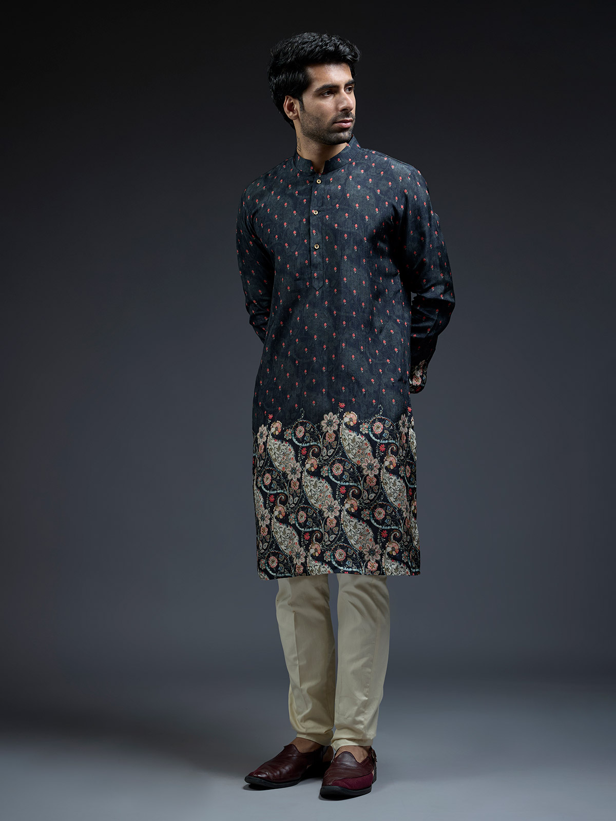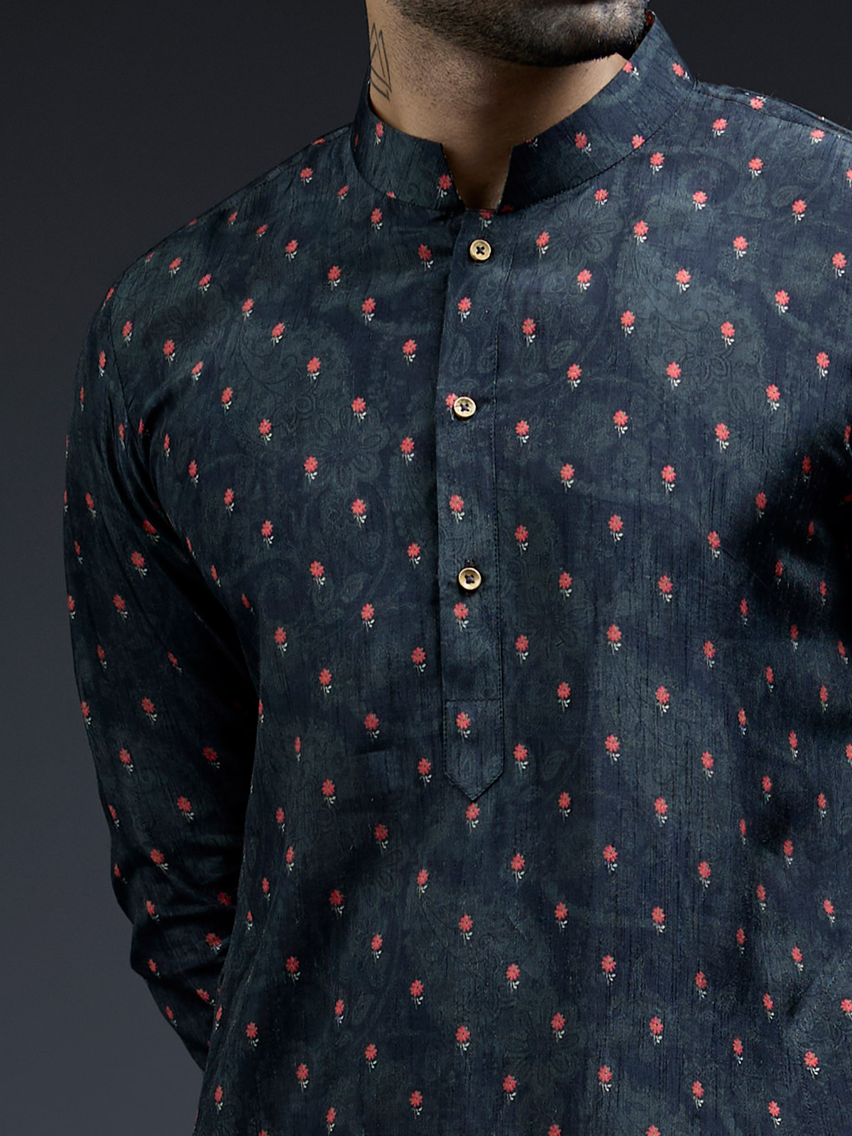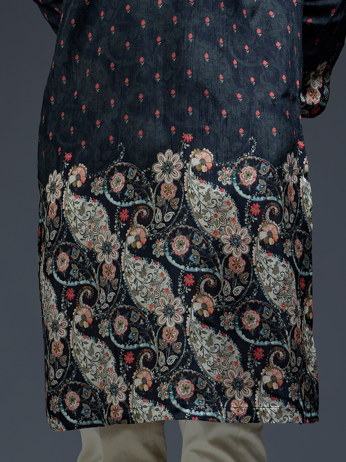 Navy Zarookha Printed Silk Kurta Suit For Men
