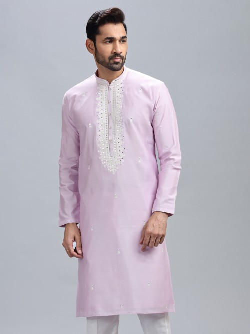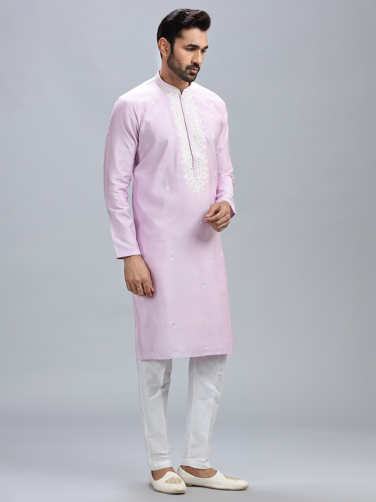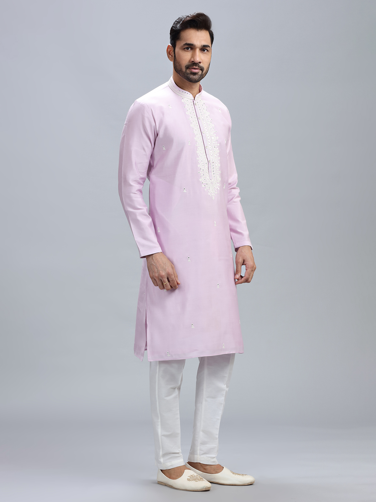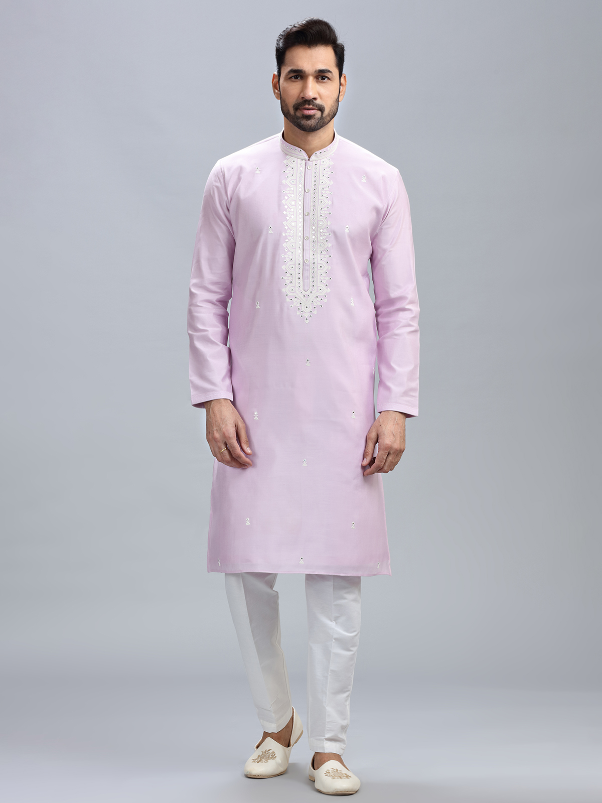 The ethnic ensemble is made more elegant by the lilac hue. The overall festive vibe is brought by this cotton-silk kurta set with a mandarin collar and matching bottom and wonderful thread, aabla work. Add this to your collection.