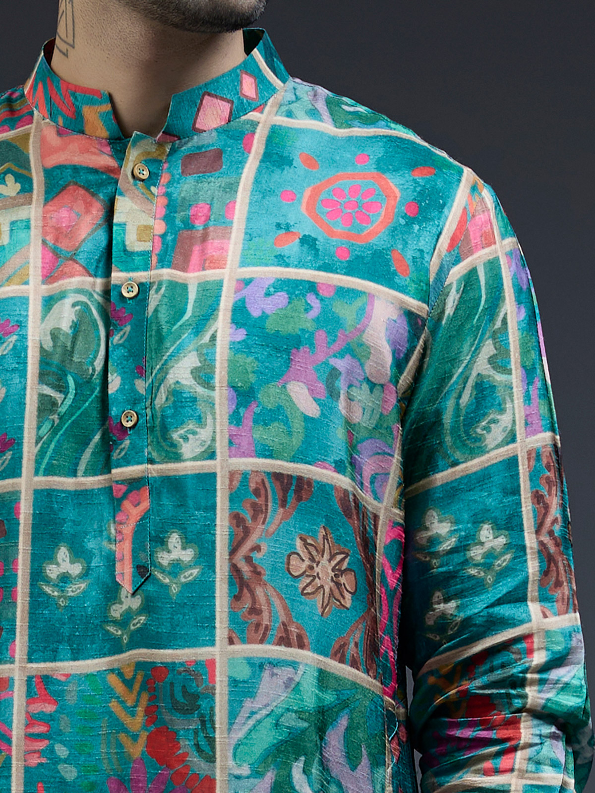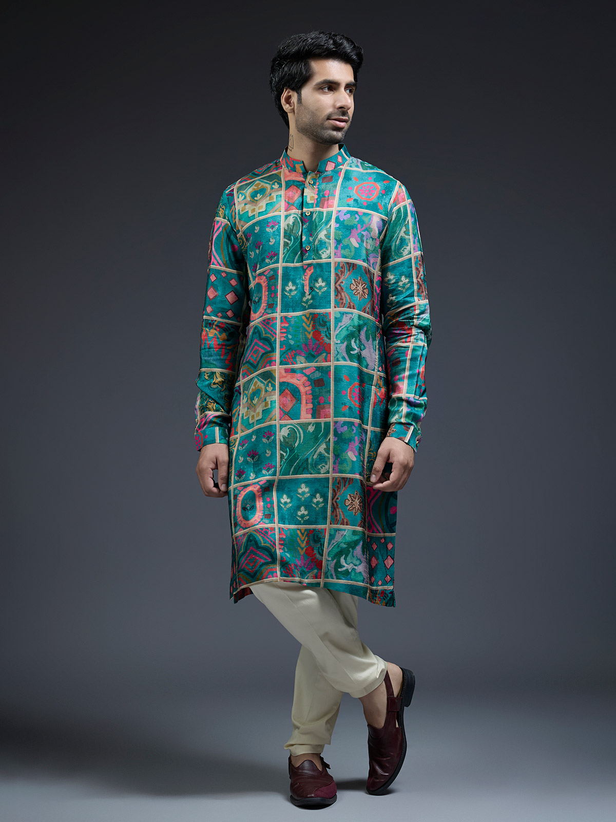 A traditional rama green silk kurta suit with a lovely ethnic theme pattern is ideal for festivals. It features long sleeves and a Mandarin collar. A cream bottom is included.