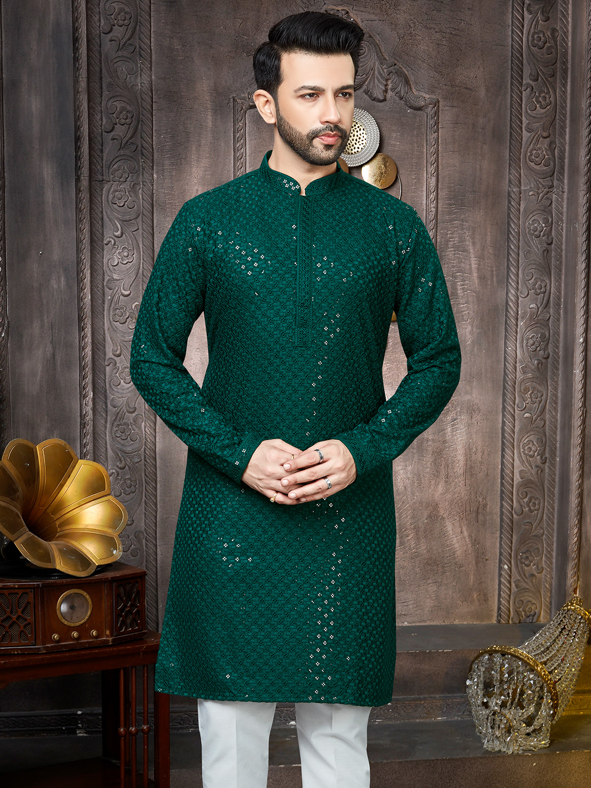 For those who prefer a subtle yet stylish look, this green kurta suit is ideal. Crafted from georgette fabric and detailed with embroidery and sequin work, this suit is both festive and comfortable. The mendarin collar and matching bottom ensure a coordinated appearance.