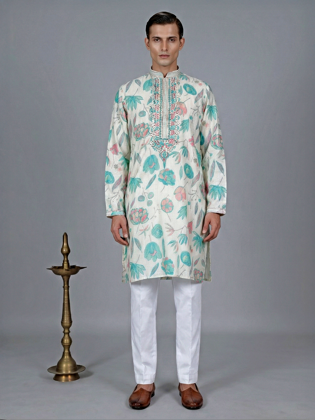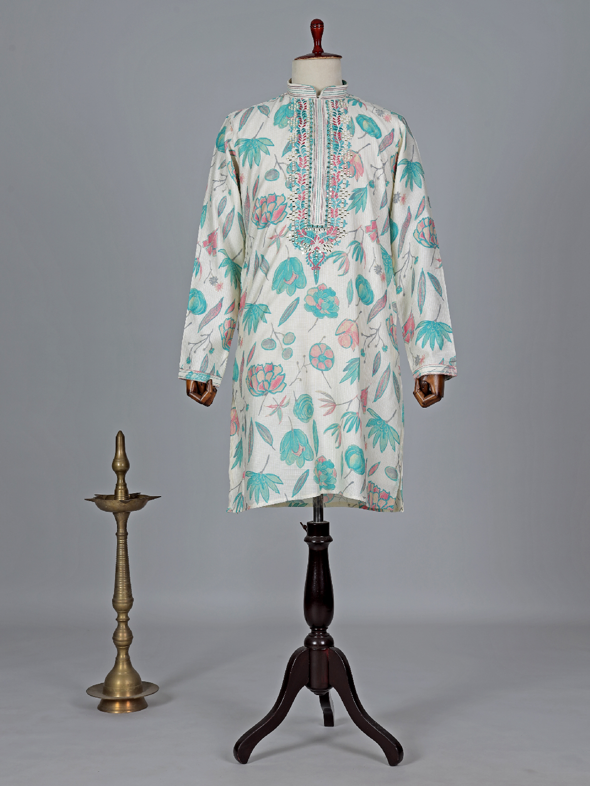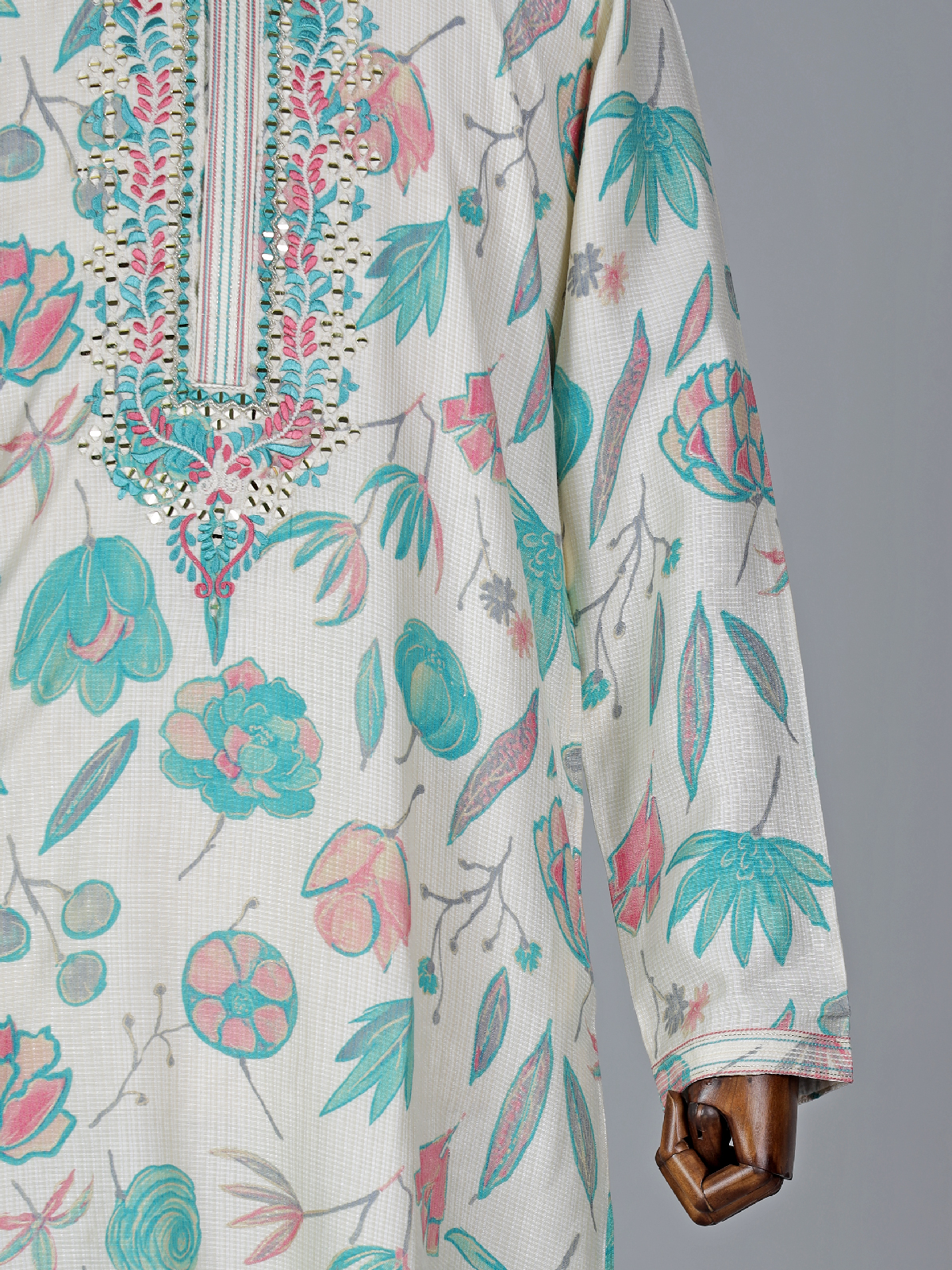 Discover sheer elegance in this off white and blue cotton silk printed kurta suit suit, adorned with mirror and embroidery work. Features a mandarin collar and full sleeves that graces the ensemble. Comes with a coordinating bottom, this outfit epitomizes sophistication and style.