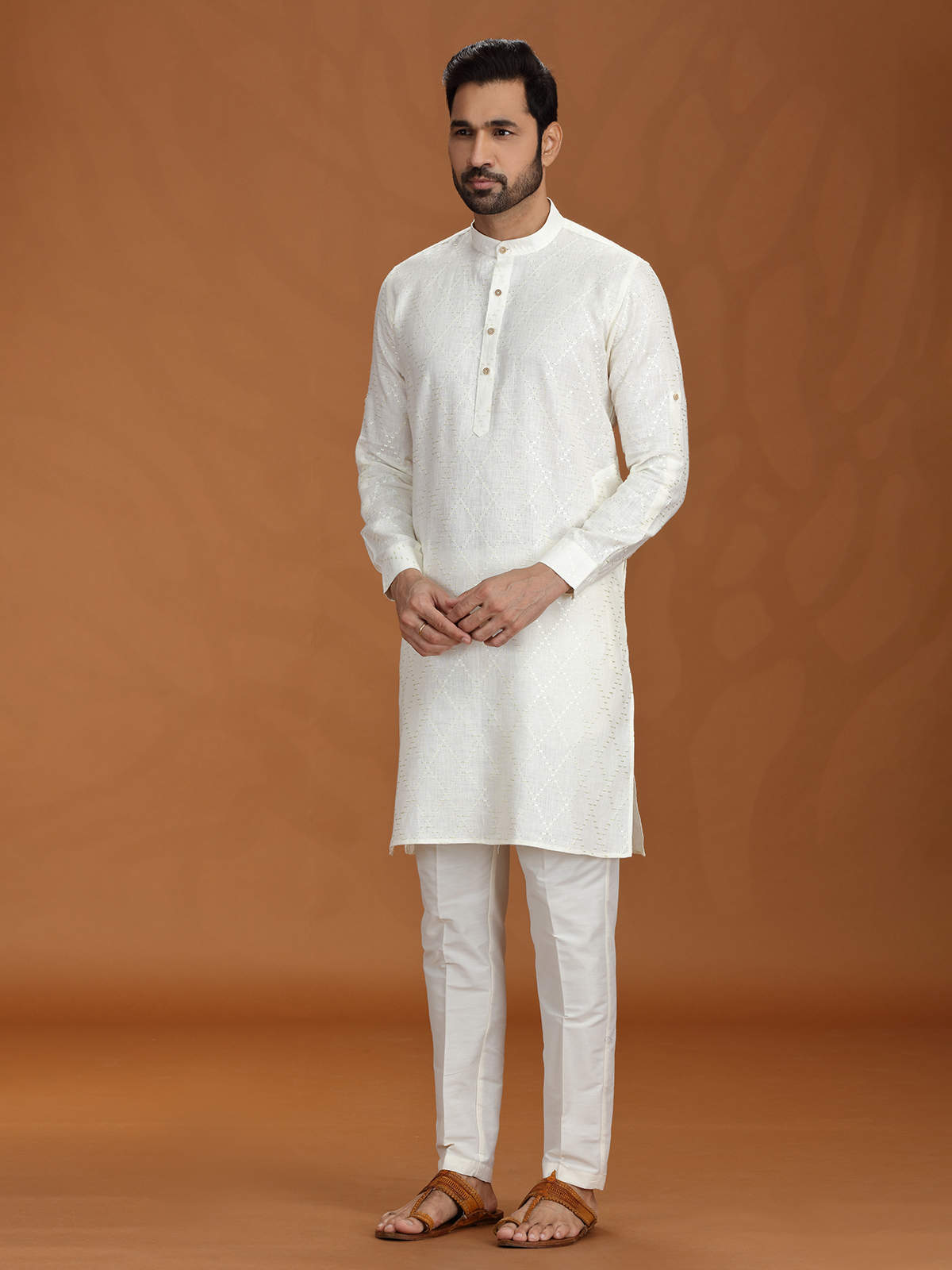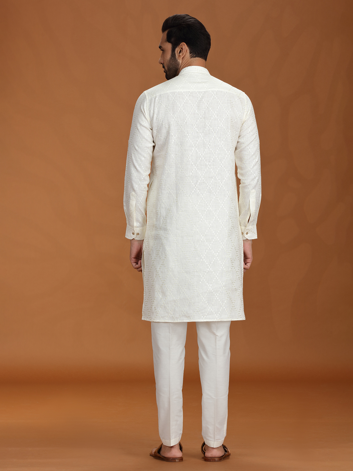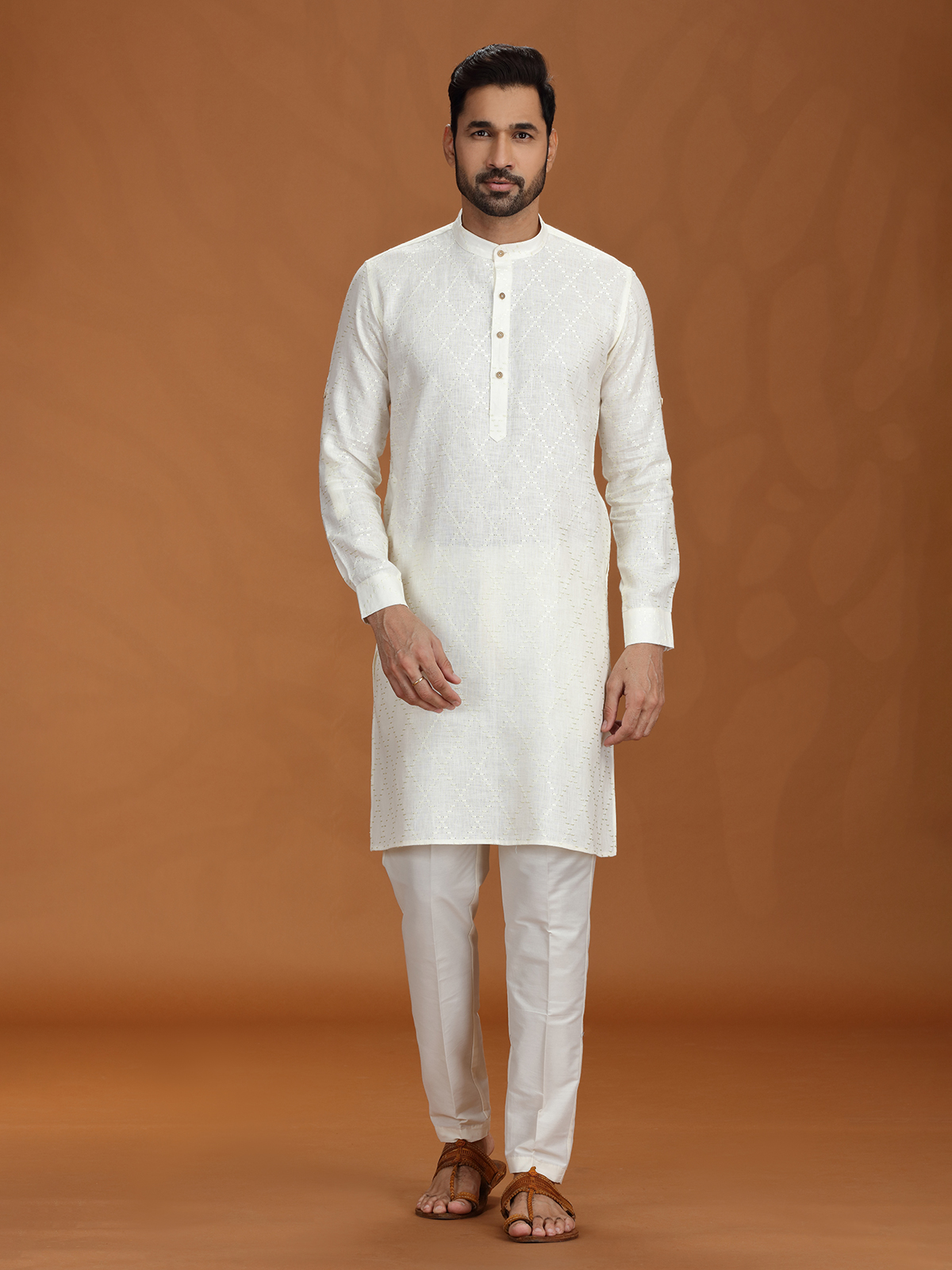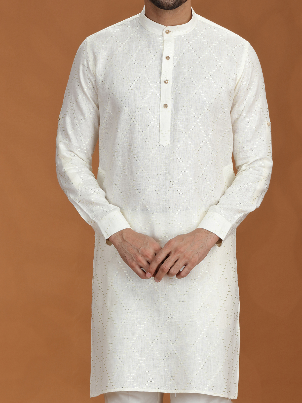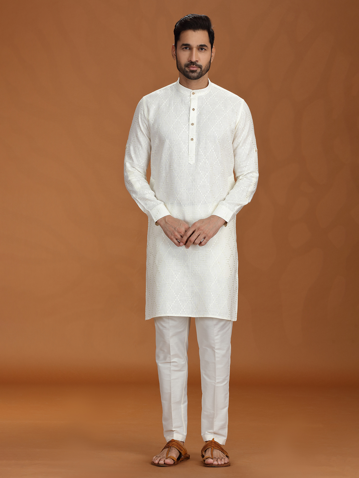 Graceful and poised, this off-white linen kurta set is detailed with elegant embroidery, offering a pristine look. The Chinese collar and soft fabric blend comfort with traditional flair. Ideal for groomsmen or daytime rituals, this outfit is a mark of understated elegance in modern ethnic fashion.