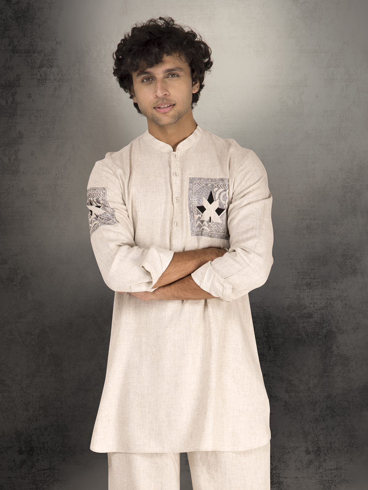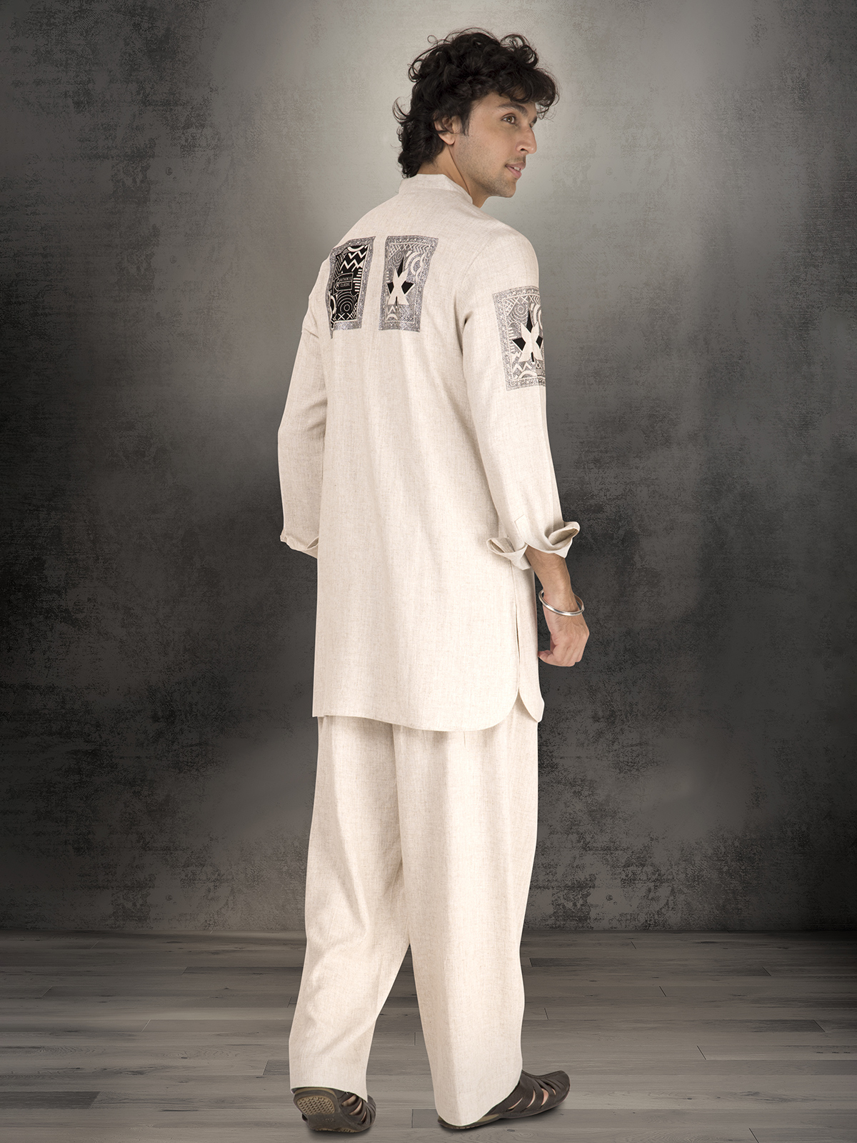 Softly printed in off-white linen cotton, this kurta suit exudes effortless sophistication. The mandarin collar adds a timeless finish, ideal for casual rituals, festive get-togethers, or day celebrations. Lightweight and stylish, it radiates relaxed charm.