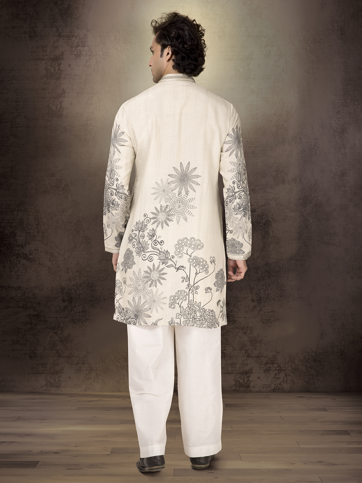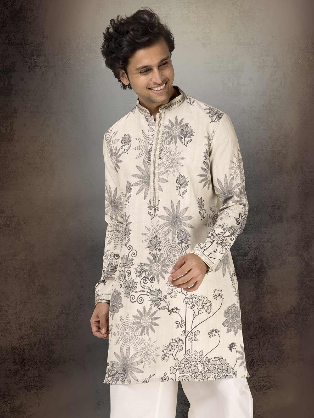 This off white printed kurta suit in linen cotton embodies serenity and style. The mandarin collar refines its silhouette, creating an elegant piece suited for festive and wedding occasions. Comes with a coordinating bottom.