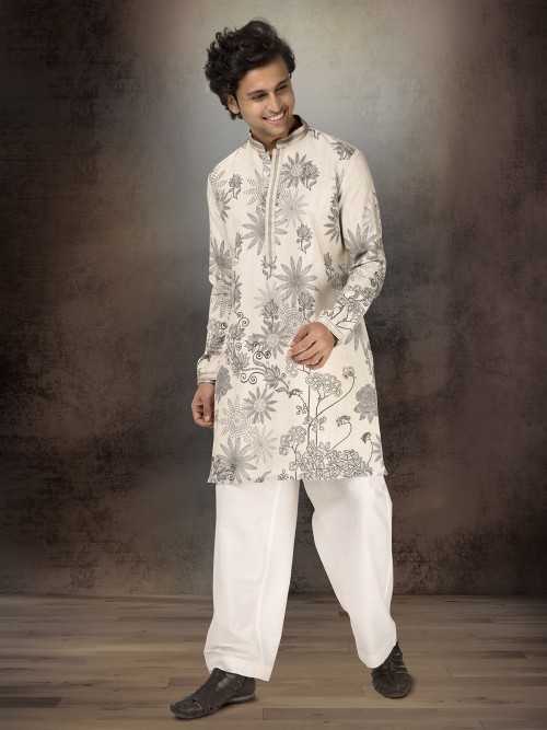 Off White Linen Cotton Printed Kurta Suit For Men Festive Wear