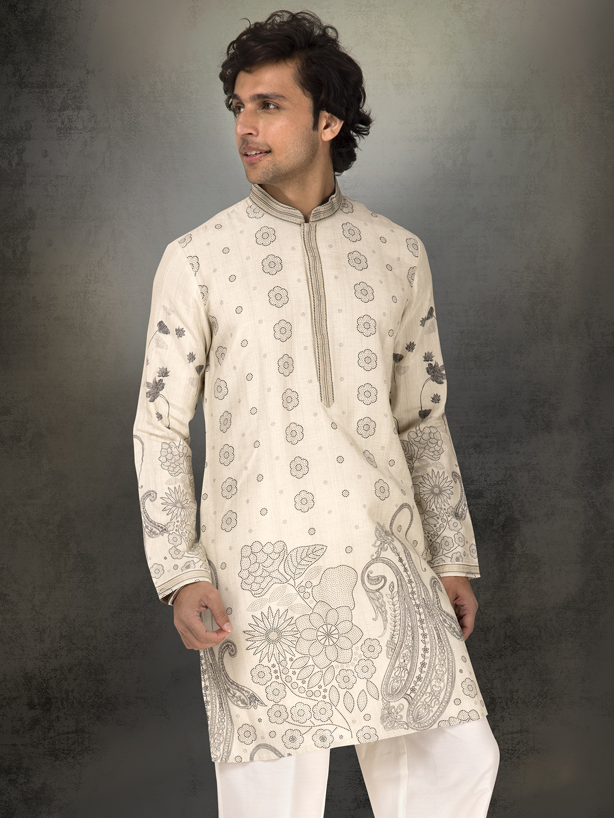 In soothing off white linen cotton, this printed kurta suit exudes subtle sophistication. The mandarin collar lends balance to its elegant frame, making it a graceful choice for wedding rituals and festive gatherings. Comes with a bottom.