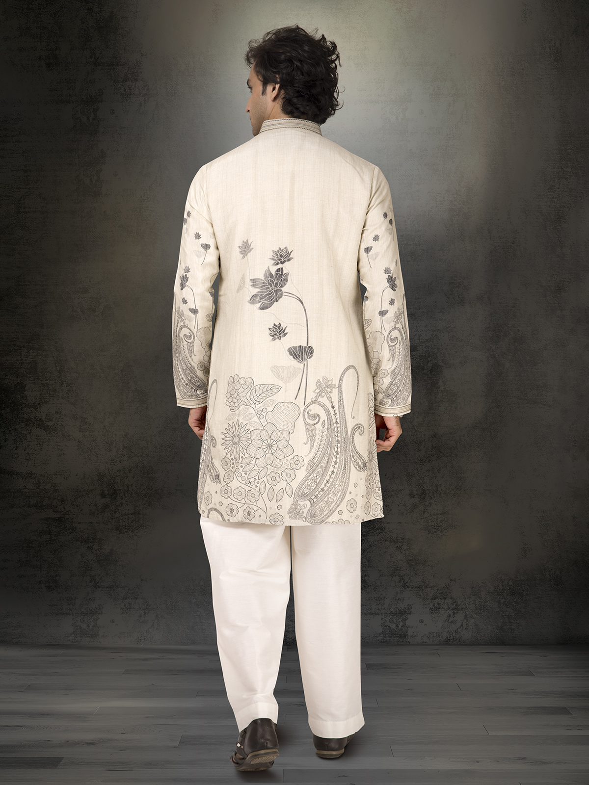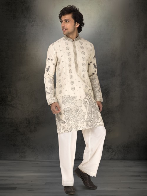 Off White Linen Cotton Printed Kurta Suit For Men Wedding Wear