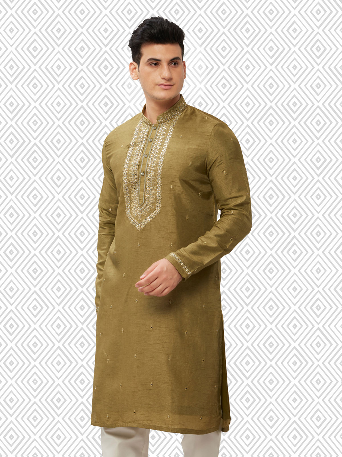 Wear this olive kurta suit prior to the function to get ready for the elegant look. A sophisticated olive cotton silk fabric with long sleeves, a mandarin collar, and a stunning embroidery, mirror work. A matching bottom is also provided.