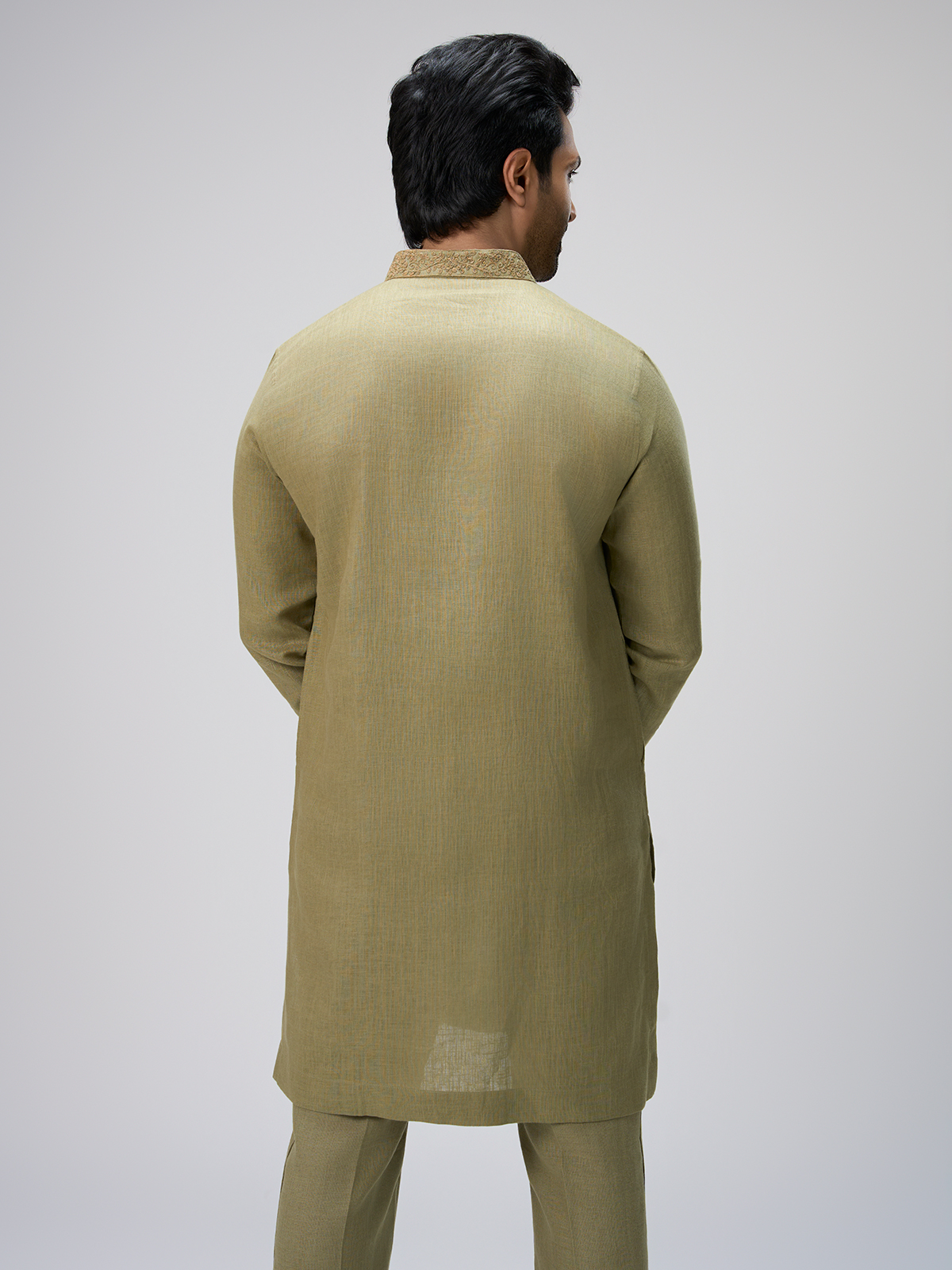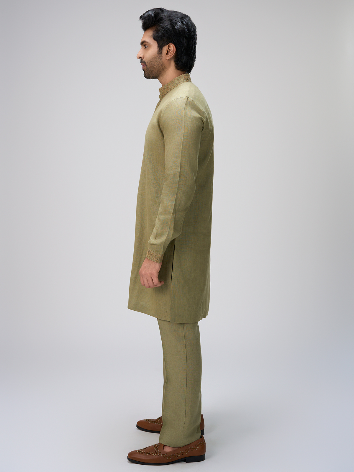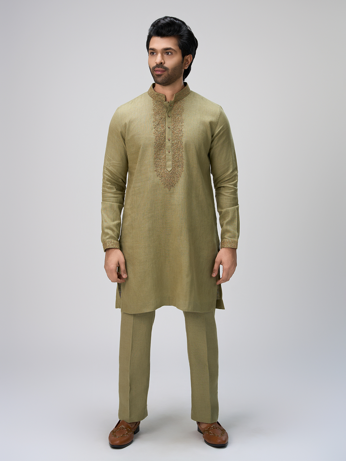 An olive linen kurta enriched with thread detailing brings a calm, textured beauty ideal for mehendi and festive moments. The chinese collar creates balance, while the pant keeps the look relaxed and refined.