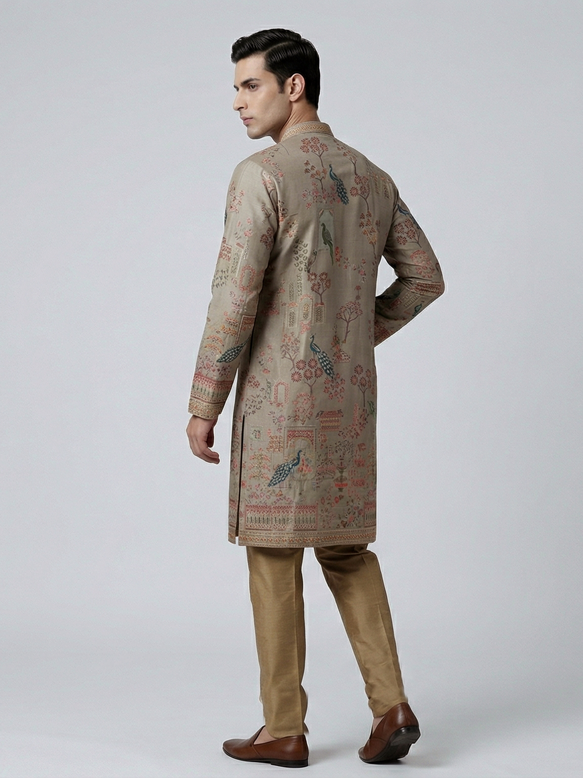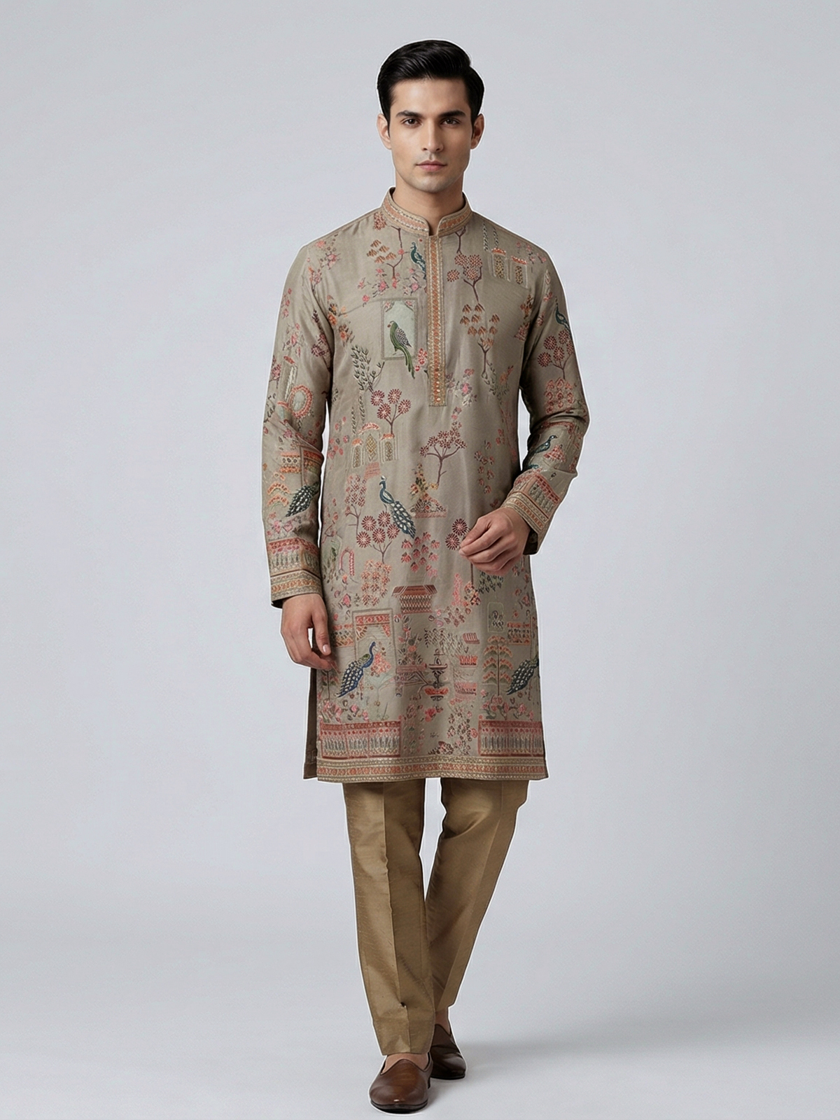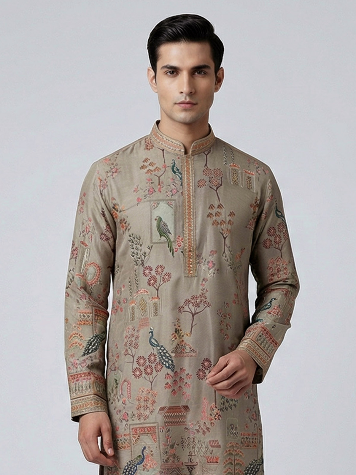 Earthy olive tones define this silk kurta set crafted for elegant festive wear. Adorned with printed patterns and thread with sequin detailing, it offers a gentle shimmer. The mandarin collar enhances its refined silhouette, while the soft fabric ensures comfort. Paired with pants, this outfit is ideal for festive gatherings with understated charm.