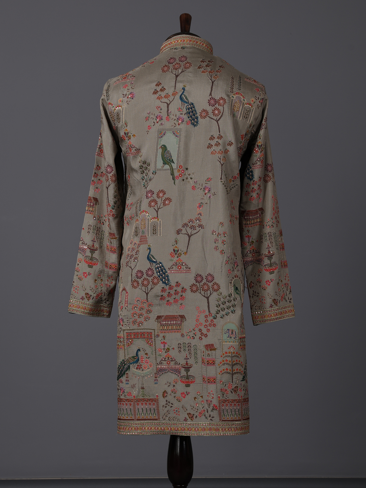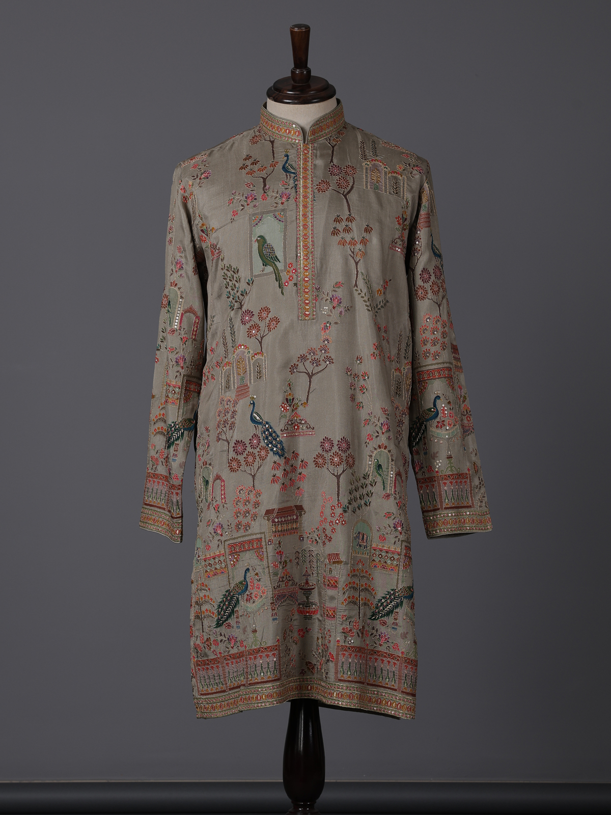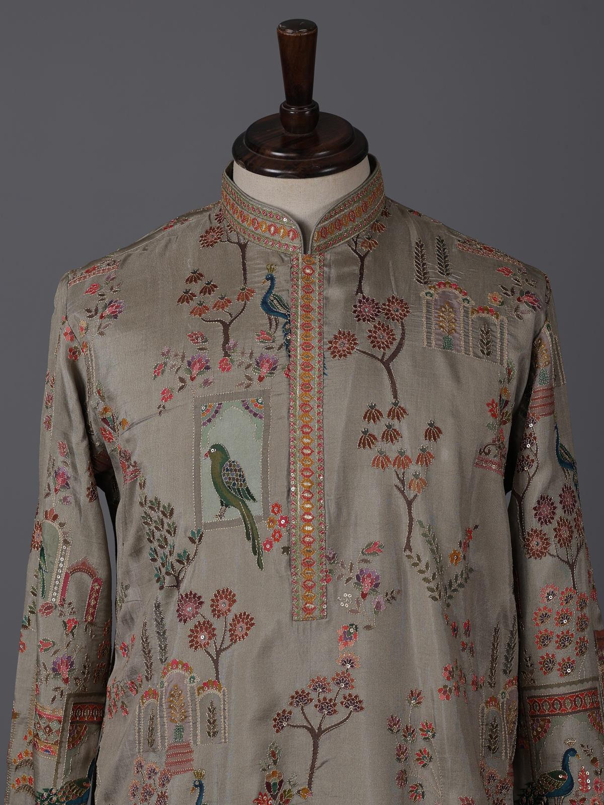 Earthy olive tones define this silk kurta set crafted for elegant festive wear. Adorned with printed patterns and thread with sequin detailing, it offers a gentle shimmer. The mandarin collar enhances its refined silhouette, while the soft fabric ensures comfort. Paired with pants, this outfit is ideal for festive gatherings with understated charm.
