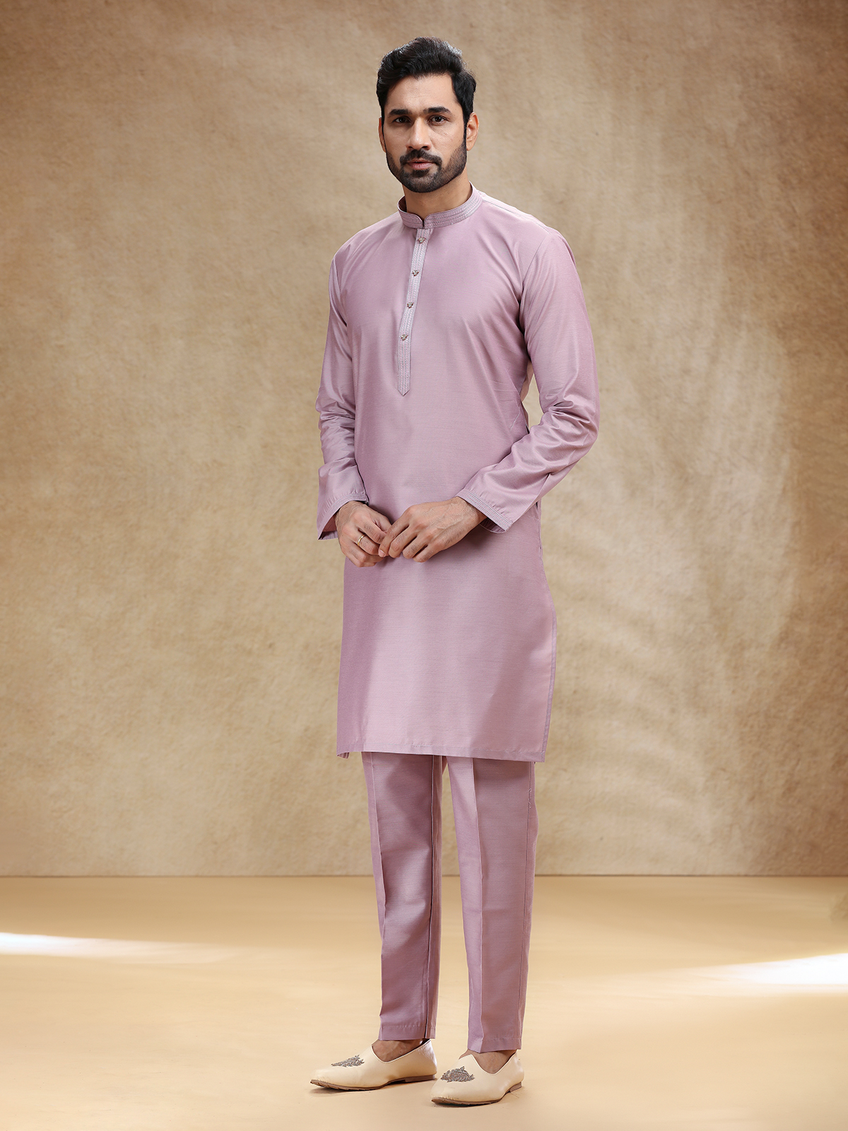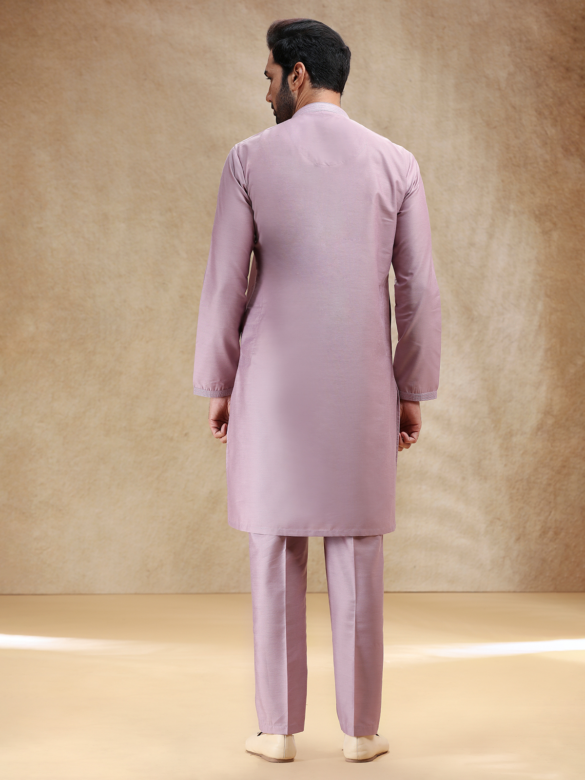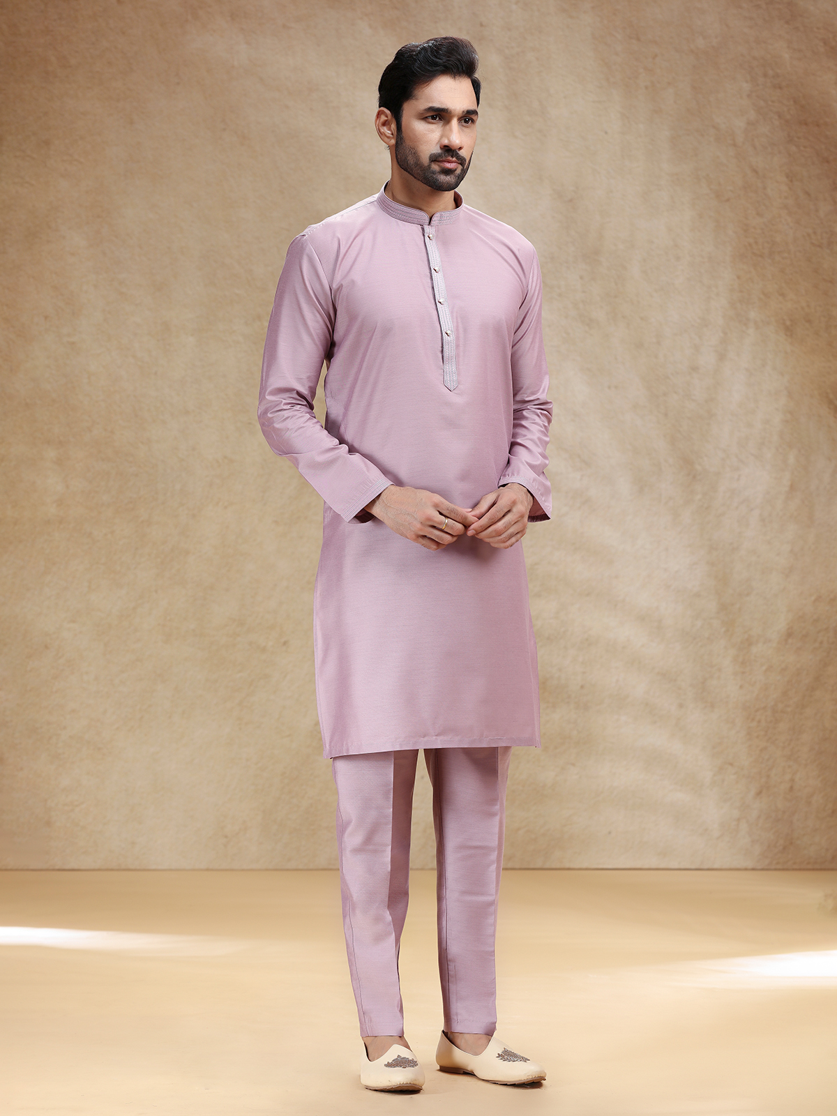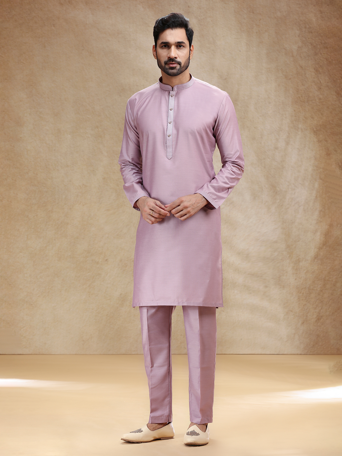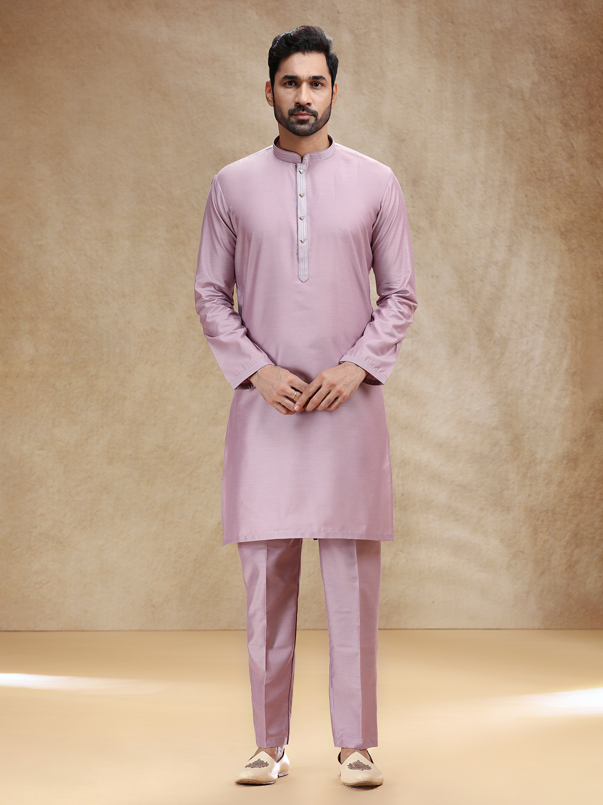 In onion pink cotton silk, this kurta reflects soft sophistication with its stand collar and full sleeves. A graceful attire for pooja and festive celebrations, it glows with delicate charm. The set is styled with a plain pant bottom for balance.