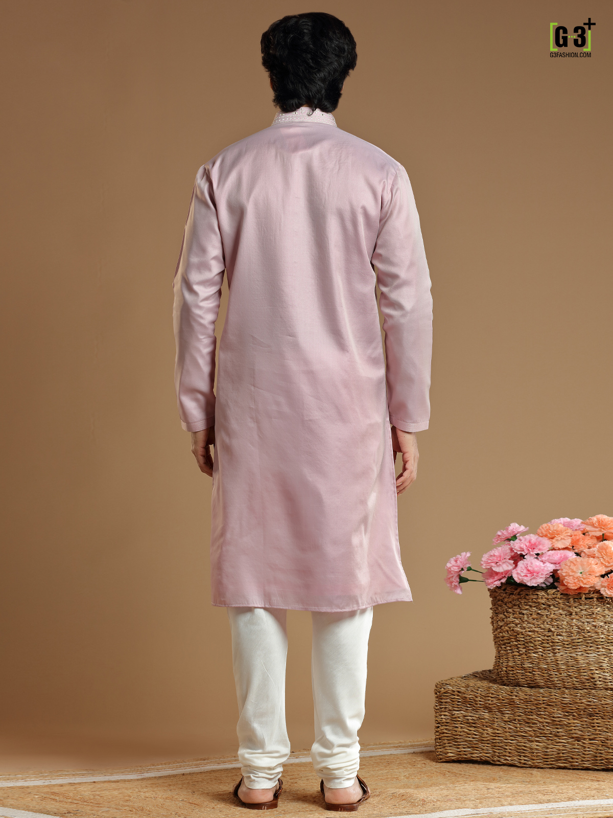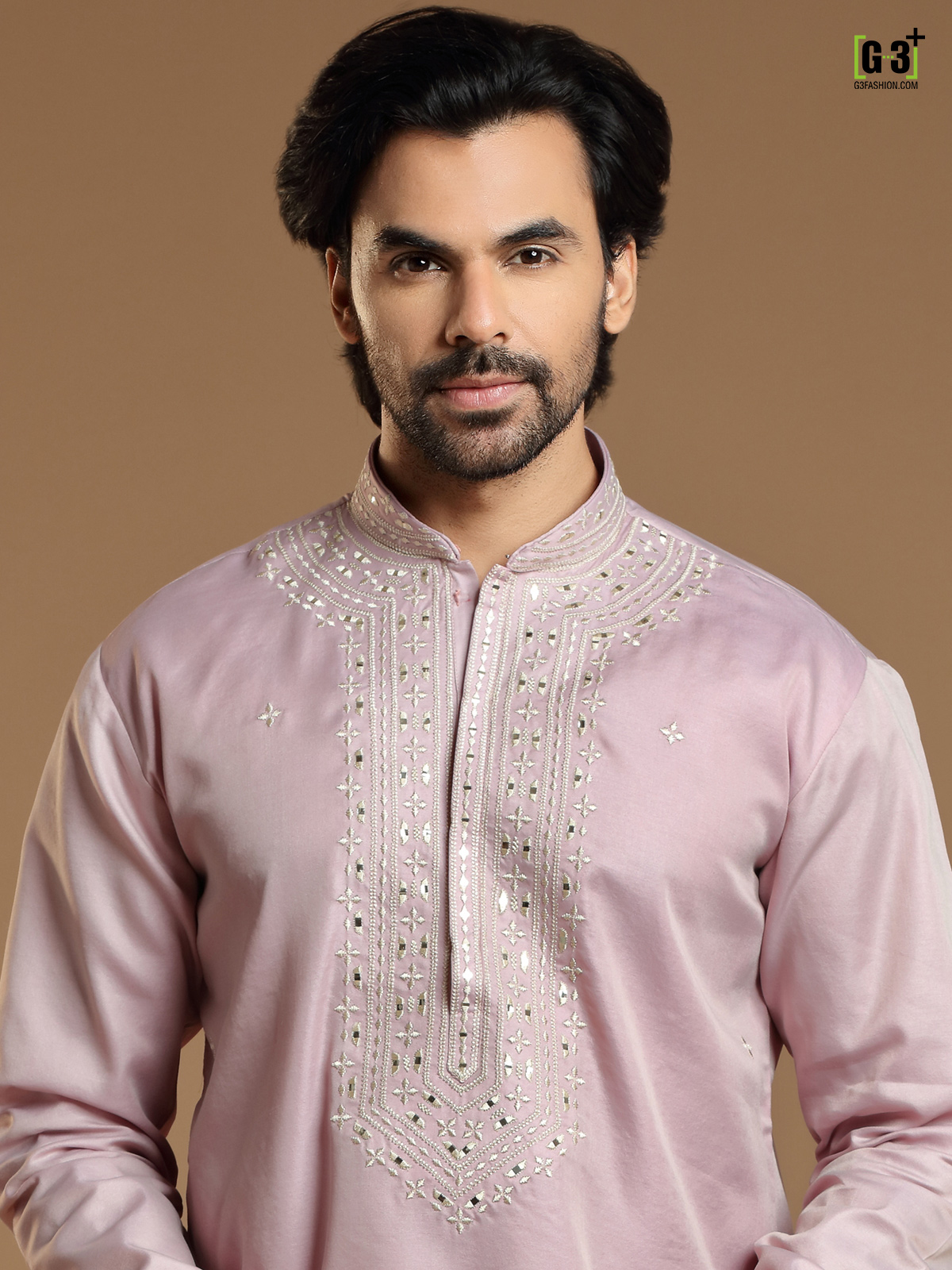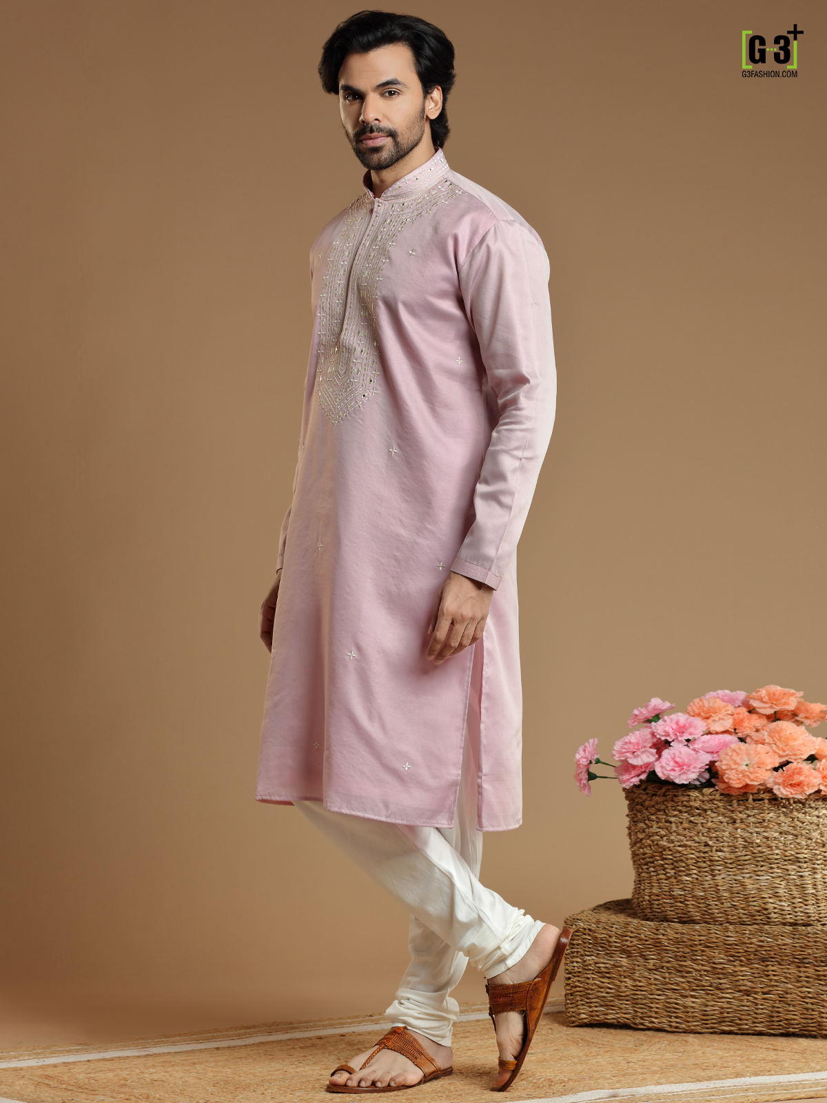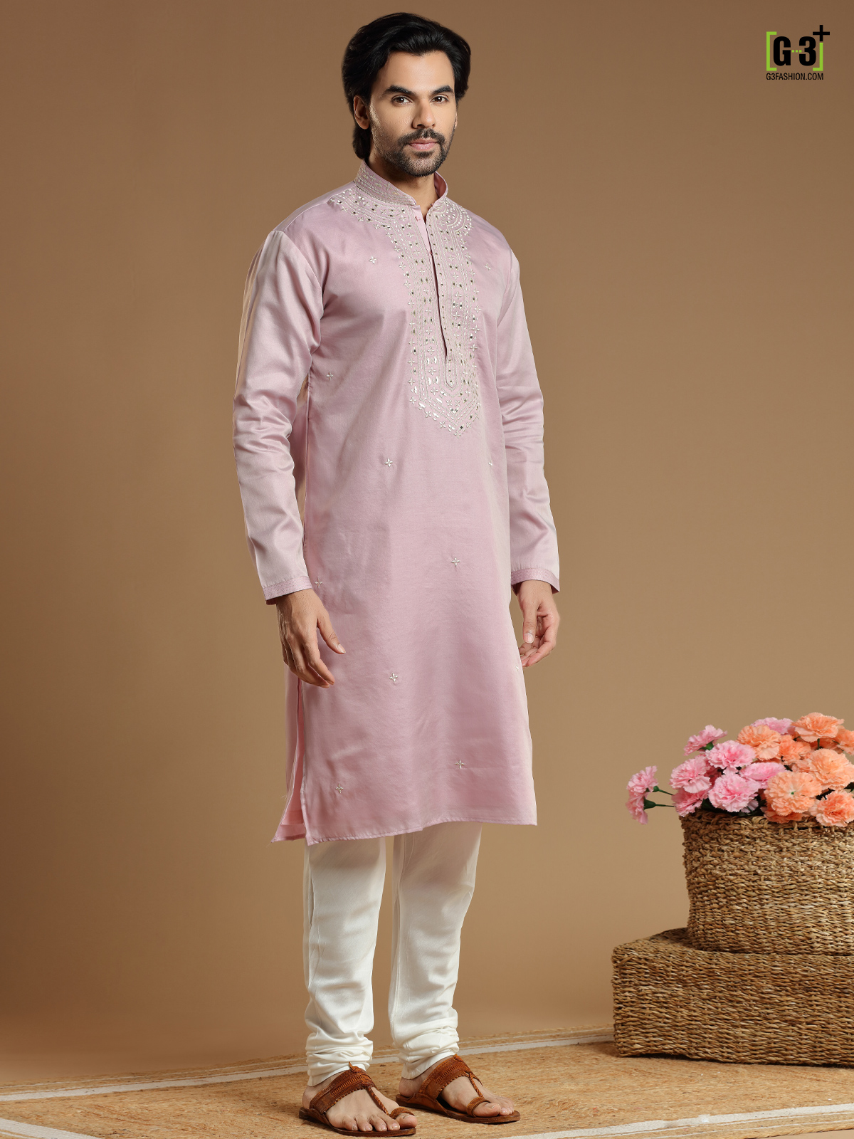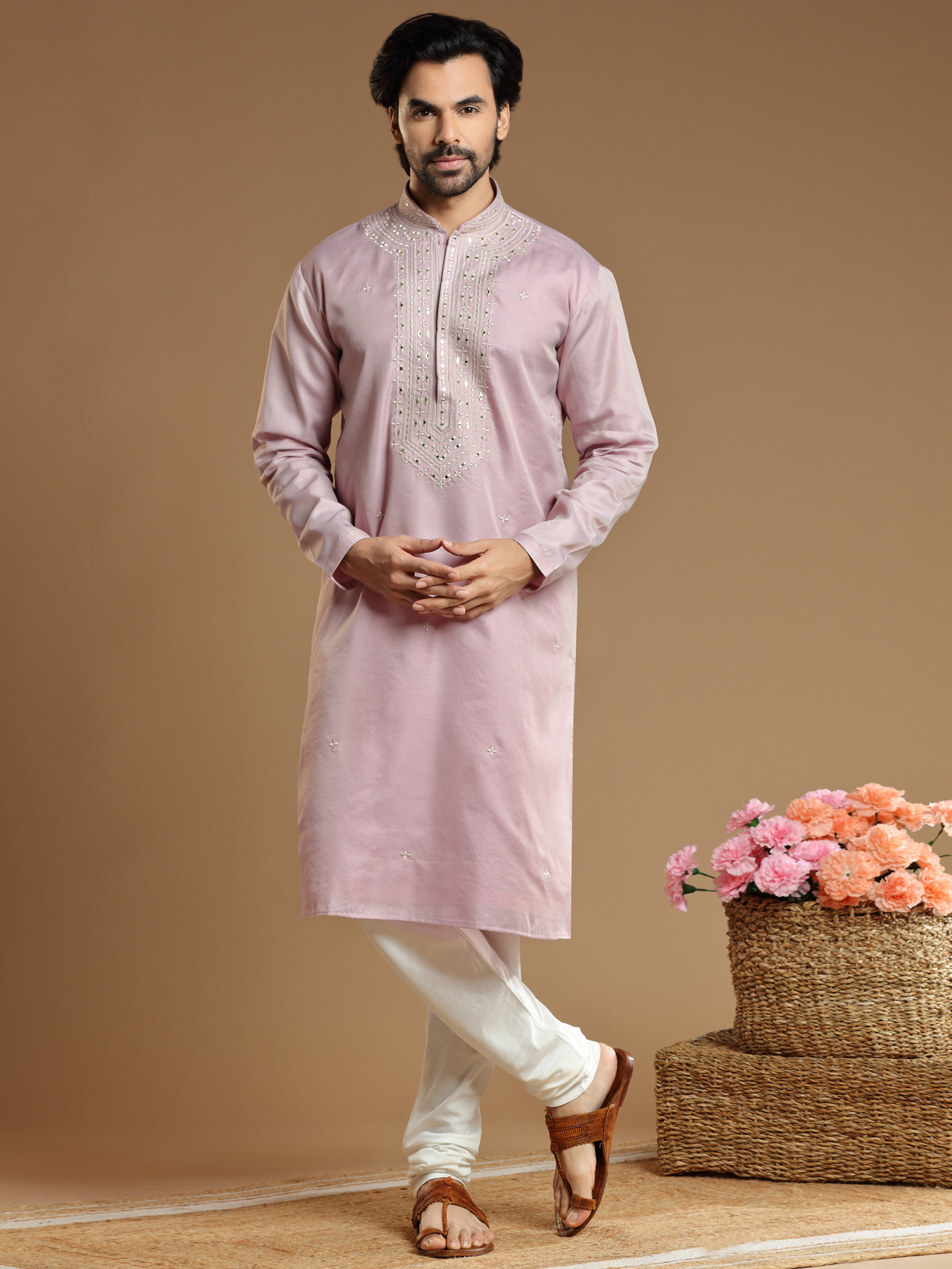 Achieve a stunning look in any festive function with this onion pink cotton silk kurta suit. It features thread and sequin work, as well as a stand collar neck, full sleeves, and a straight hemline. This set also comes with a bottom.