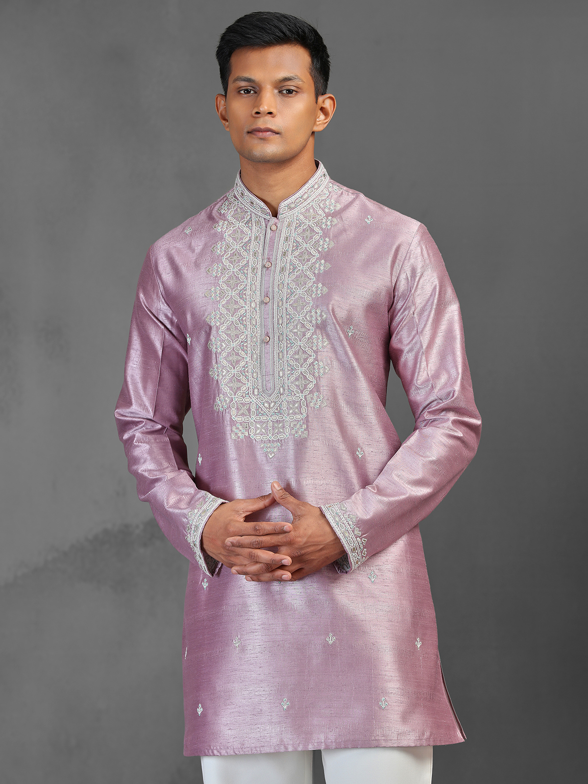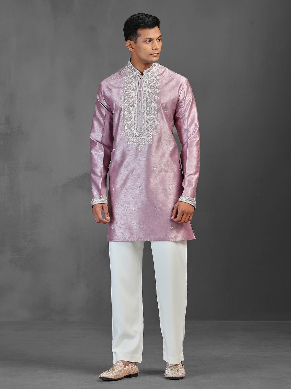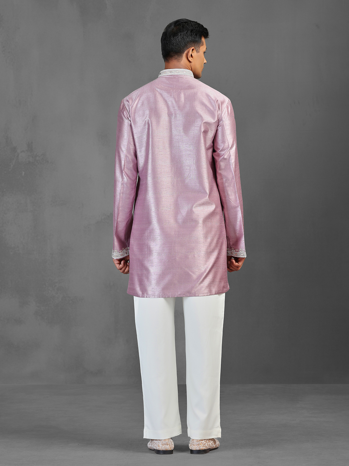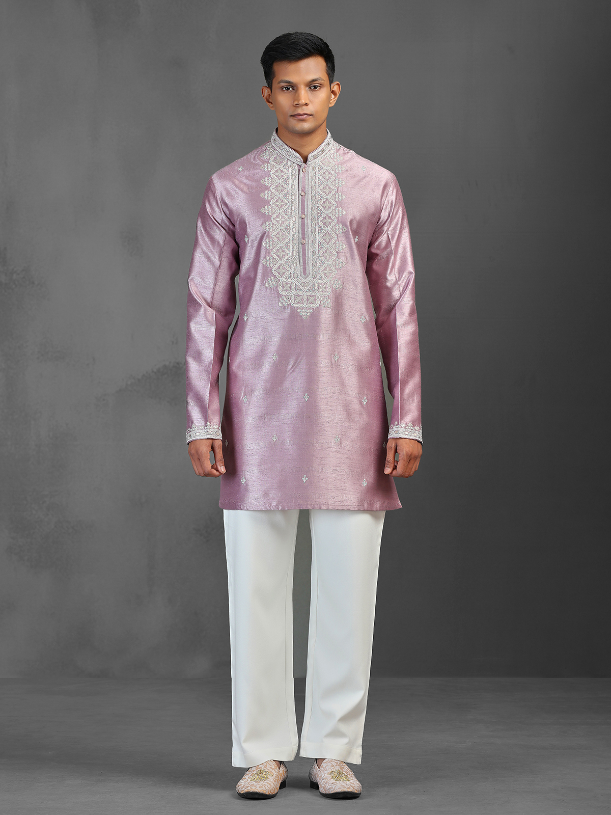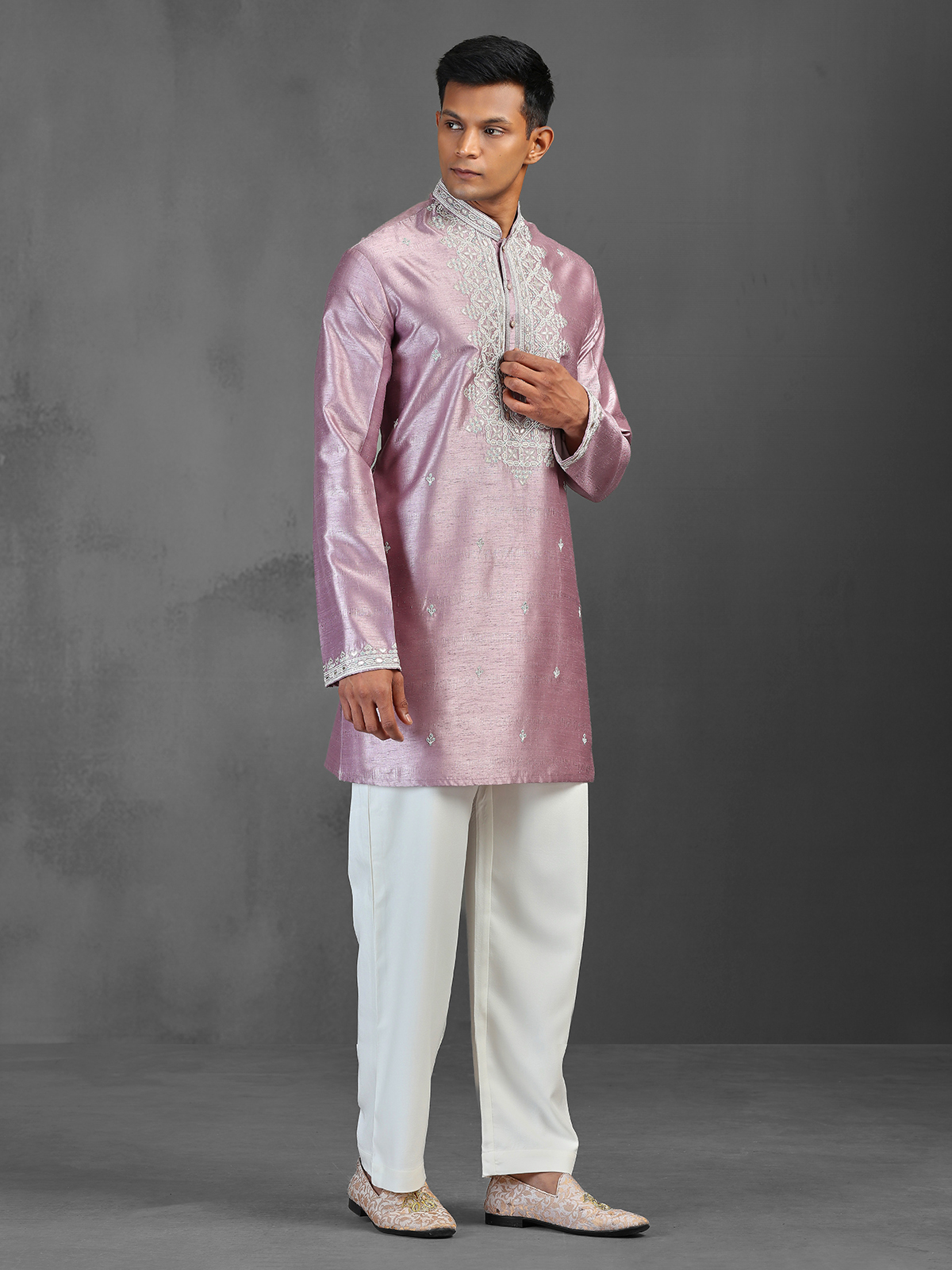 This contemporary onion pink silk kurta set features a mid-length, straight-cut silhouette crafted from smooth, rich fabric for a refined festive look. The design is elevated with intricate zari, zardosi, and thread embroidery along the Chinese collar, sleeve cuffs, and central placket, adding a sophisticated shimmer. Paired with straight-fit trousers, it is ideal for weddings, sangeet, and festive celebrations.