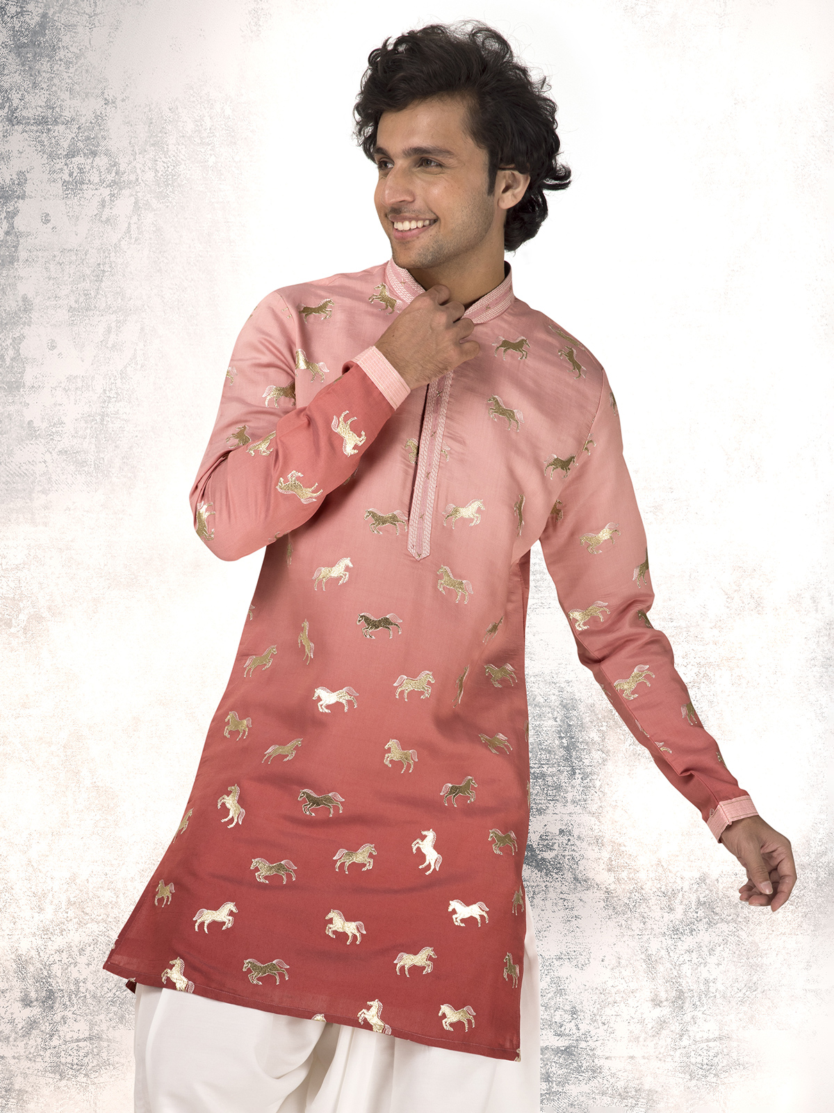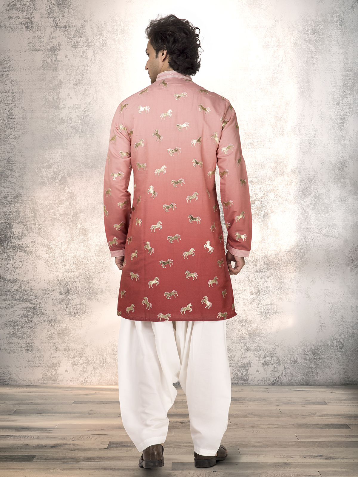 In shaded onion pink silk, this kurta suit blooms with graceful resham embroidery. The mandarin collar and salwar pairing lend romantic elegance. Ideal for weddings and festive soirées, it radiates refined charm in every thread.