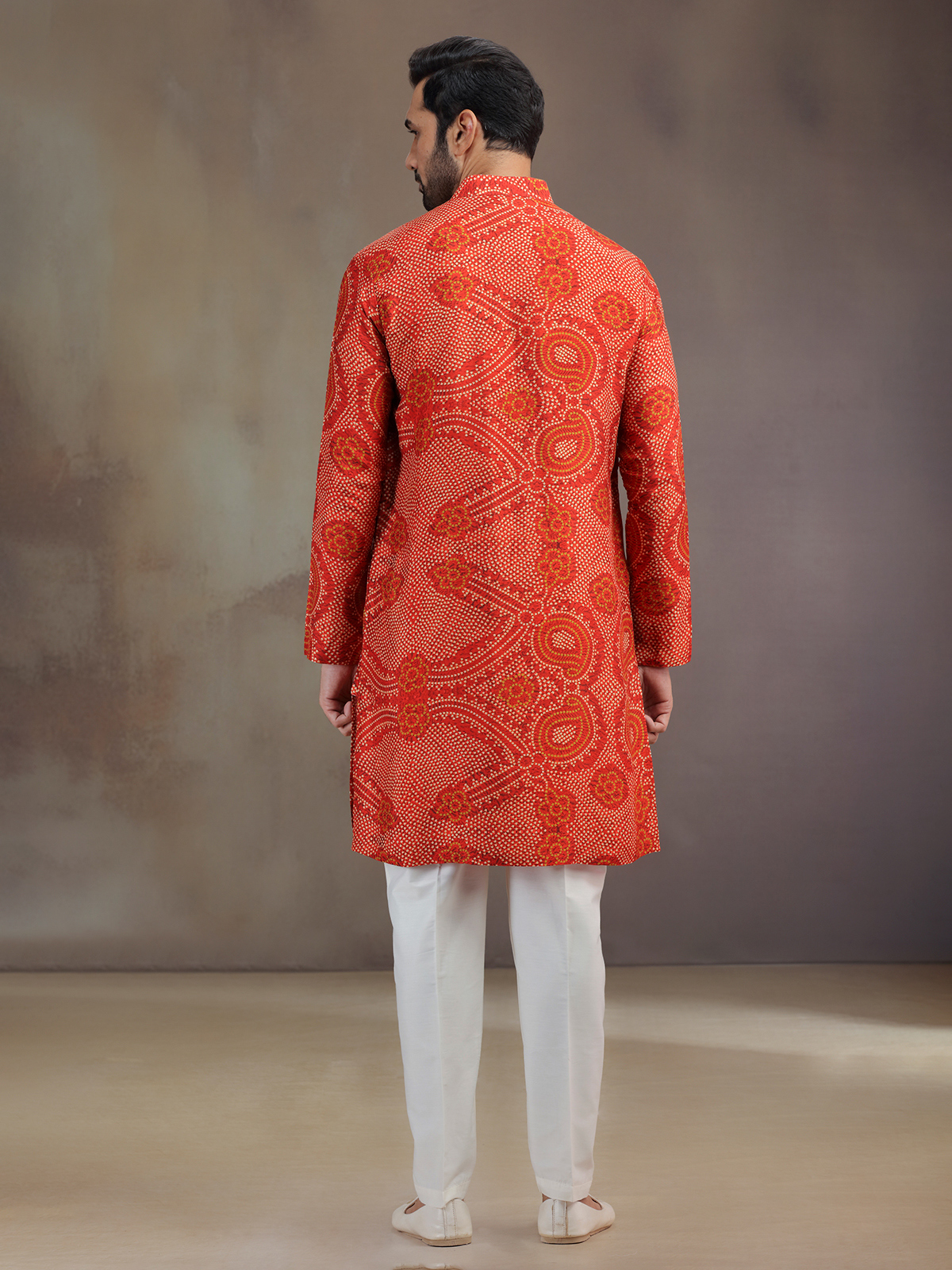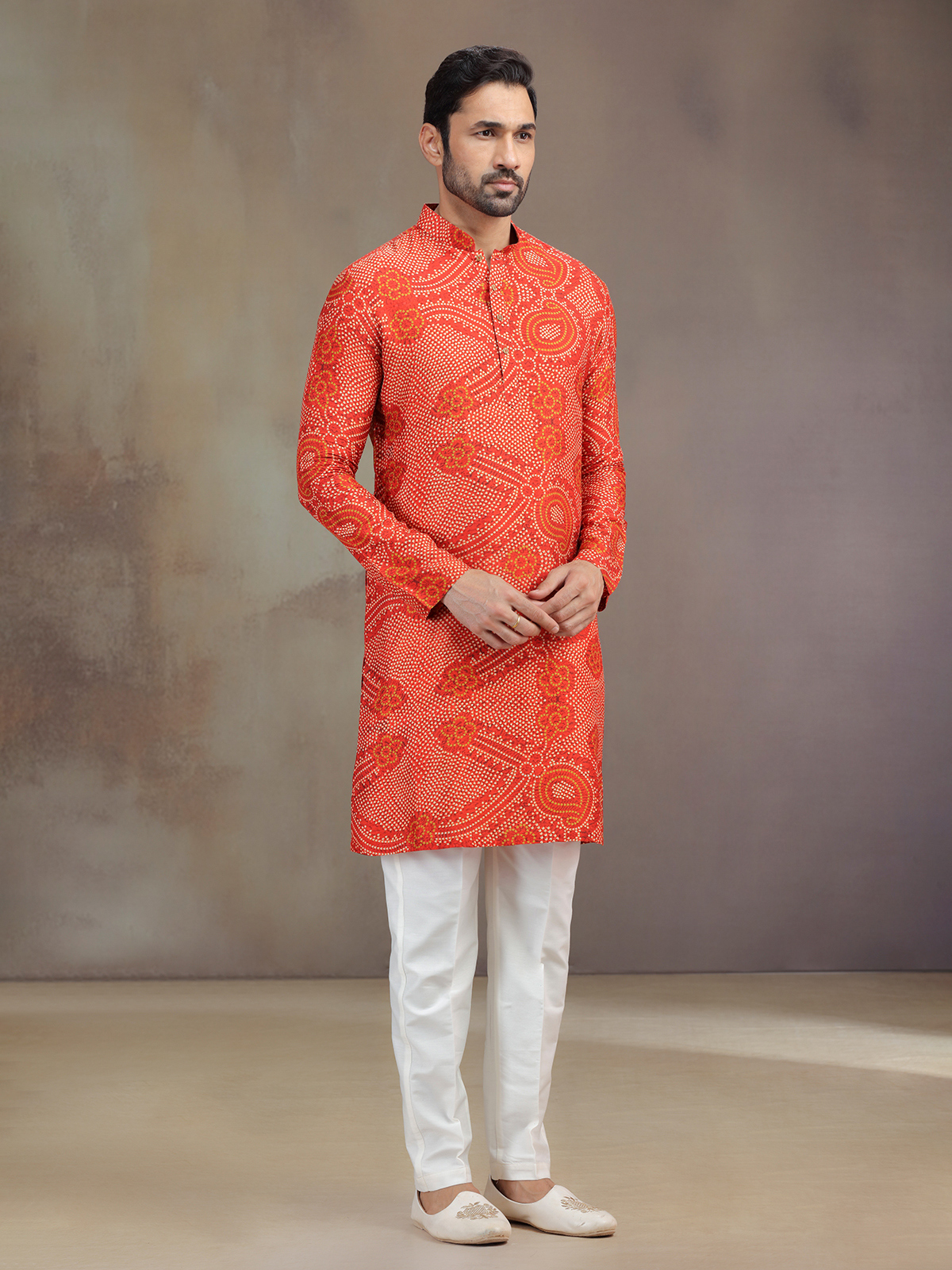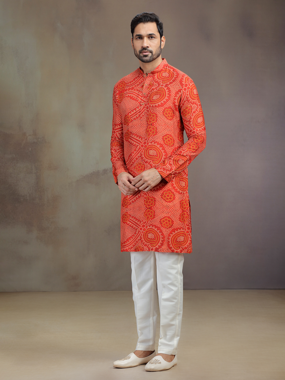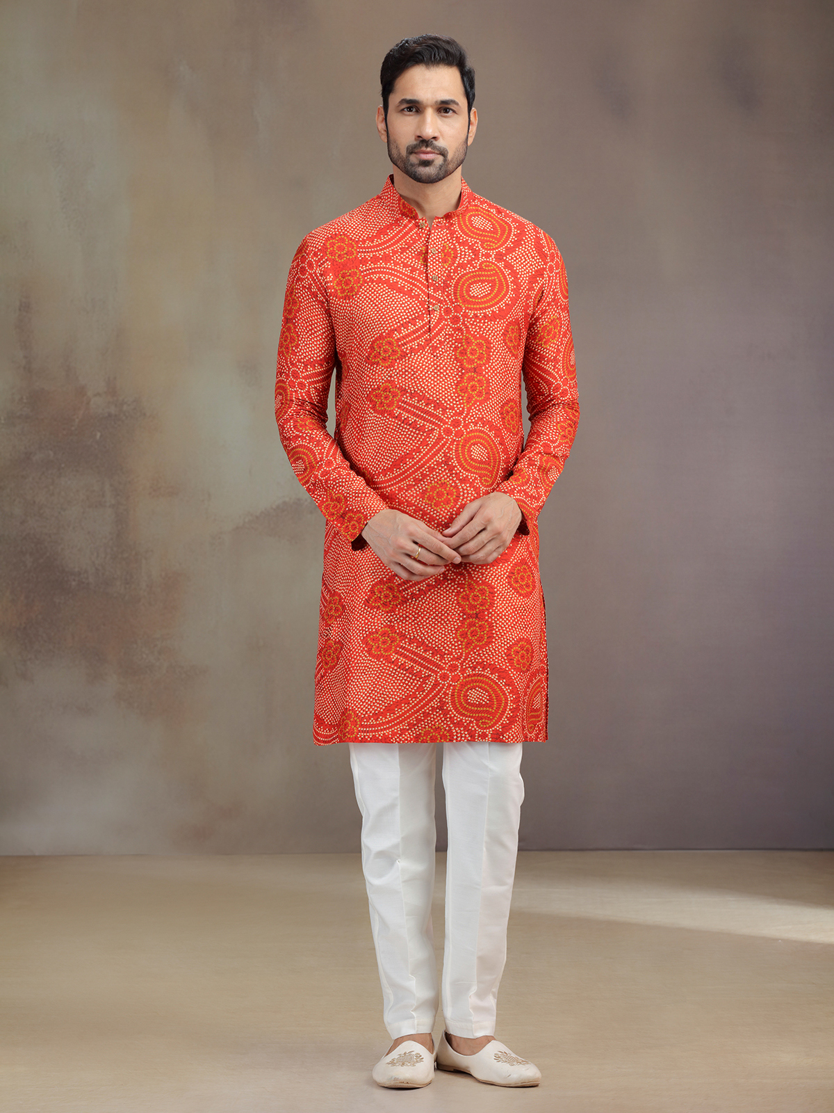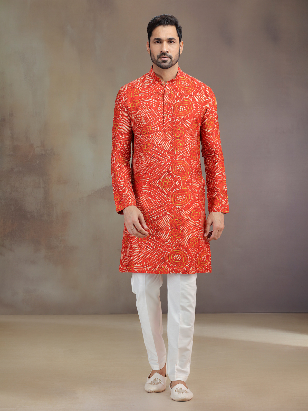 Vibrant as sunrise, this orange silk printed kurta pajama radiates joy. The intricate work enhances its mandarin collar, and full sleeves, giving it festive charm. Styled with pants, it embodies cultural warmth, making it an ideal attire for special celebrations.