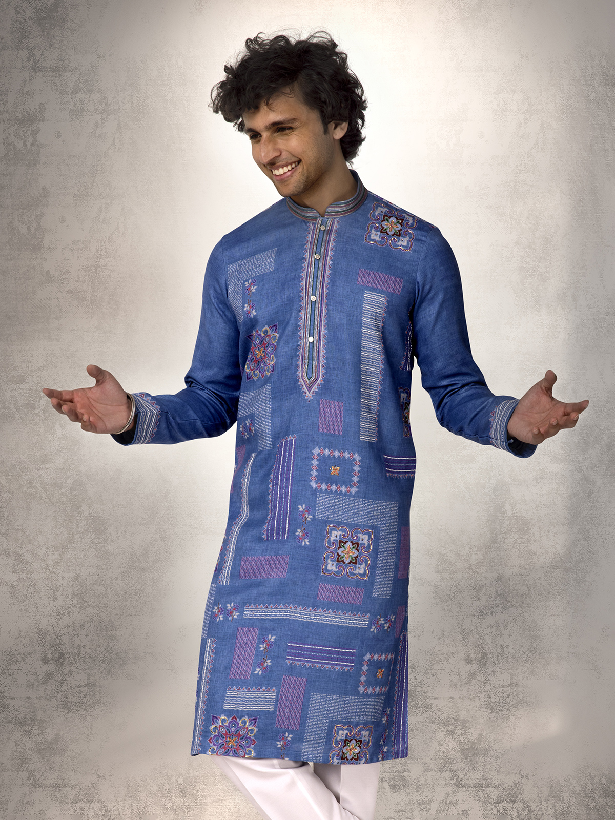 Rendered in painted blue linen cotton, this kurta suit shines with resham and sequins embellishment. The mandarin collar enhances its regal contour, paired with pants for a polished finish. Ideal for festive occasions, weddings, or cultural events.