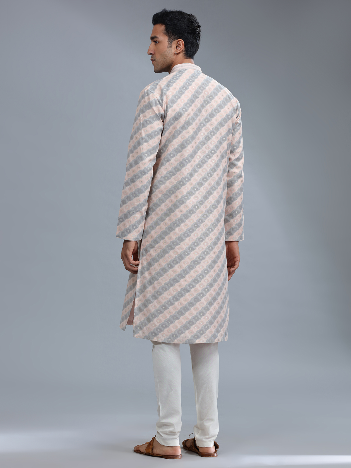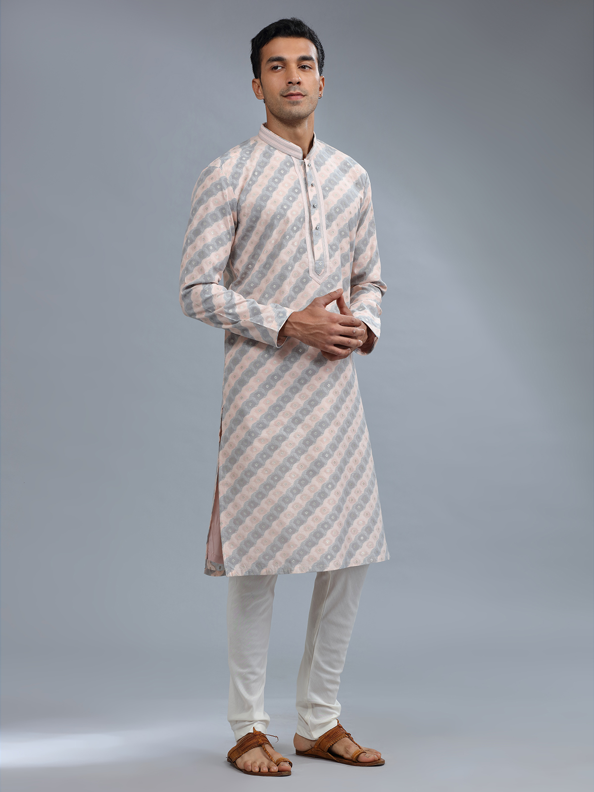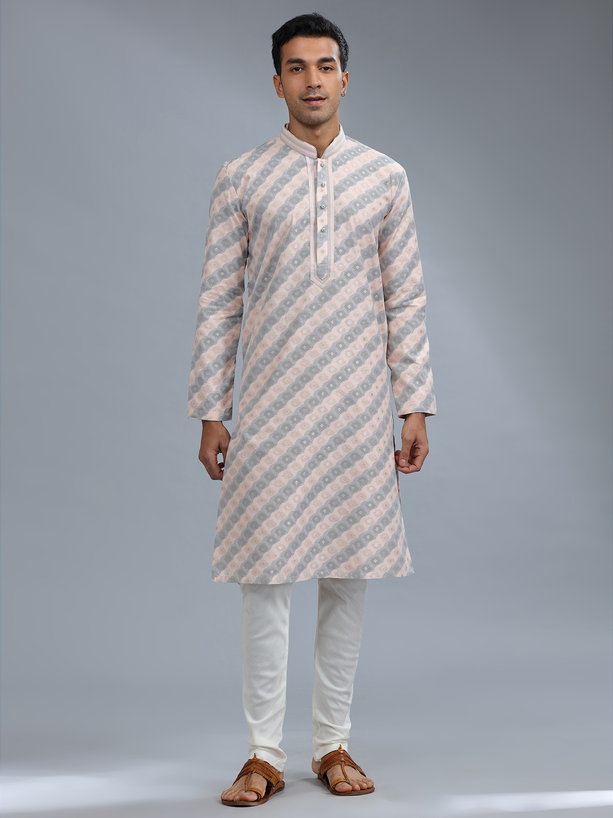 Step into the spotlight with our peach and grey silk stripe kurta pajama. This ensemble features intricate zari weaving, full sleeves, and a mandarin collar, and comes with a bottom.