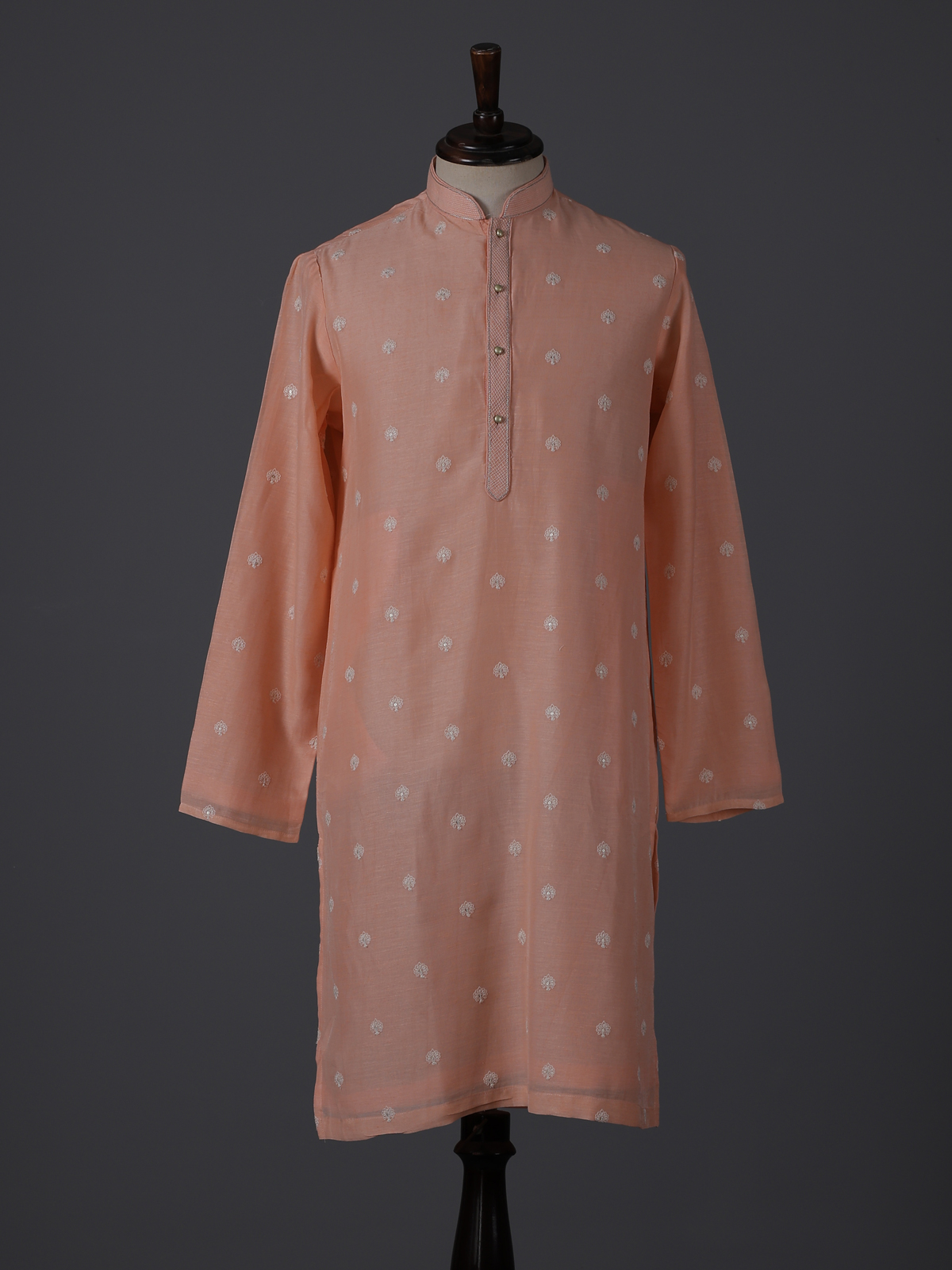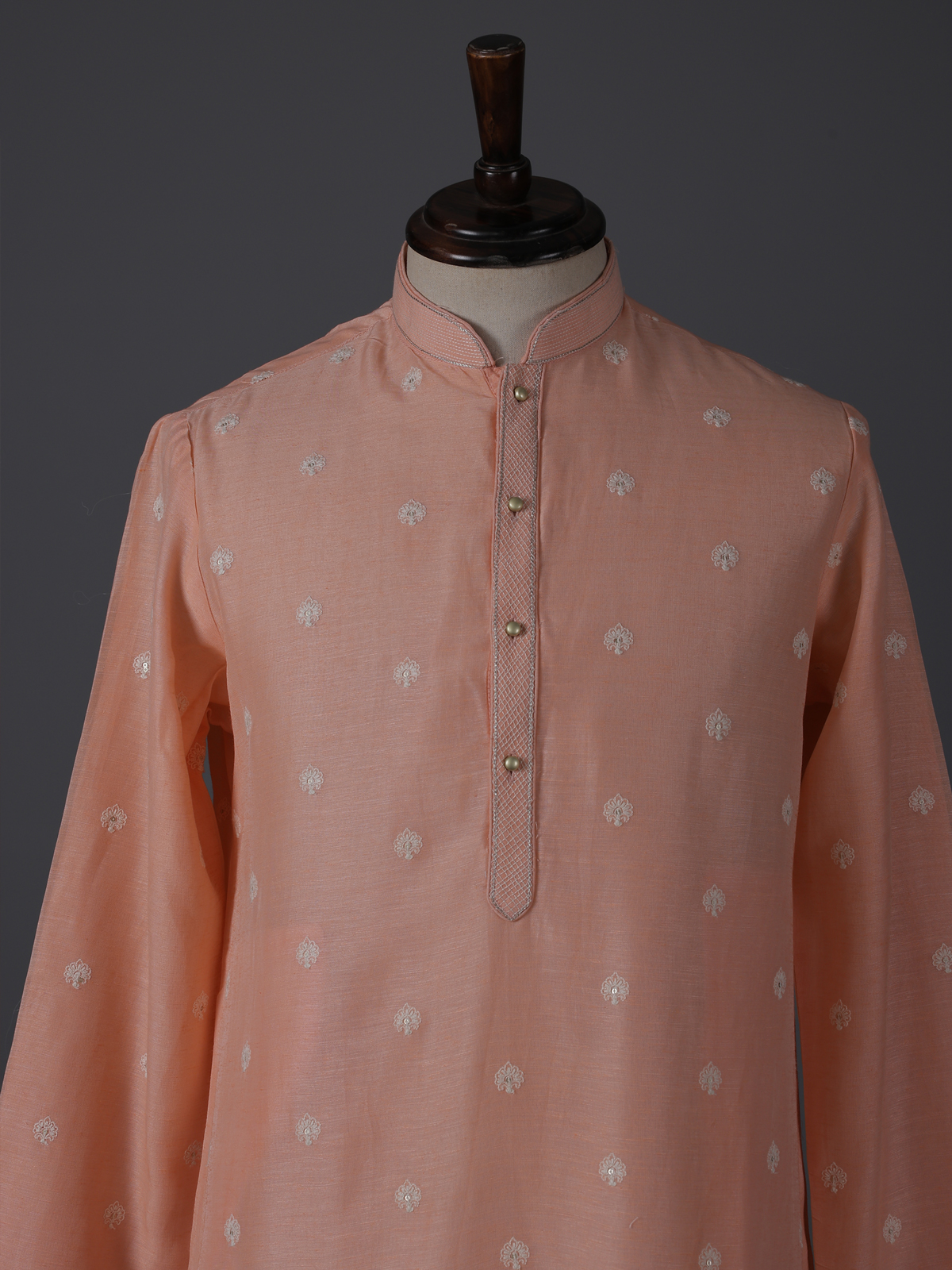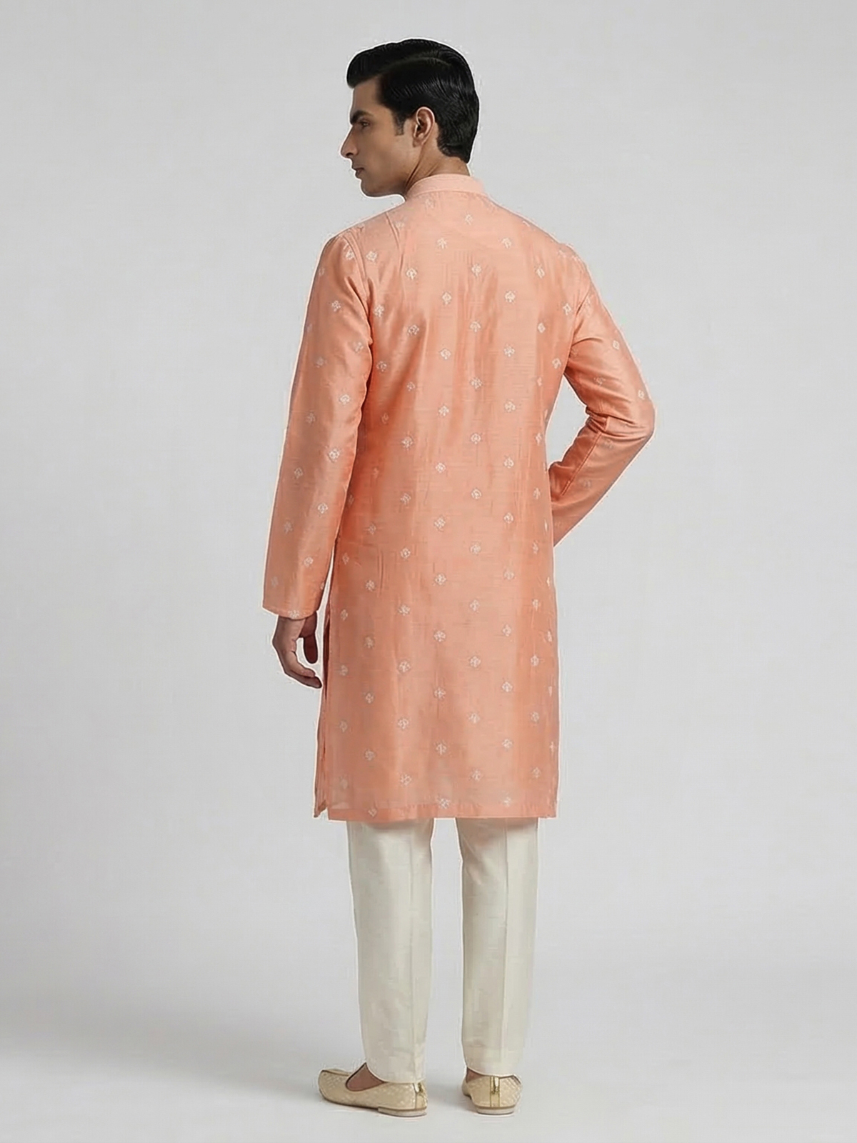 Soft tones meet festive artistry in this peach cotton kurta suit. Designed with a refined mandarin collar, the kurta is beautifully enhanced with delicate embroidery and shimmering sequins that bring subtle elegance to the ensemble. Crafted in breathable cotton fabric and paired with tailored pants, this outfit offers comfort and style, ideal for eid celebrations and festive sangeet gatherings.