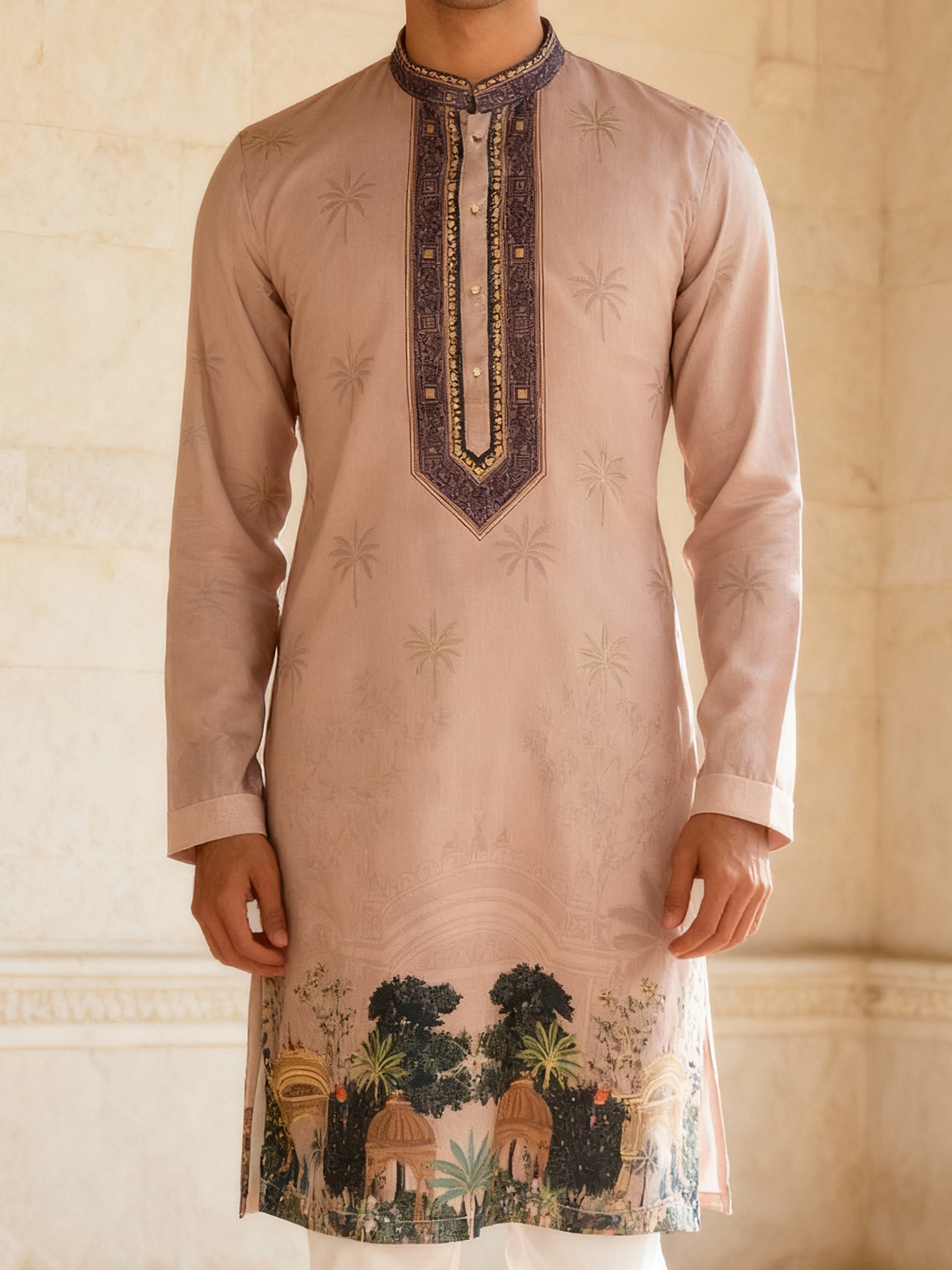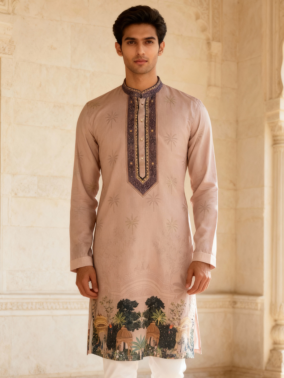 Crafted in soft peach cotton silk, this daman printed kurta exudes festive sophistication. Styled with a refined Chinese collar and full sleeves, it pairs with coordinated pants for a polished traditional look, perfect for family gatherings and celebrations.
