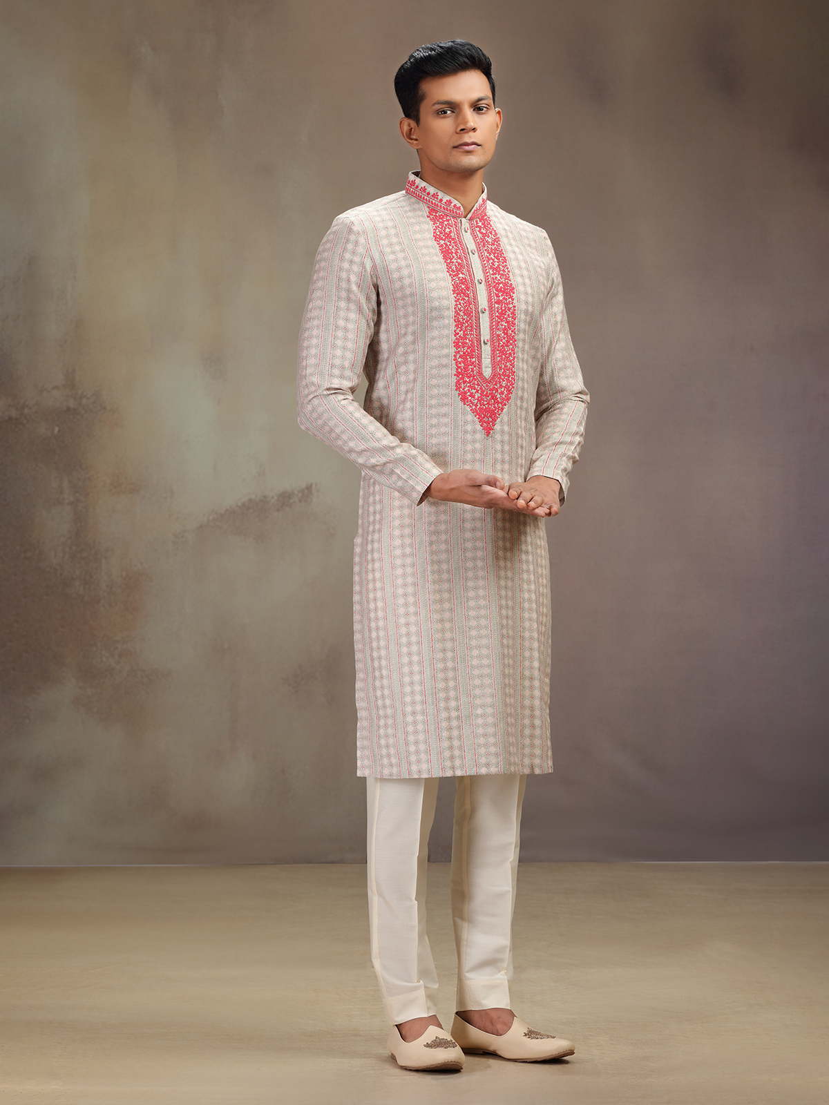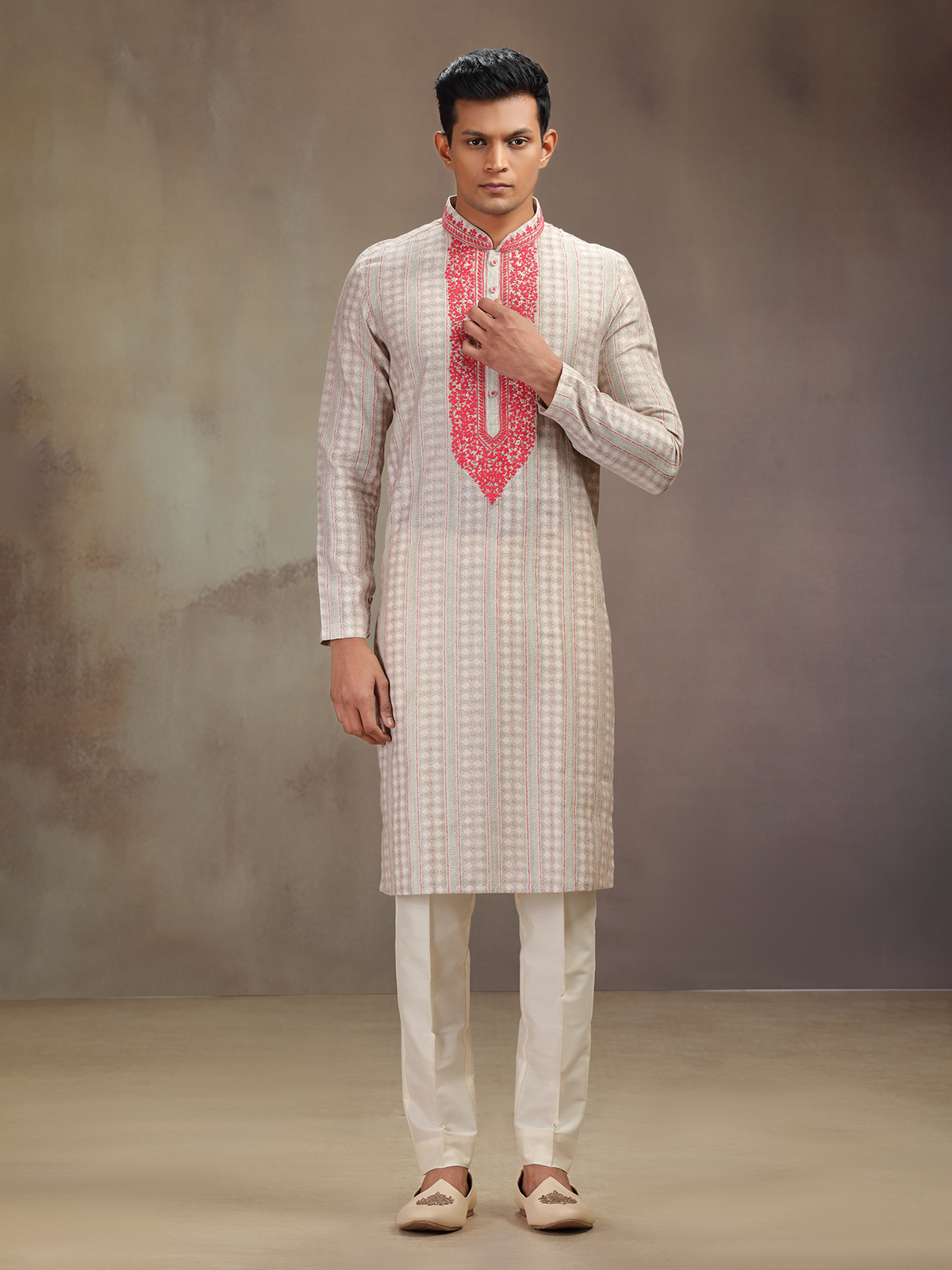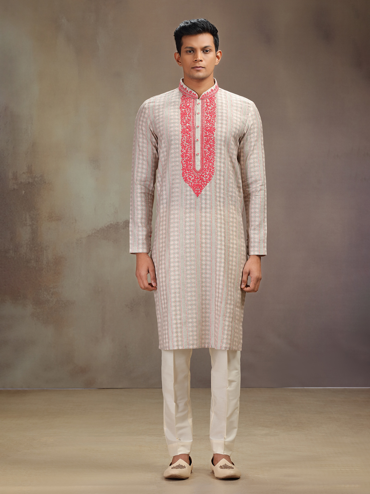 Radiant peach silk glows warmly, enhanced with delicate thread and bead work that twinkle like morning light. The mandarin collar and full sleeves add balanced refinement. Completed with a matching pant, this kurta pajama fuses artistry and festive vibrance, creating a harmonious blend of tradition and contemporary elegance.