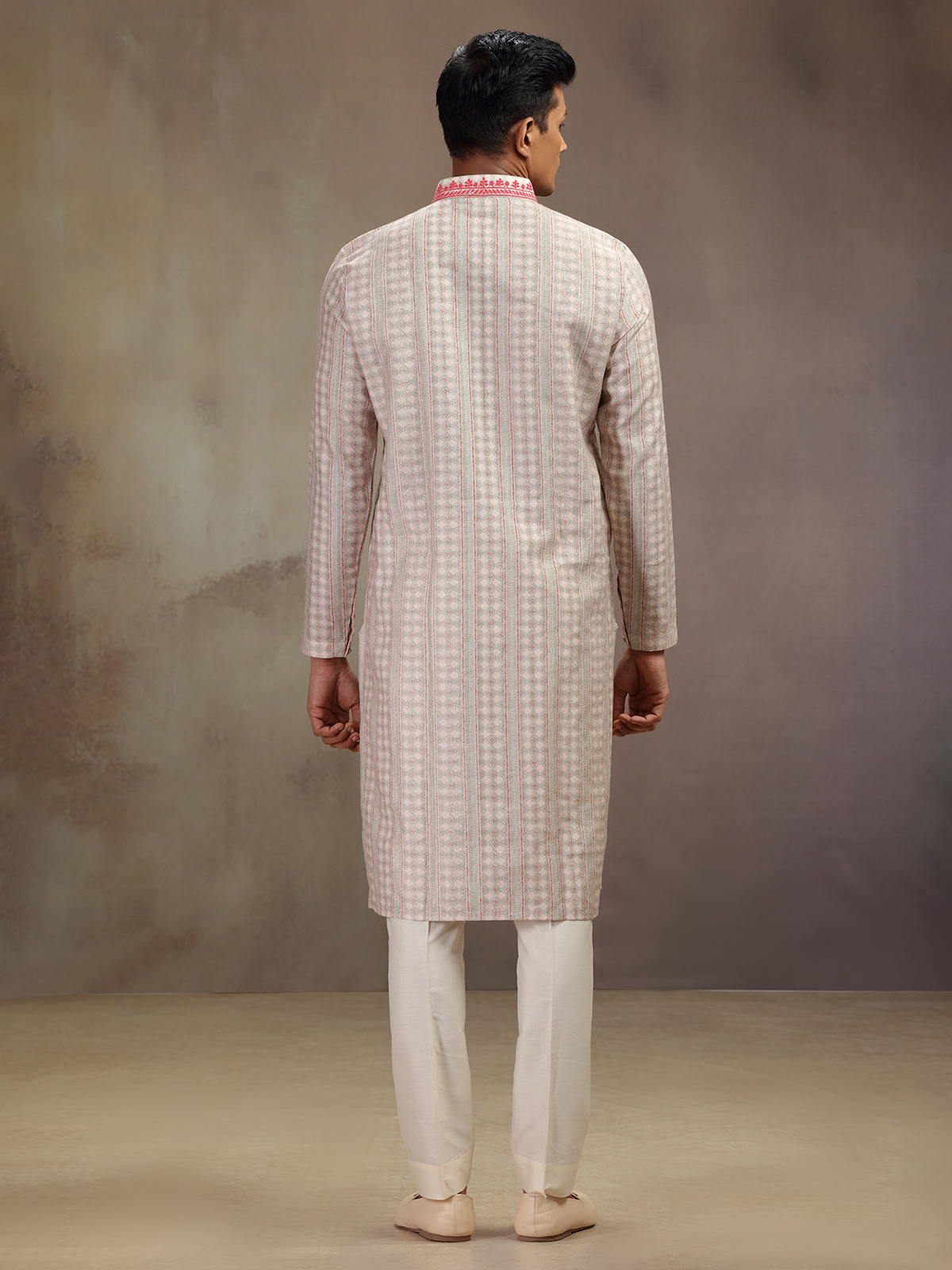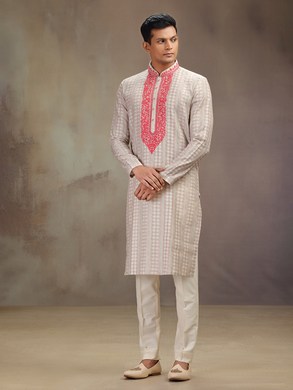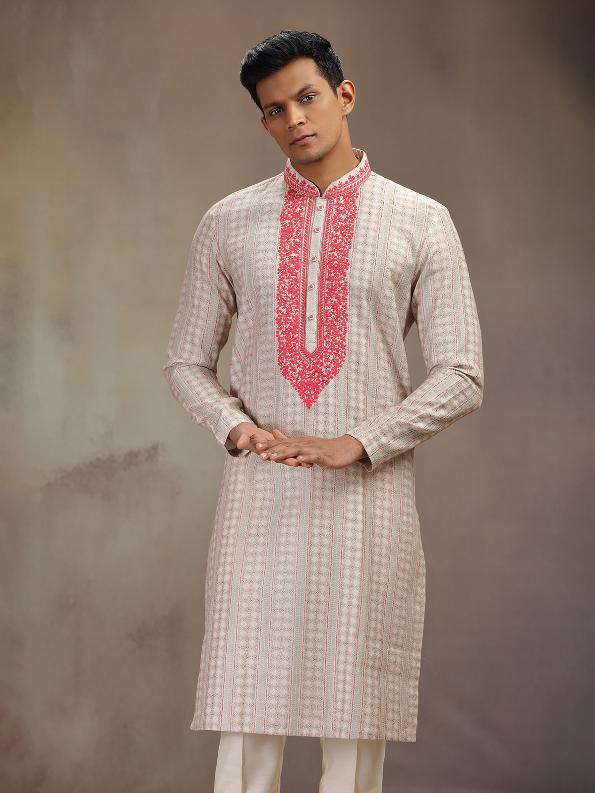 Radiant peach silk glows warmly, enhanced with delicate thread and bead work that twinkle like morning light. The mandarin collar and full sleeves add balanced refinement. Completed with a matching pant, this kurta pajama fuses artistry and festive vibrance, creating a harmonious blend of tradition and contemporary elegance.
