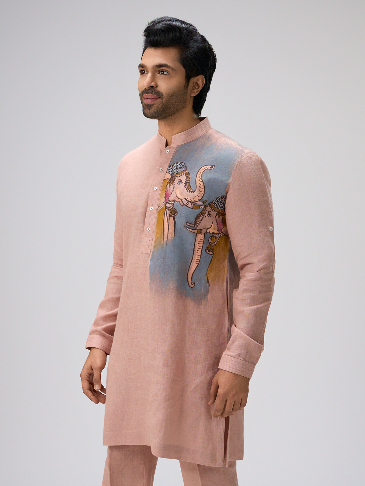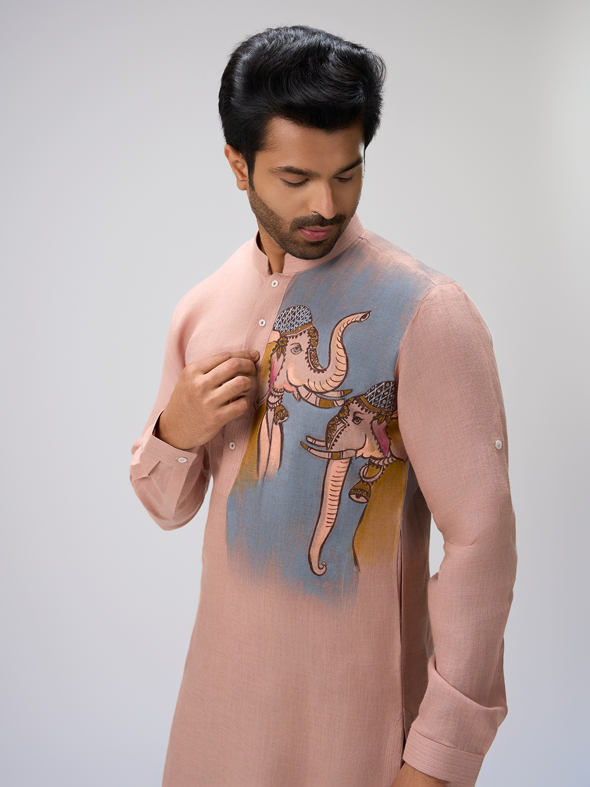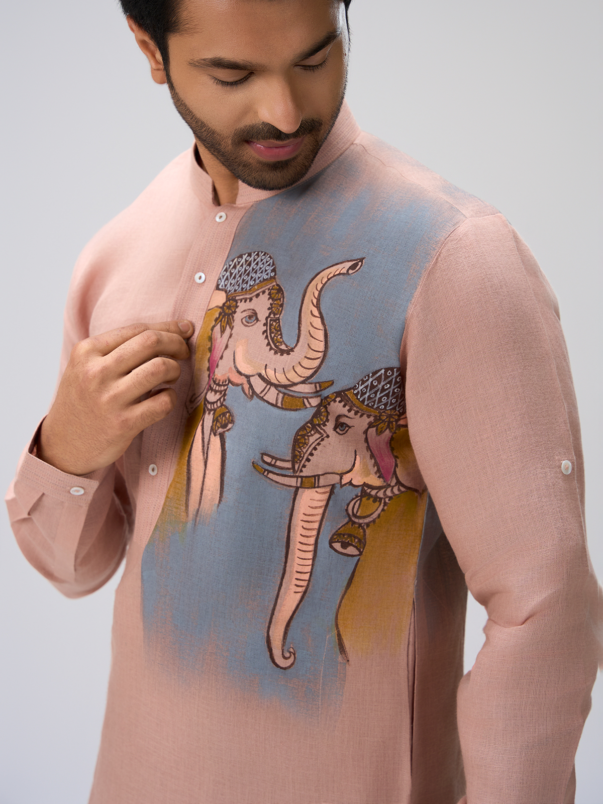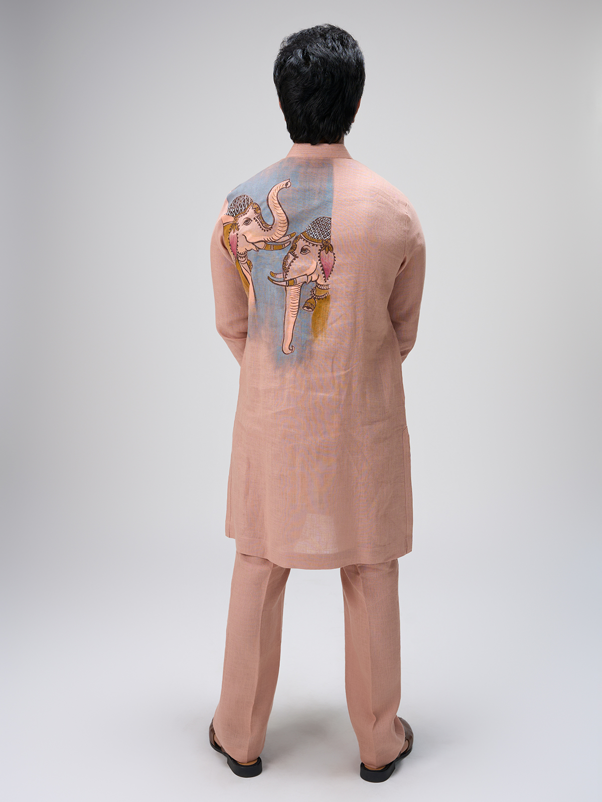 Crafted in peach linen, this kurta highlights an elephant painting that adds warm traditional artistry. The chinese collar offers a refined shape suited for festive and sangeet celebrations. The pant brings comfort along with a graceful finish.